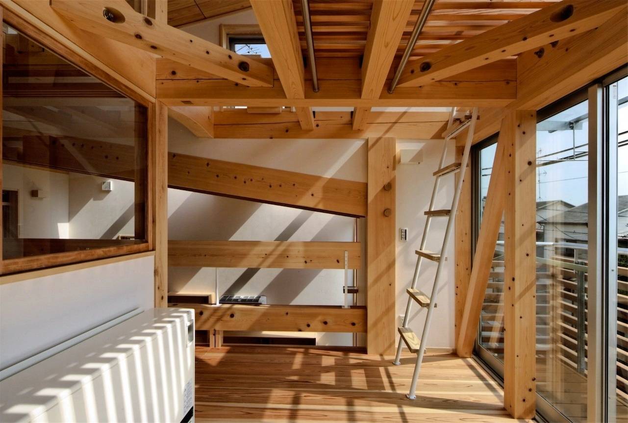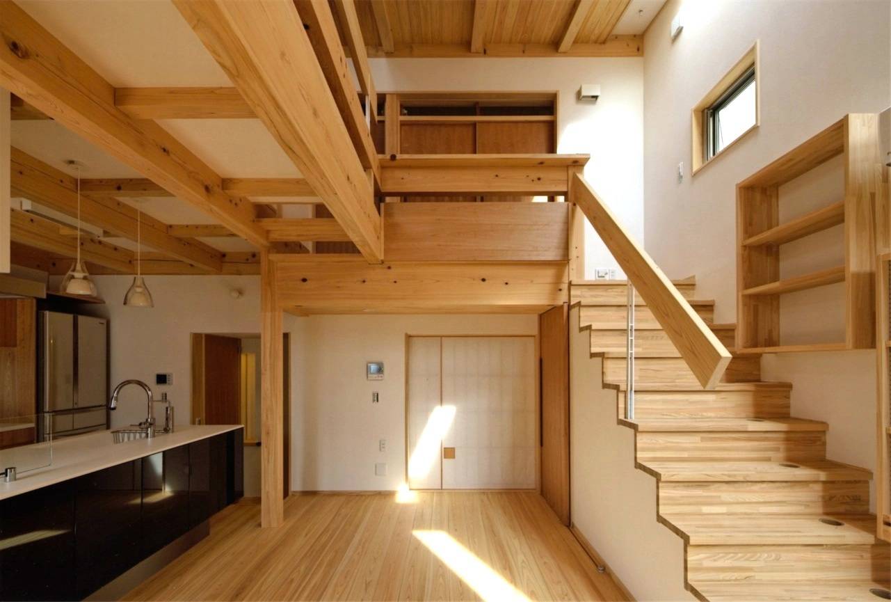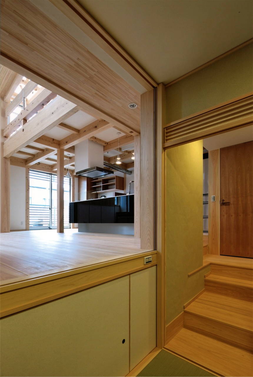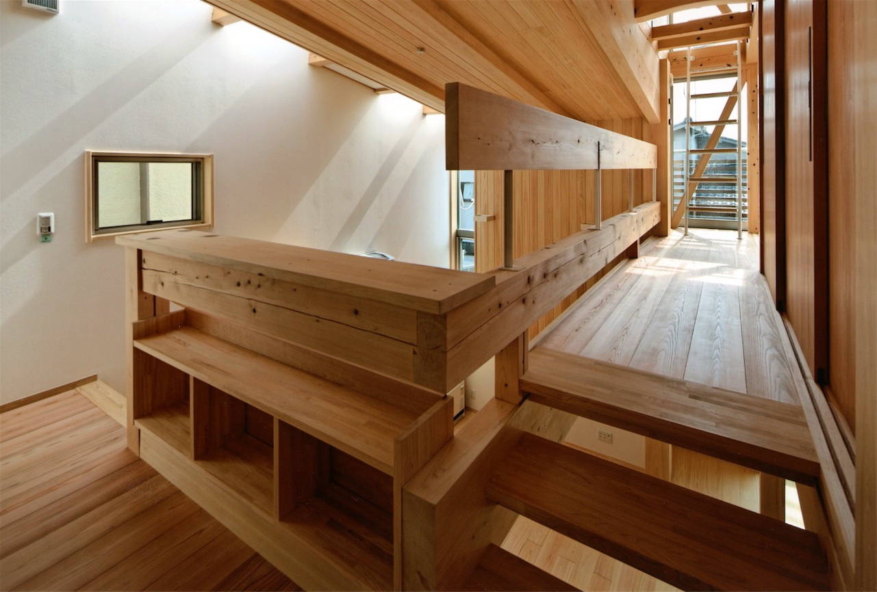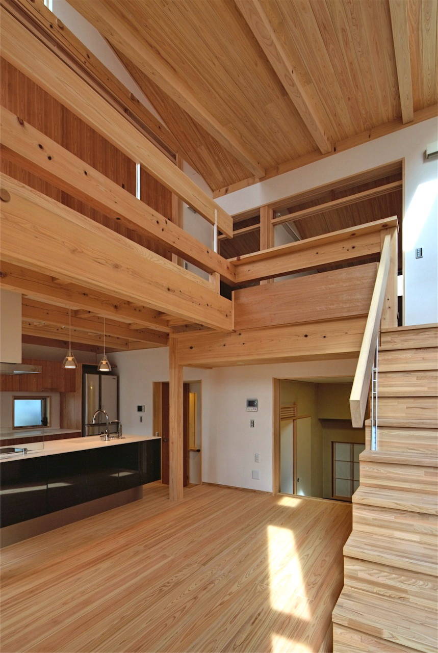 構造は兵庫県産の総ヒノキ造り。造作においても奈良吉野のヒノキとスギが使われ、とても贅沢に仕上がっています。内部空間は落差のあった敷地を利用してスキップ的な断面計画とし、かつ構造材を出来るだけ現した事で木質の落ち着いた内装でありながら見た目以上にダイナミックな雰囲気です。