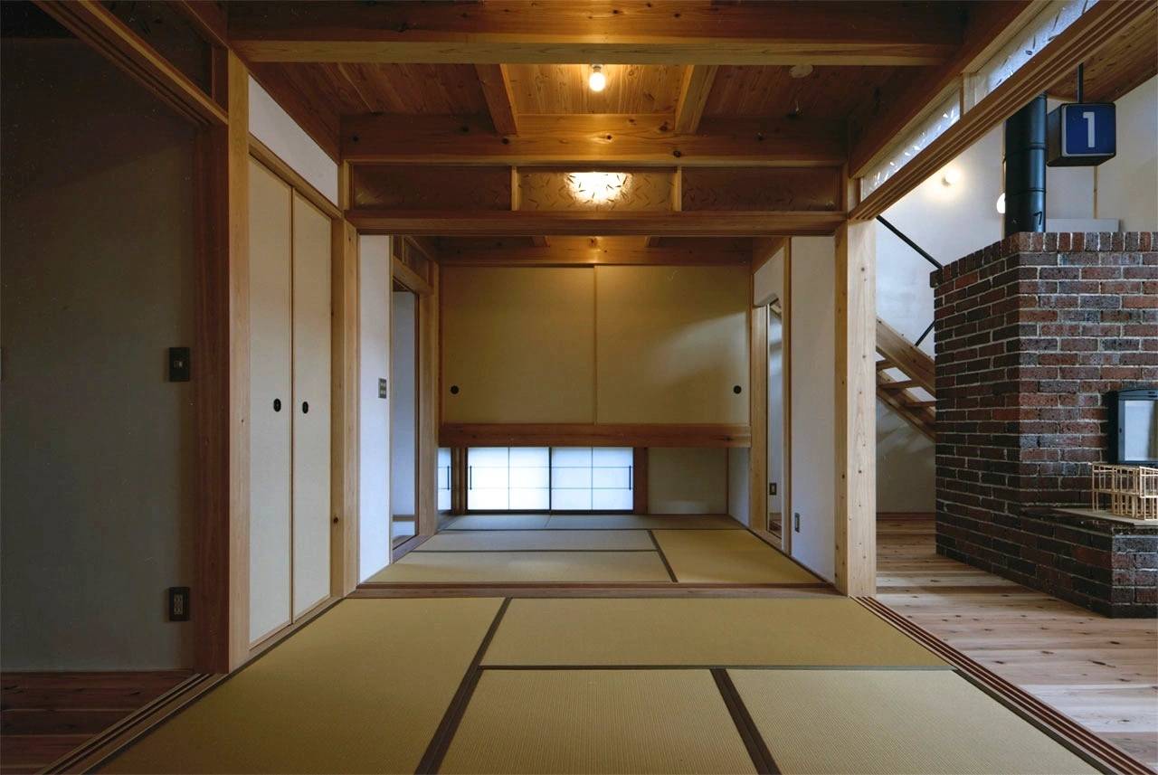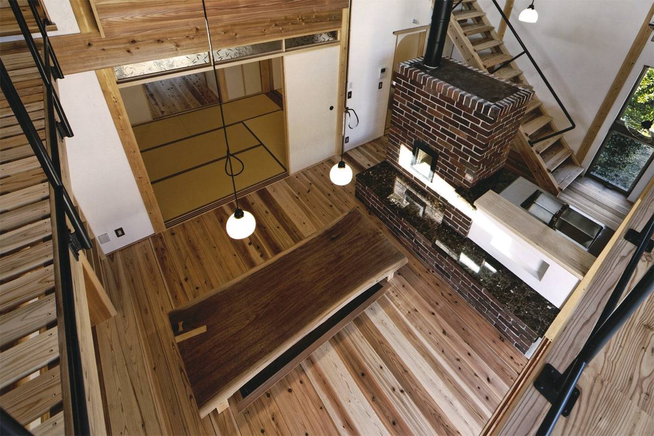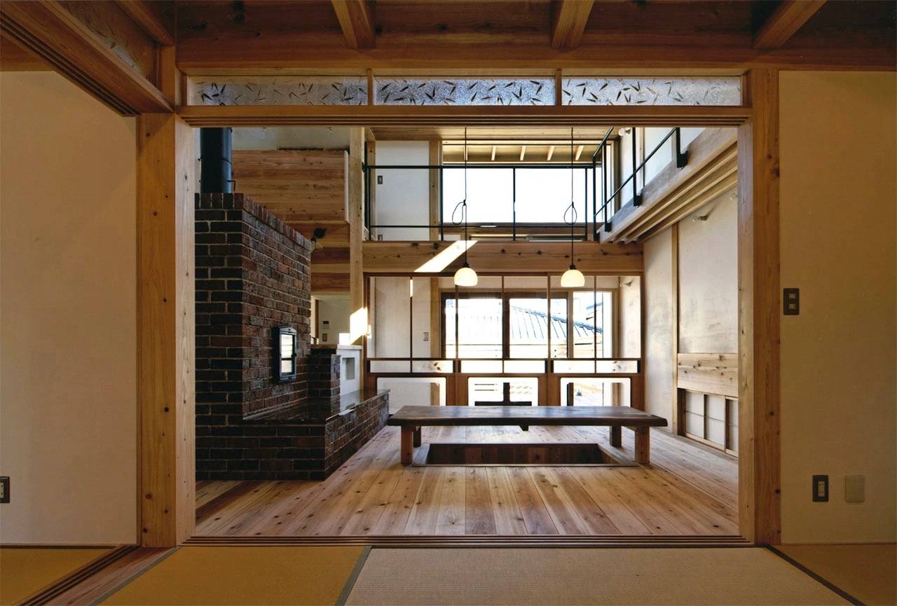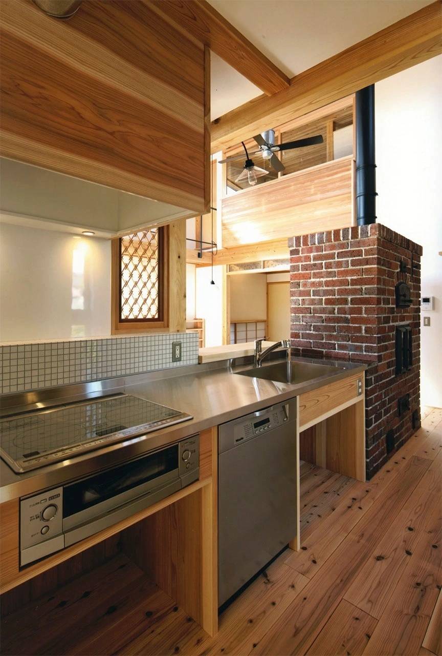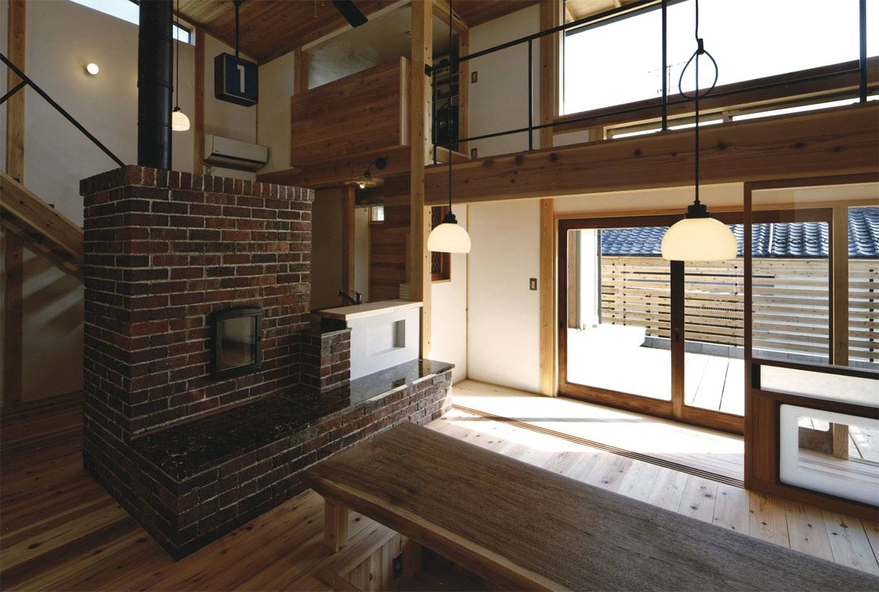 新しく建てる住まいでは、自分たち家族の生活を圧迫されないようにしながらも親類縁者の集まれる場所もつくること、2階の窓からかすかに見えていた琵琶湖の花火大会を望みたいこと、そして大きなレンガ積みの蓄熱式薪ストーブを据えることが計画の主な要件となっています。また、施主さんのご趣味をふまえたアイテムを散りばめています。