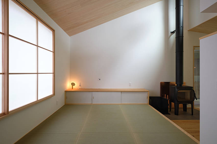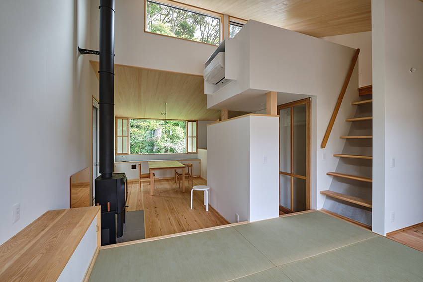 北側の森の近くにはダイニング、キッチン、インナーバルコニーを配置し、南側には小上がりの畳スペースと書斎があります。それをつなぐ場所には薪ストーブを置きました。小上がりに腰をかけたり、ダイニングスペースからそれぞれの居場所から炎の温かさを感じることができます。