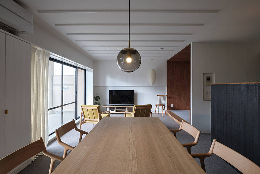 家族5人のためのマンション改修です。南側に大きく開けた中住戸の区画。南の窓からはふんだんに光が入り、緑道が望めます。