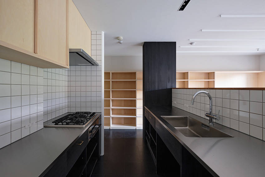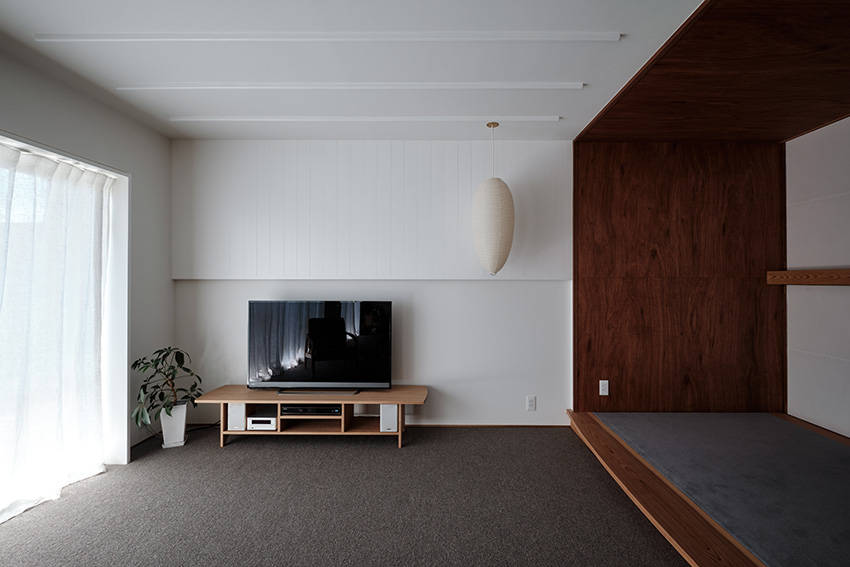 キッチンとダイニングにはオープンの大容量の壁面収納を設え、食品庫、絵本やピアノなどが置かれます。回遊できるキッチンには粗く挽いた桧板を張り、黒く着色しています。光を受け止め凹凸感のある表情を出しています。床には防音の観点やクッション性の良さから堀田カーペットのウールカーペットを敷いてきます。和室だった部分は小上がりのフリースペースとしました。