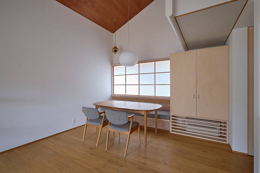 吹抜けは家族それぞれの居場所を感じ、スピーカーの音を響かせます。また空調の冷気、暖気を運ぶ通路となり、家の中央に設けた循環ファンにより家全体の各場所の温度差を均しています。これによりエアコン2台で全体の熱環境を整えることにも成功しています。