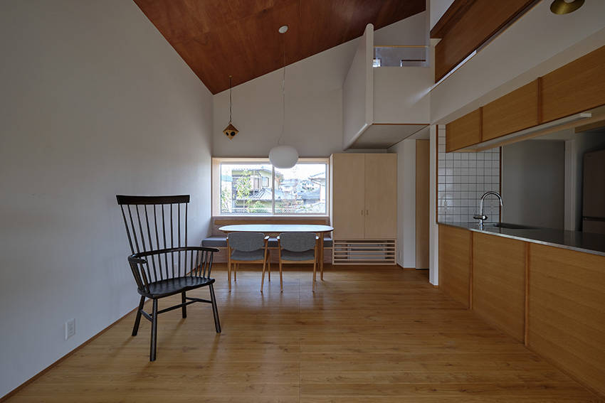 おおらかな屋根を架け、屋根形状はそのまま内部に表れます。天井にはラワンベニヤを張り、落ち着きのある空間としています。