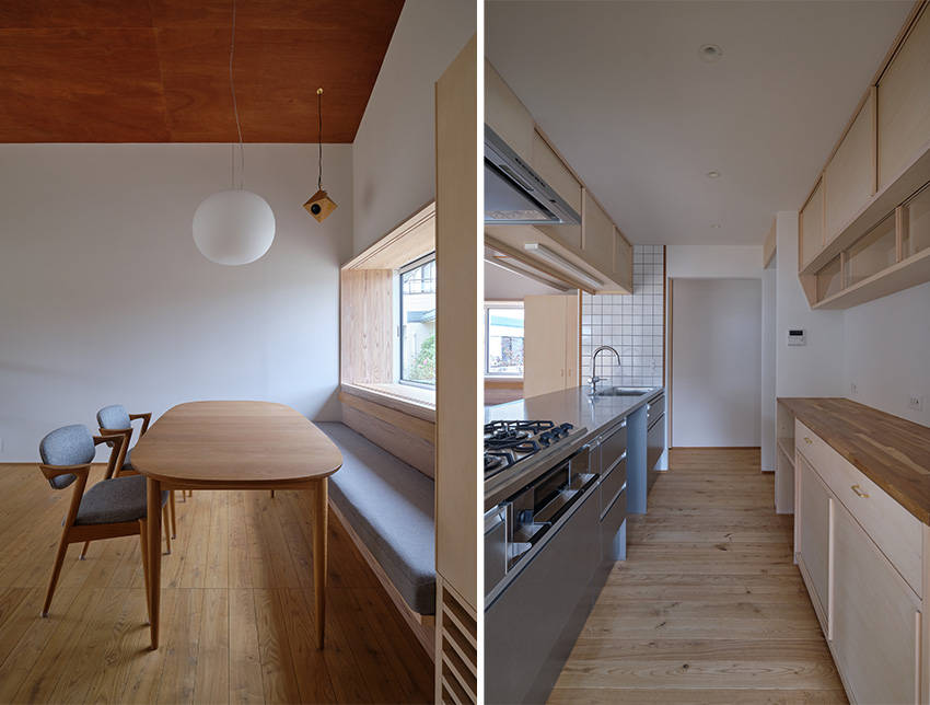 キッチン横に設けた少し大きな廊下のような空間はワークスペースや物干し場となり、リビング・ダイニングの導入部の余白のある空間としています。