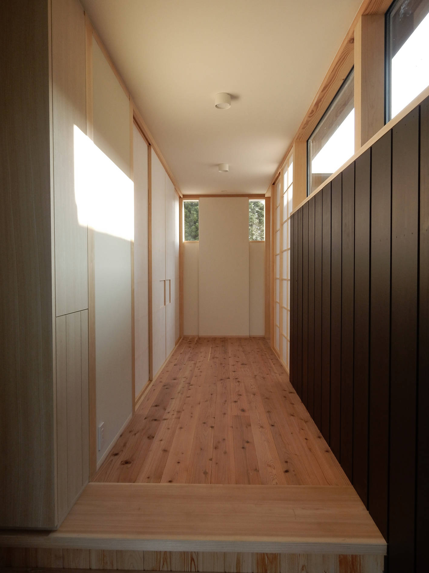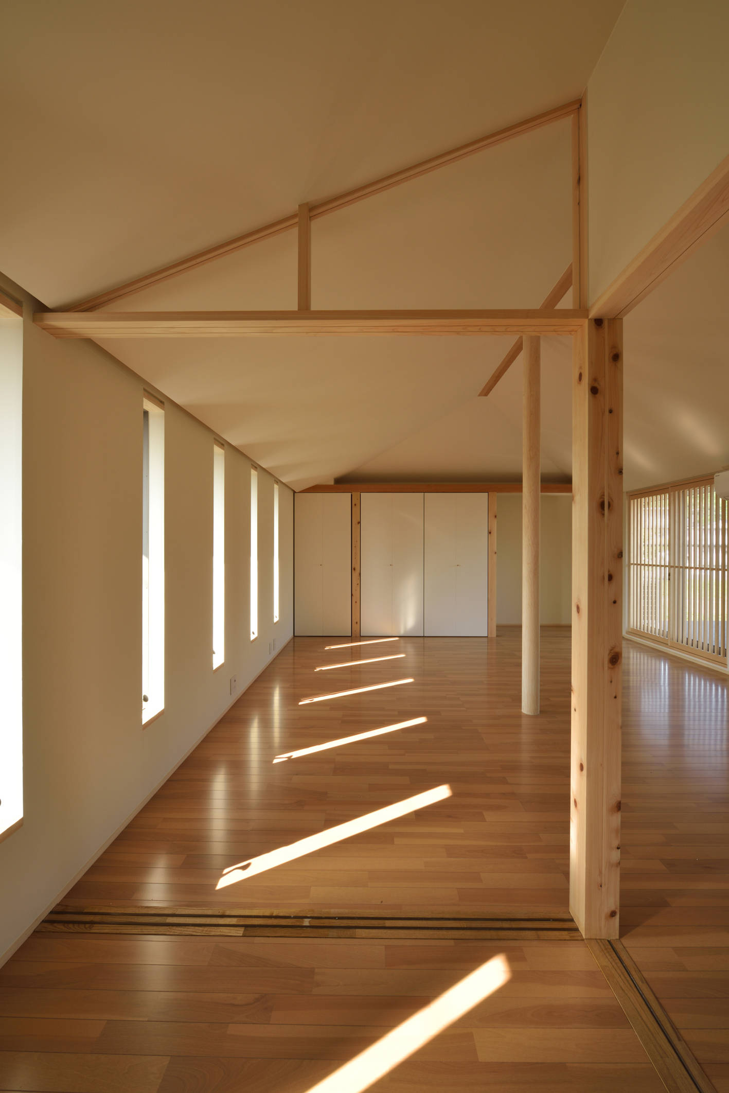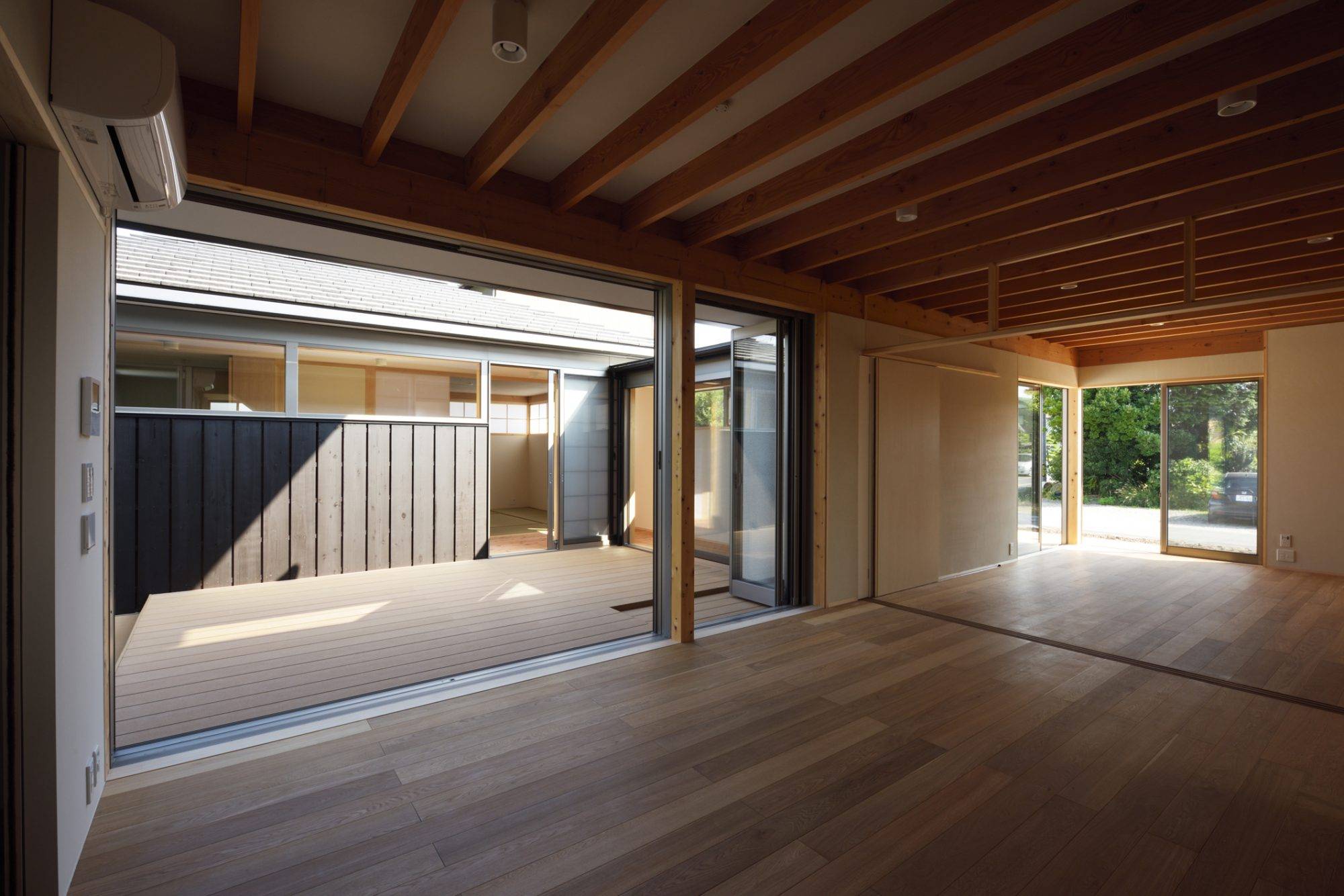 本屋と離れがある構成とし、離れは客人をもてなすための空間となっている。離れから中庭に沿って流れるように本屋へと入り、奥へ行くほどプライベート性が明確になる。本屋のリビングは中庭とつながり、内外部を連続的にしている。家族で経営するサービス業で地域と濃厚なつながりを持ち続ける施主にとって、中庭は周囲の喧騒から一旦離れられる場となっている。