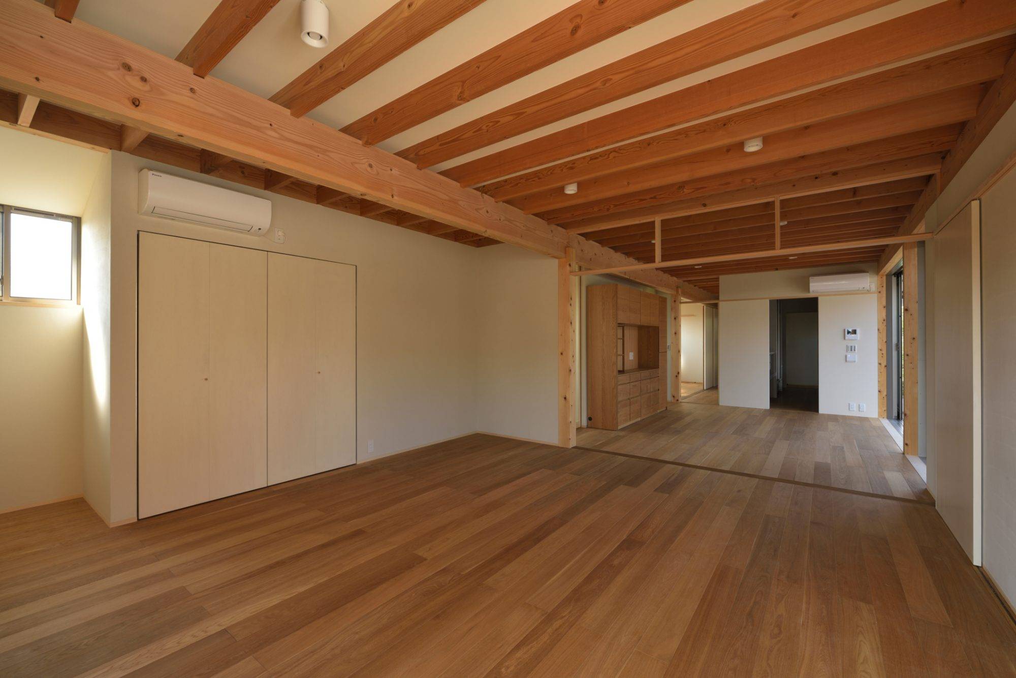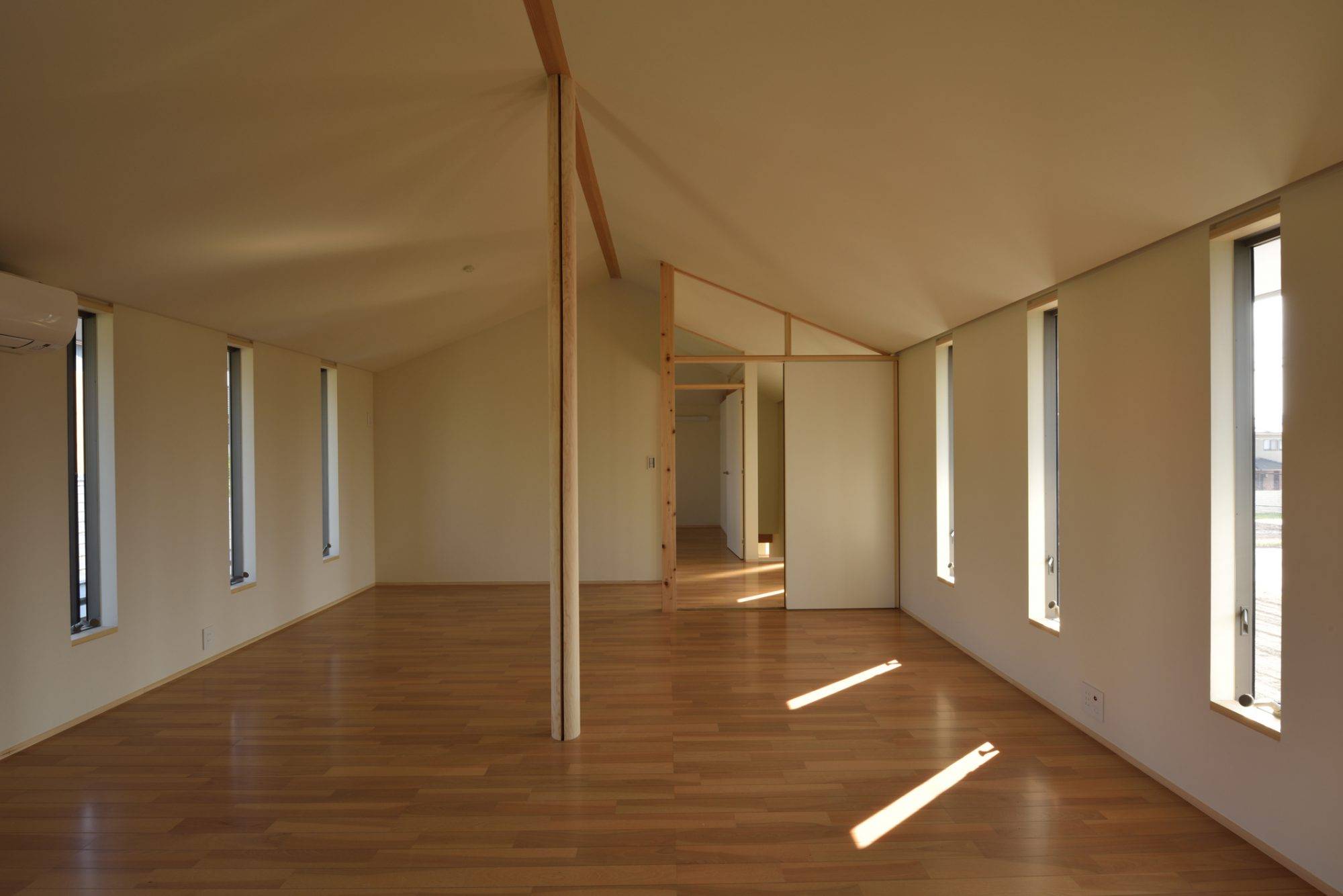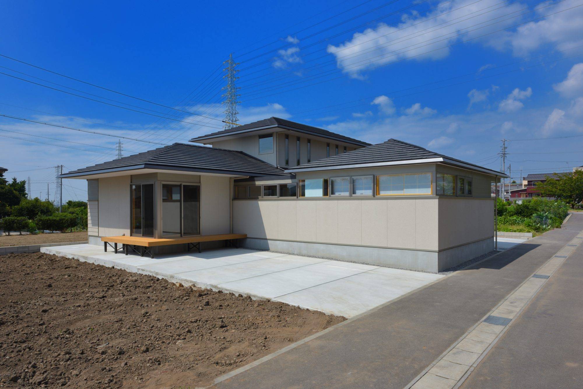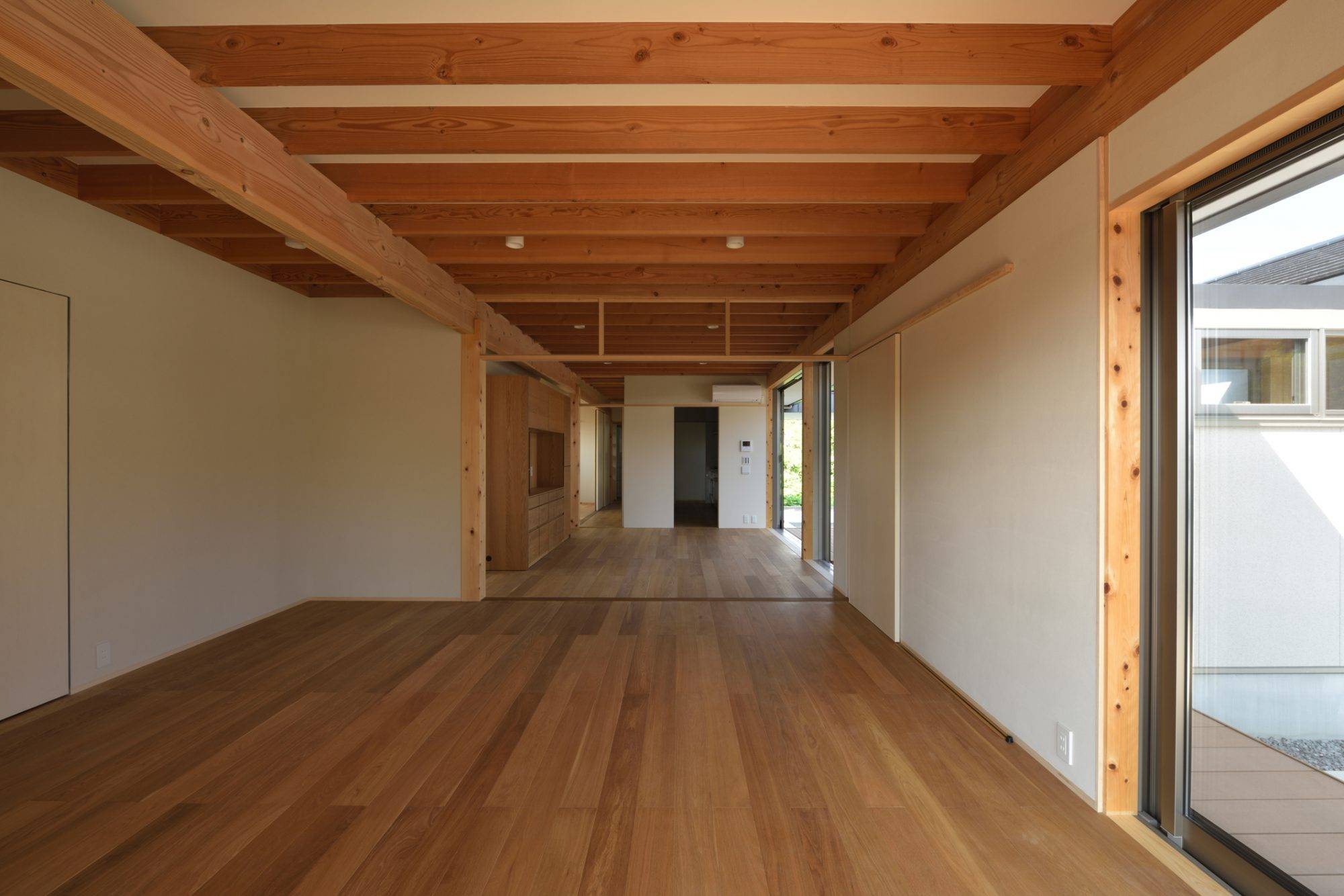 本屋と離れがある構成とし、離れは客人をもてなすための空間となっている。離れから中庭に沿って流れるように本屋へと入り、奥へ行くほどプライベート性が明確になる。本屋のリビングは中庭とつながり、内外部を連続的にしている。家族で経営するサービス業で地域と濃厚なつながりを持ち続ける施主にとって、中庭は周囲の喧騒から一旦離れられる場となっている。