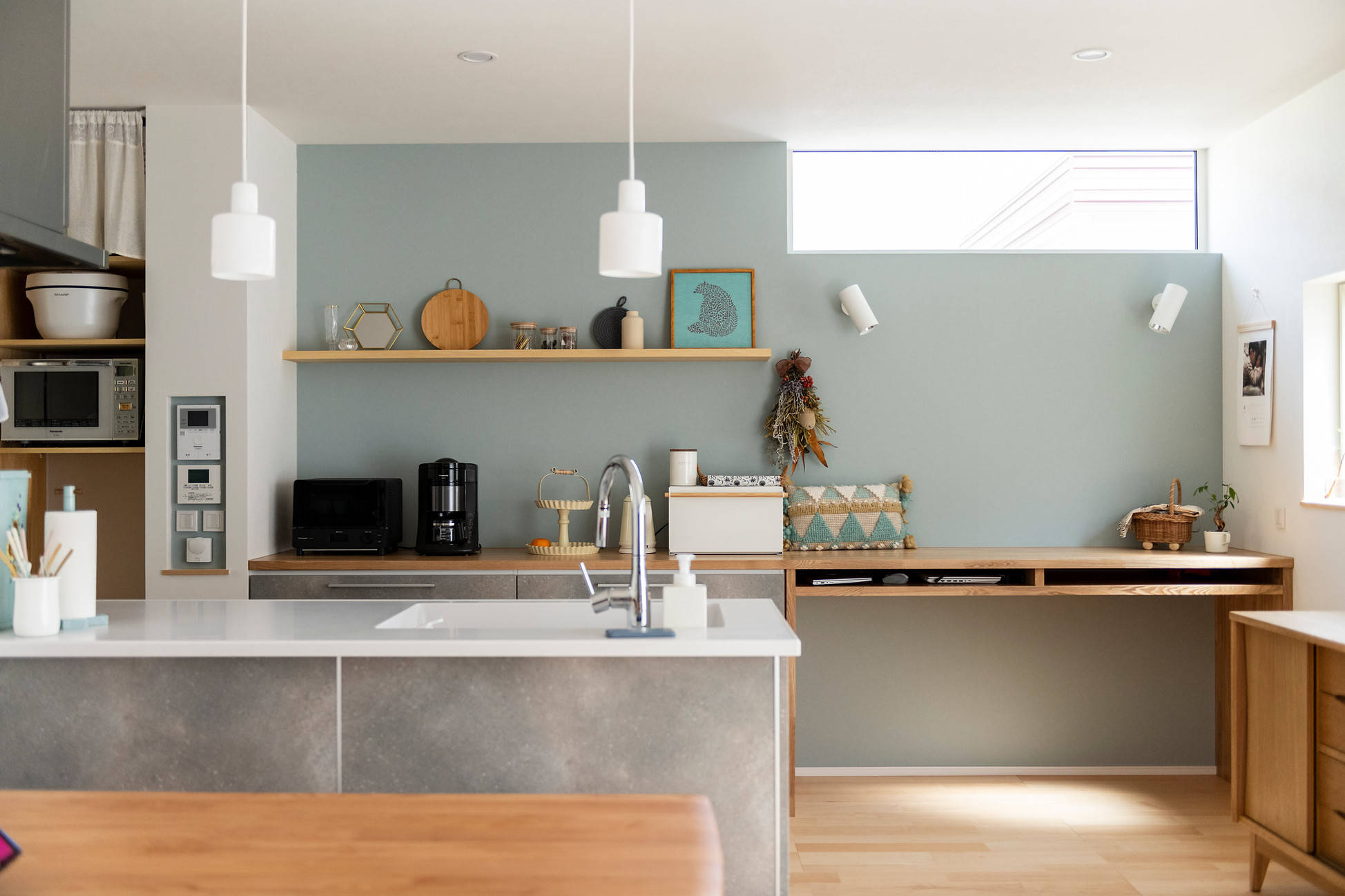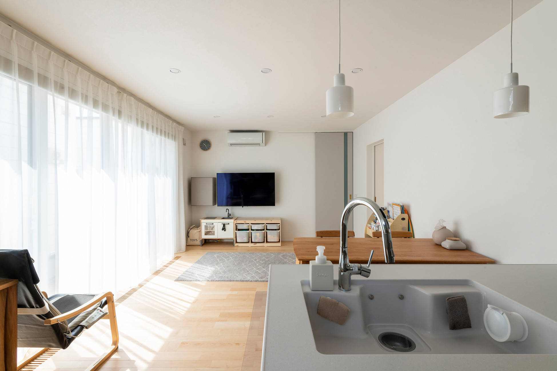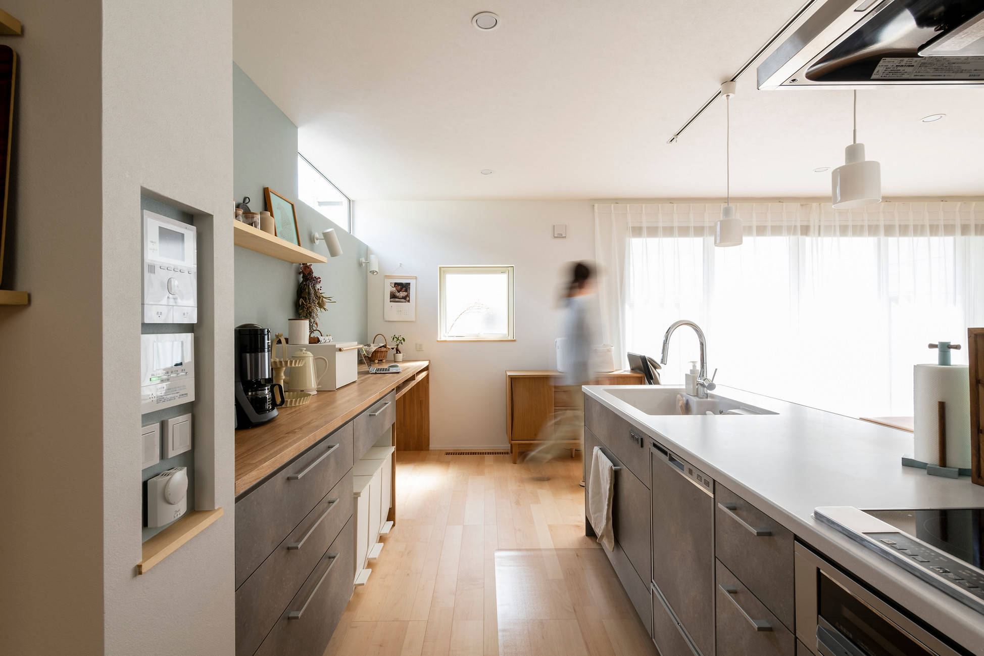 在宅ワークと育児・家事スペースが重なり合いながらも干渉の少ない動線計画となった。