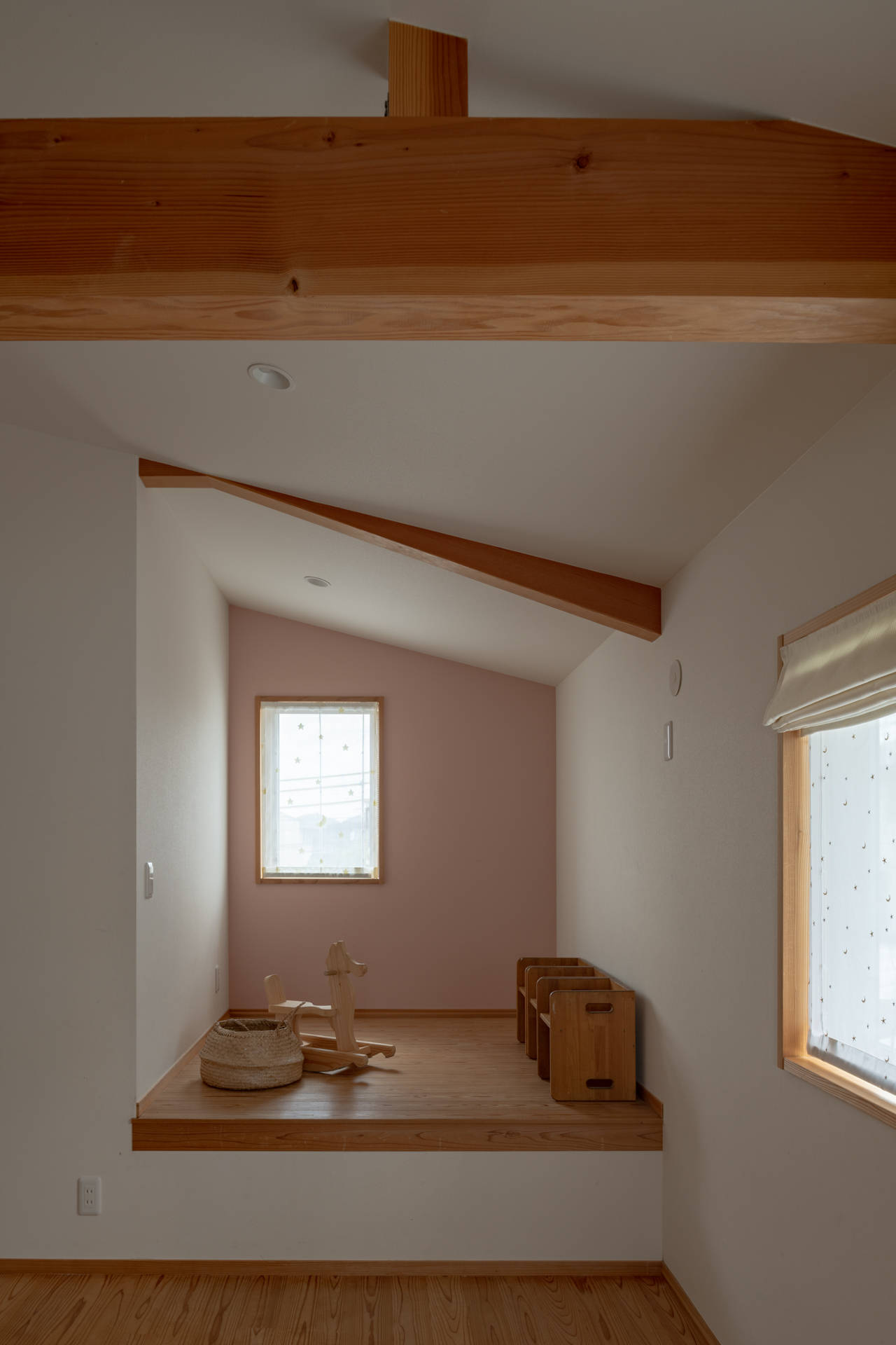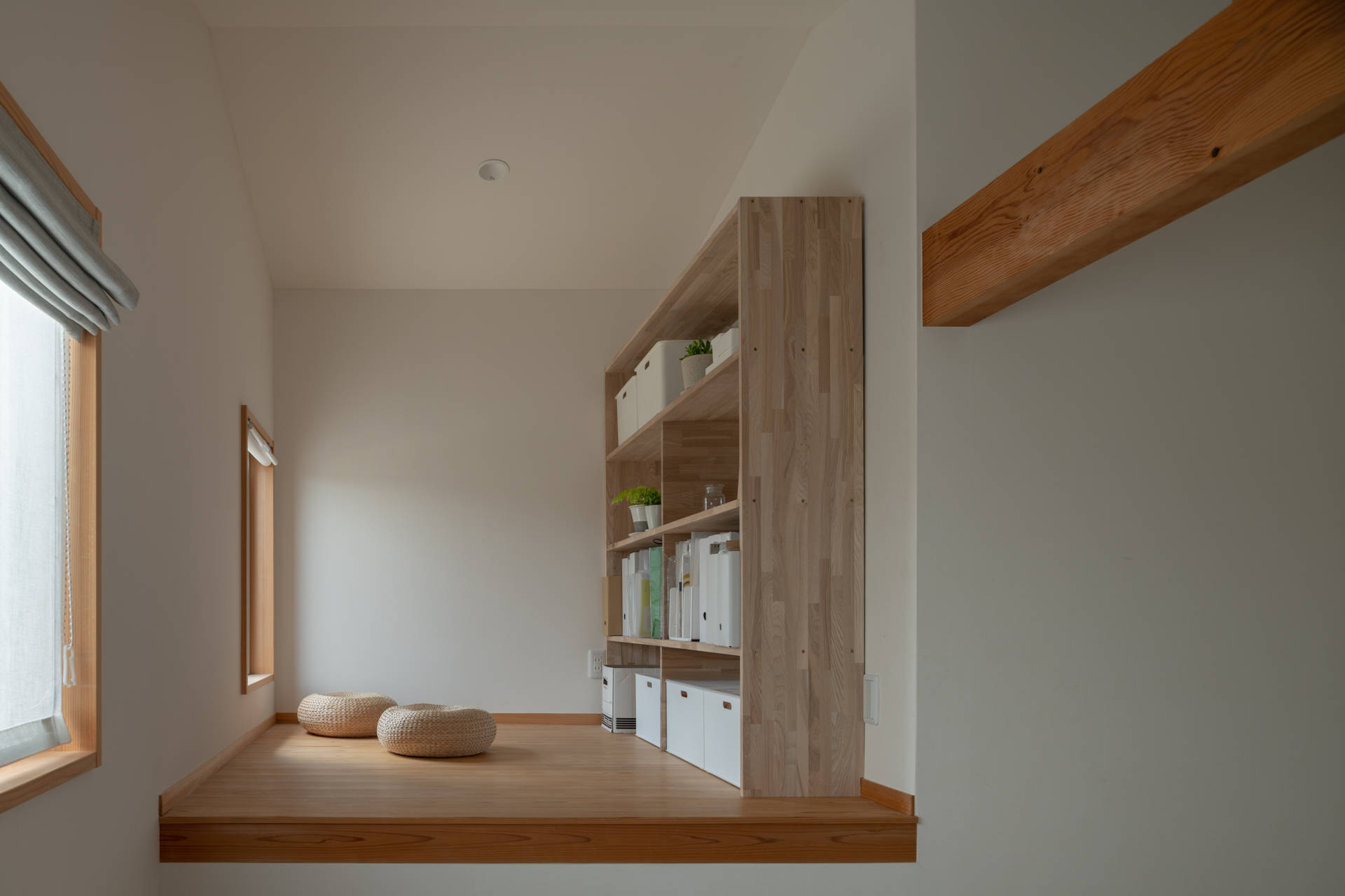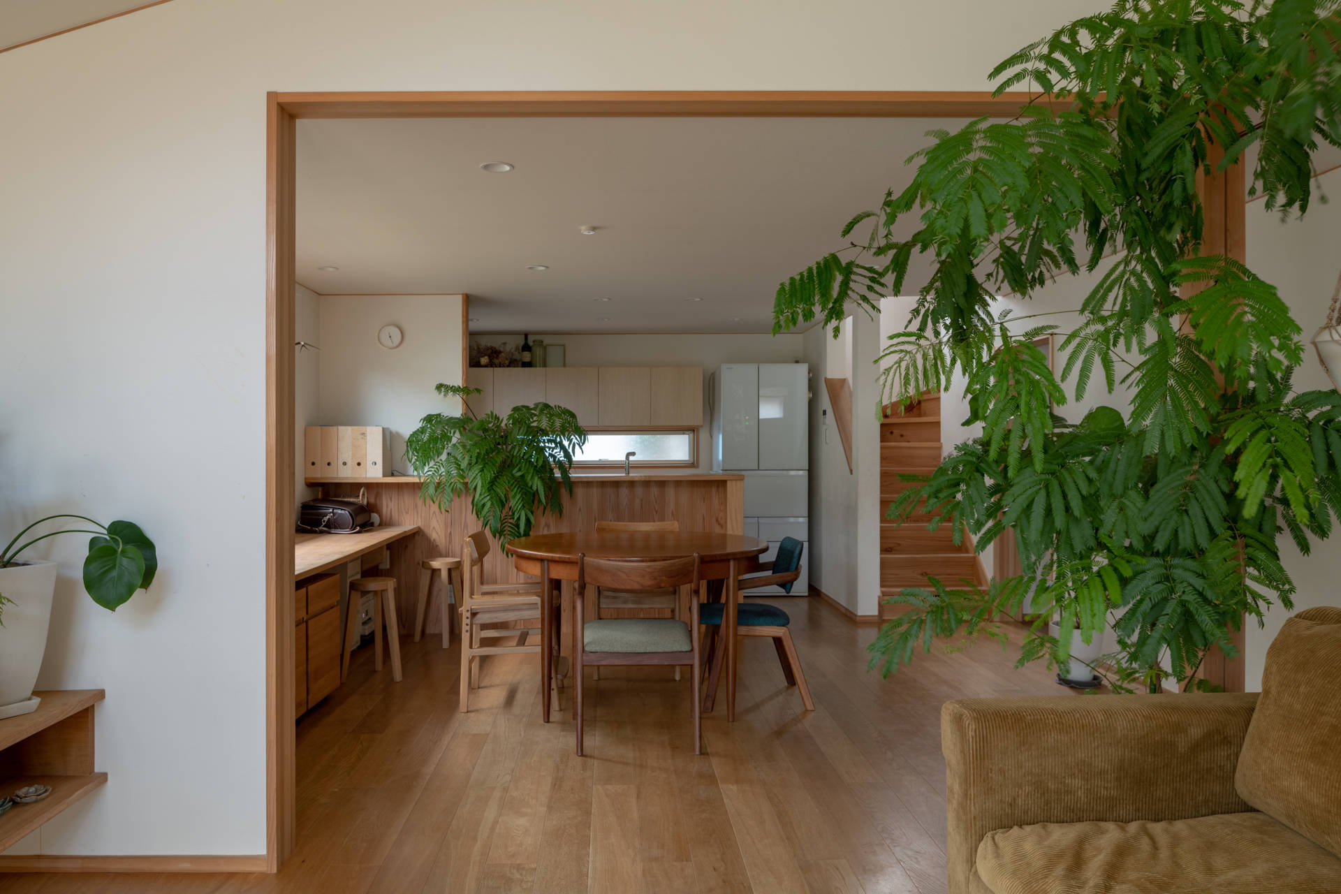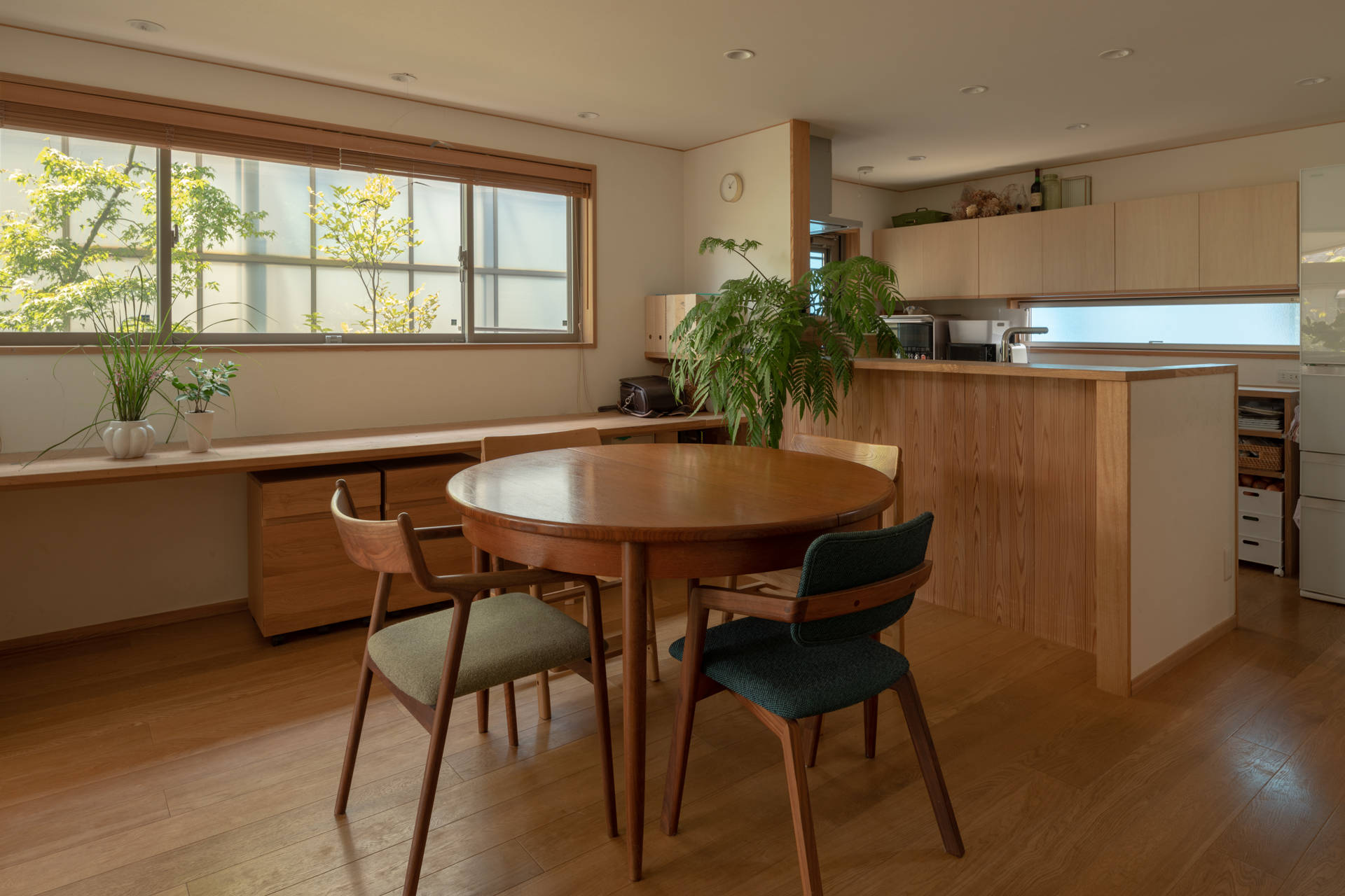街並みに圧迫感をあたえないよう、二階部分をセットバックさせ、道路からは平家に近い印象をあたえるように計画しました。1階のリビングの勾配天井とダイニングキッチンの低めにおさえた天井で空間に強弱をつけています。photo:表 恒匡