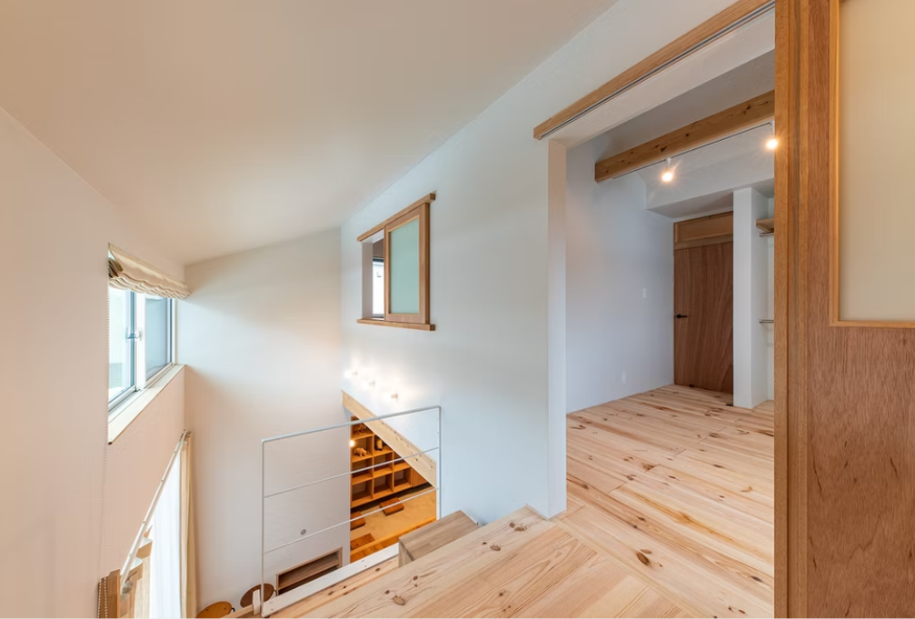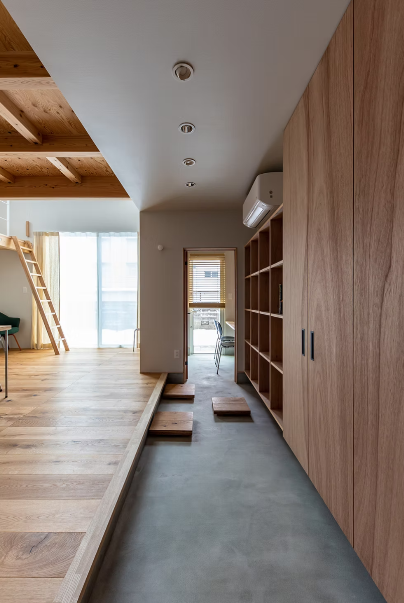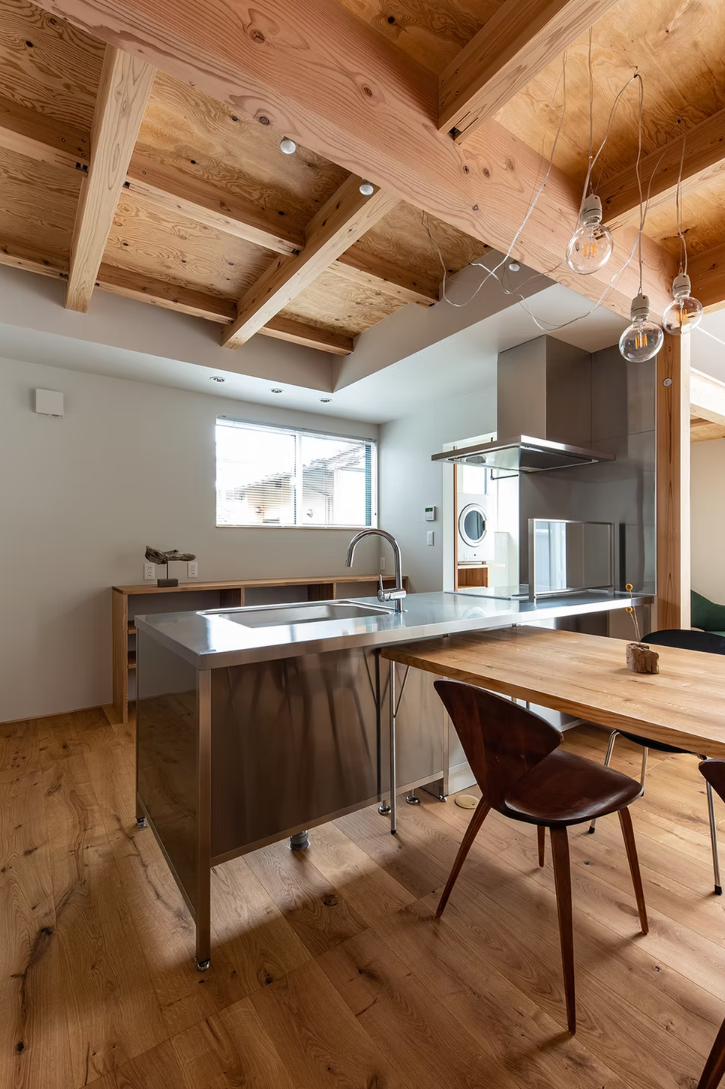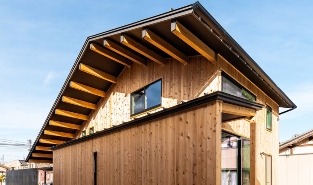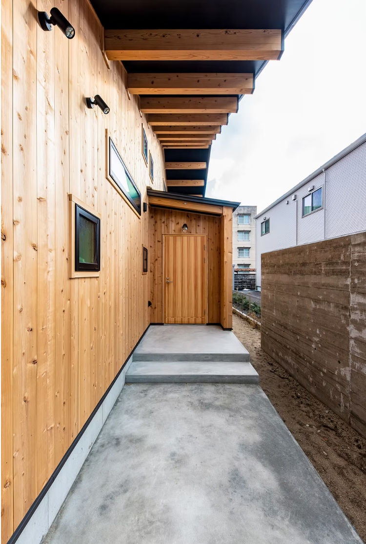 地方の主要駅より2kmくらいに位置し、木造住宅やアパートが立ち並ぶ場所に、夫婦と子供3人の5人が暮らす木造住宅を計画しました。この場所は昭和30年以降に住宅地として急速に発展した地域で、古い建物が多いけれど利便性が良いことから土地が空くと新しい住宅やアパートが建ち、街はゆるやかに新陳代謝しています。