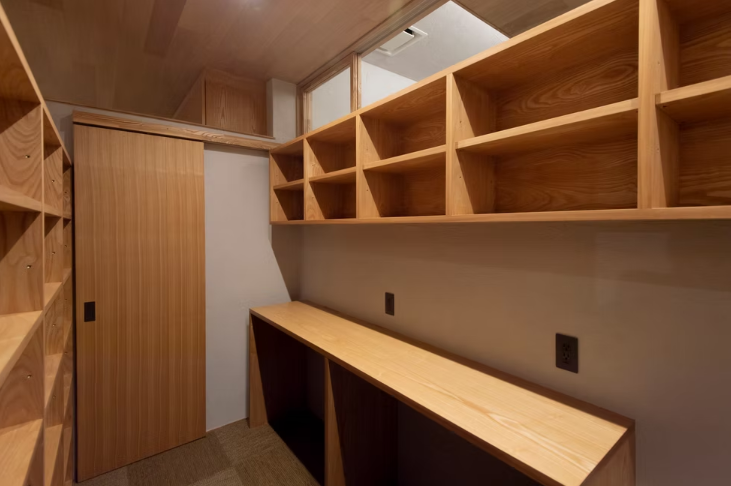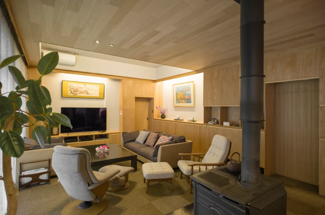 改修対象部分と改修しない部分を断熱的に区画し、改修部は設置する薪ストーブの熱が循環するように一つの大きなつながった空間としています。外周部は断熱材を追加するために壁を2重にして、部屋間は造作の家具で壁面をつくり、天井は構造体をあらわしたい気持ちをグッとこらえて断熱材を充填しています。