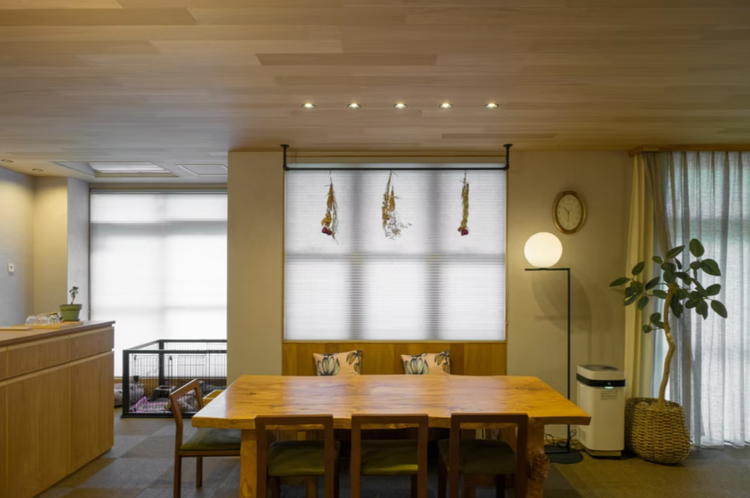 家族にかわいい犬が2ひきいるため、床材は滑らず、腰に負担にならない、排泄時に失敗してしまっても心労にならない人工的なサイザルのような素材にしています。