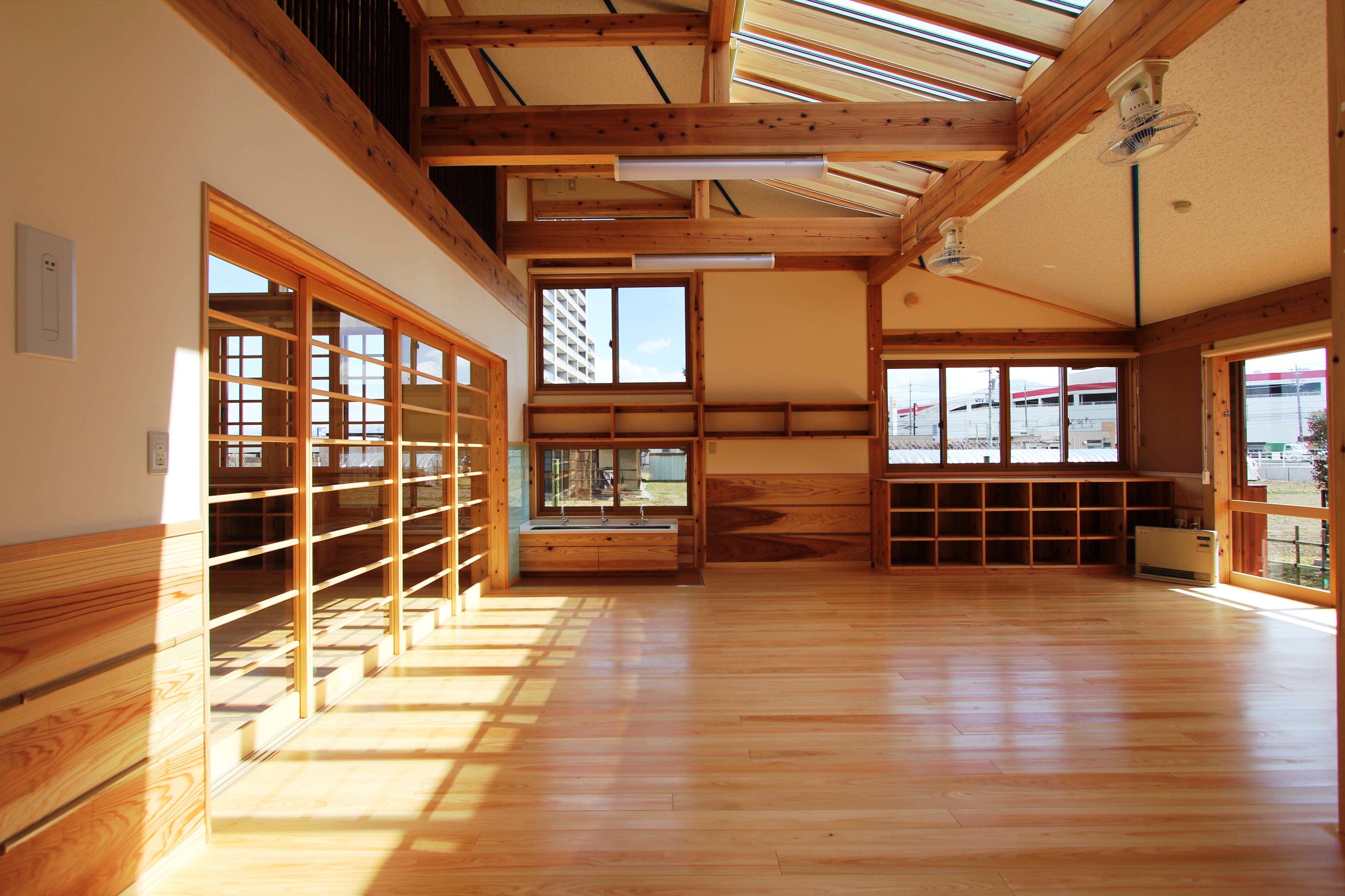 長野市にある民間保育園。「子供たちに太陽と土と水を」をモットーに伸びやかに過ごせる木の保育園を作ってみました。合板ゼロ、国産材で作った木の保育園です。