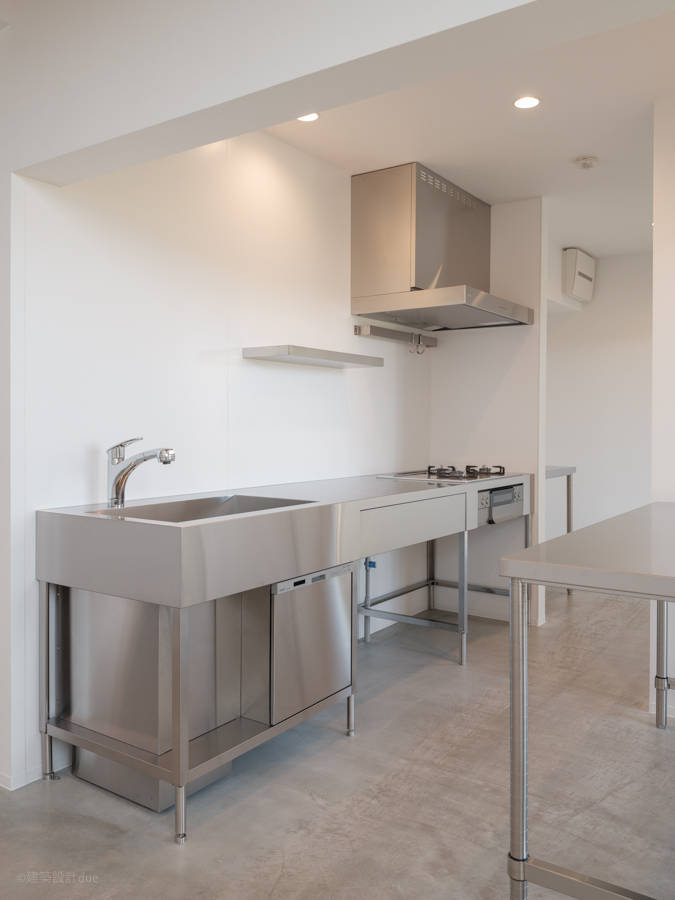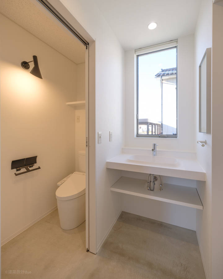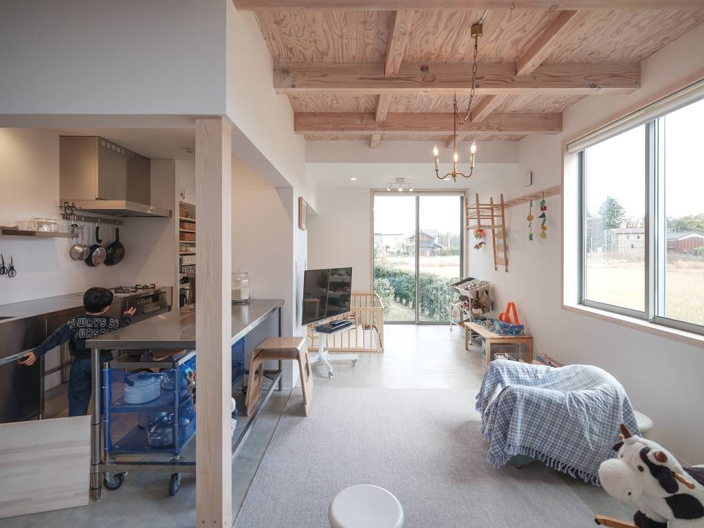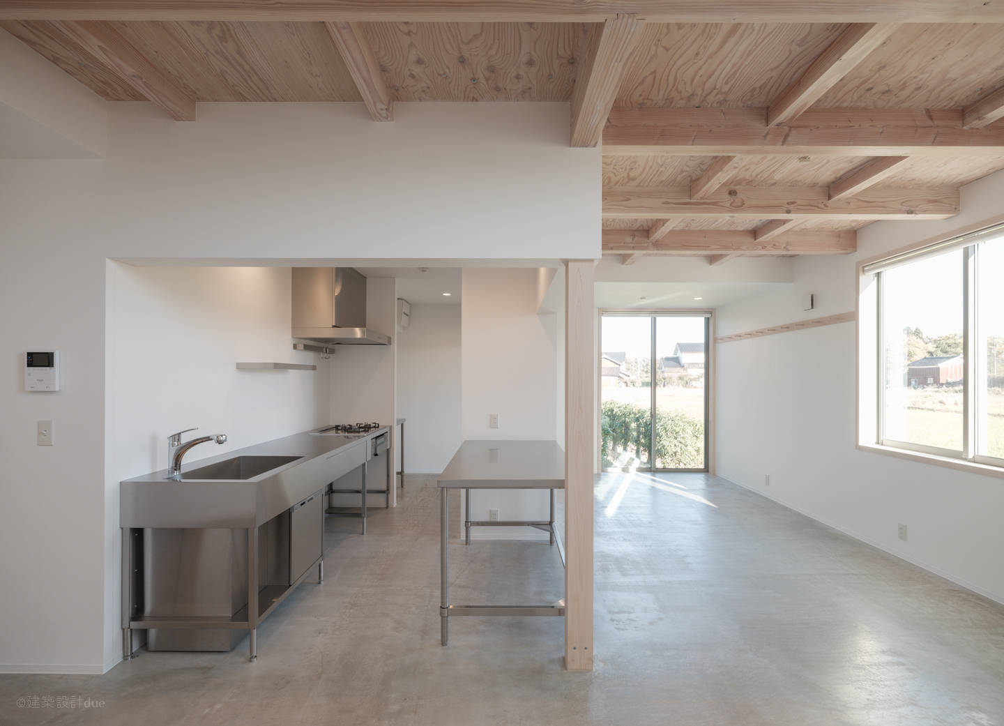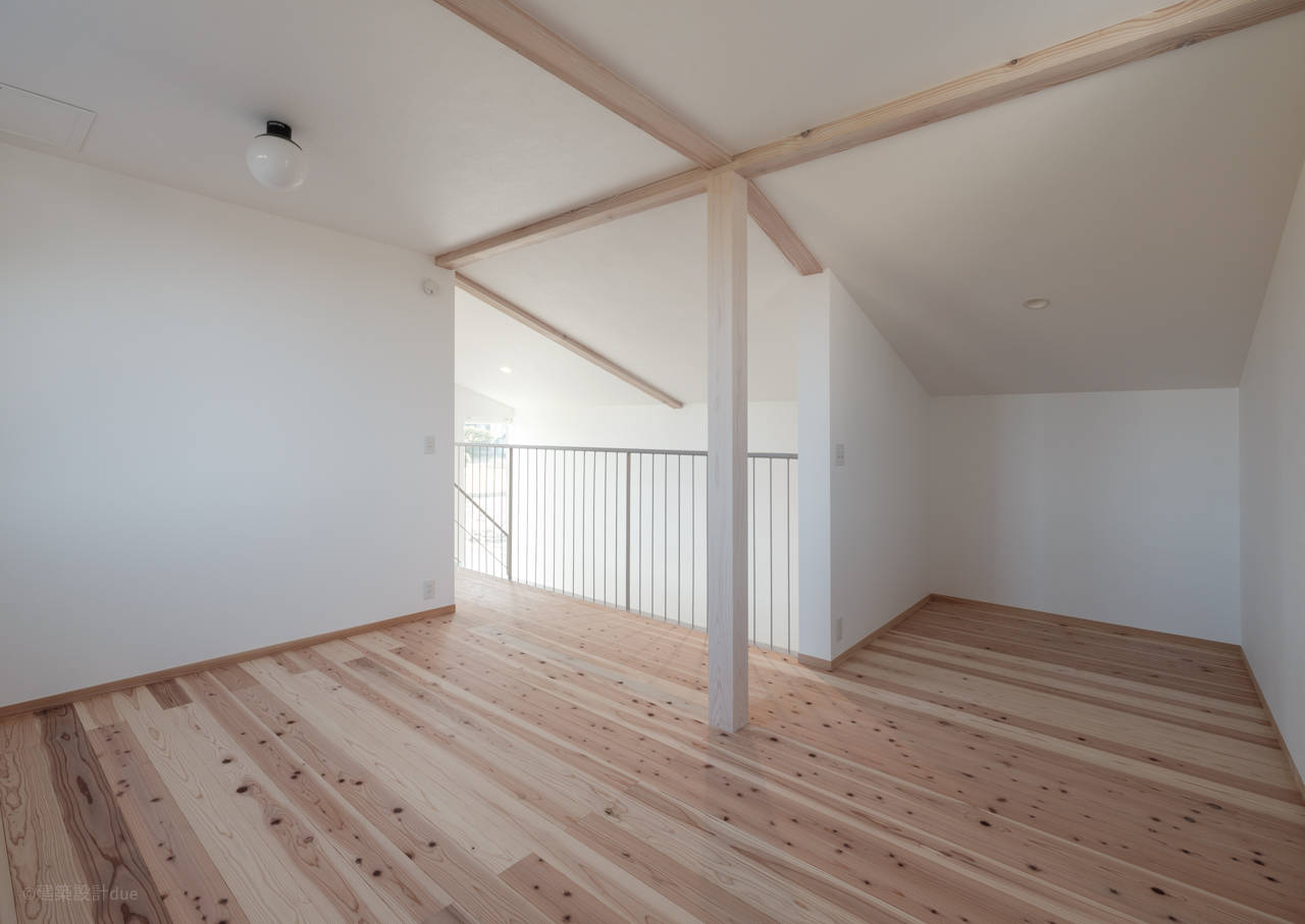 吹き抜けとシェーカーペグのある土間コンクリート床の家