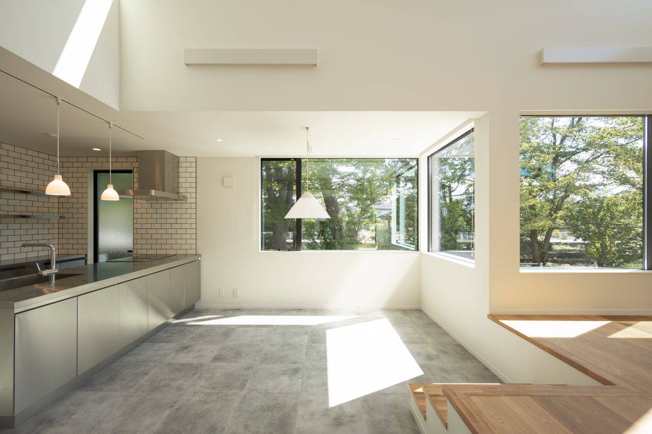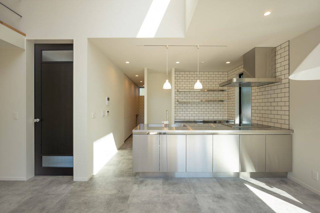 土間床とコの字型キッチンのある白い平屋の家 木造