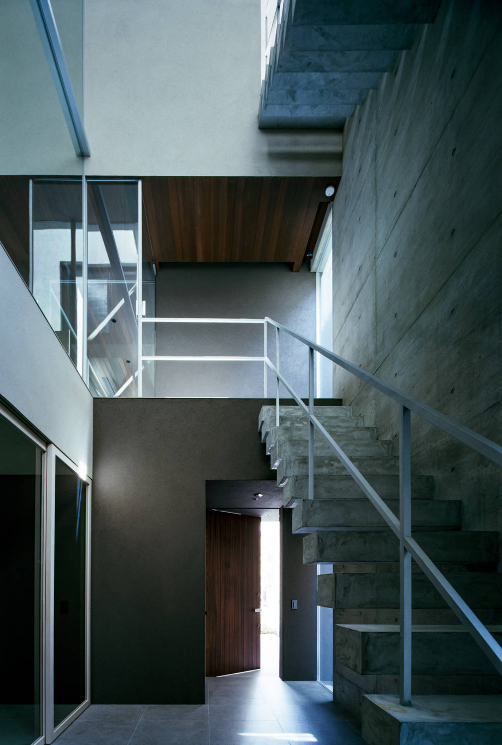 長い植栽があるアプローチから建物に入り、1階から3階へ抜ける吹き抜けには、RCの壁とその壁から片持ちで階段があります。