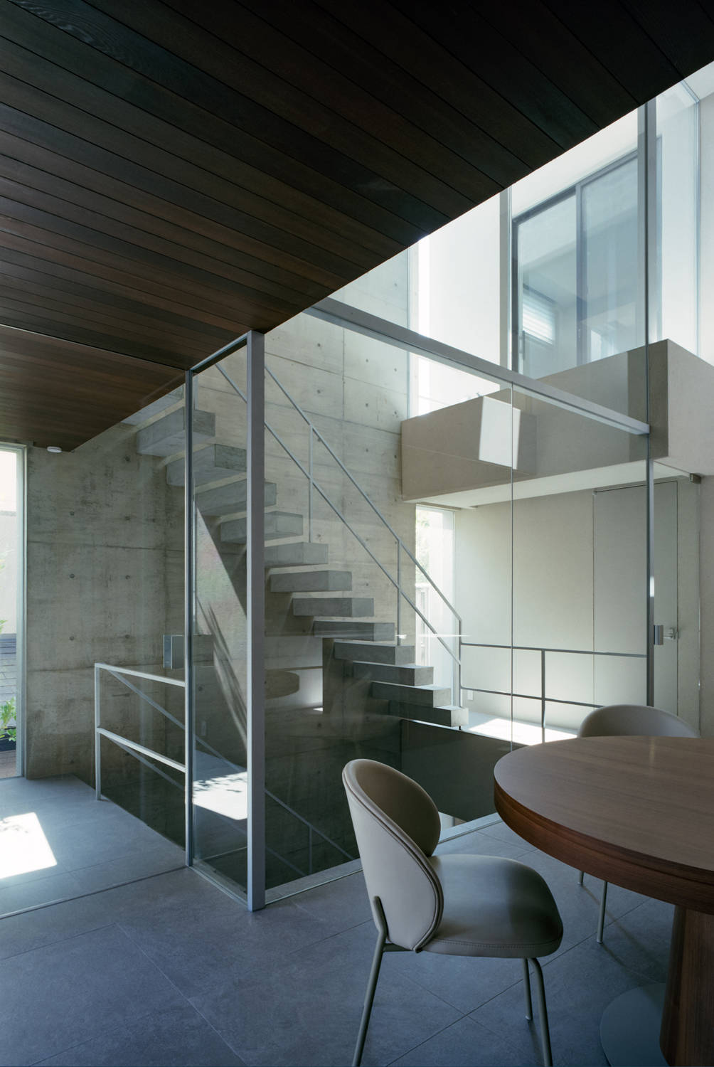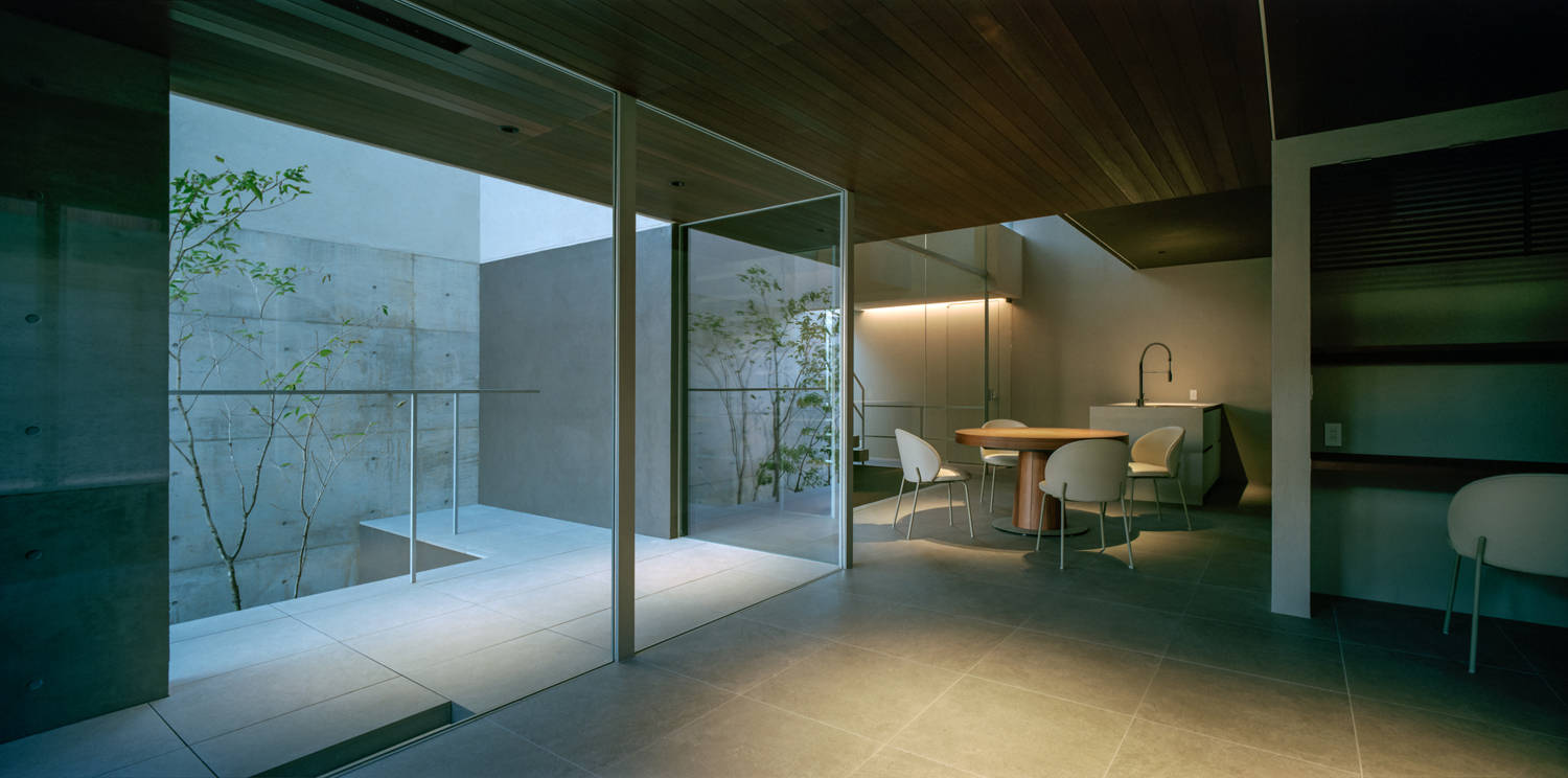 建物は周辺に対して閉ざしながらも、ガラス、コンクリート、吹付けなど、
