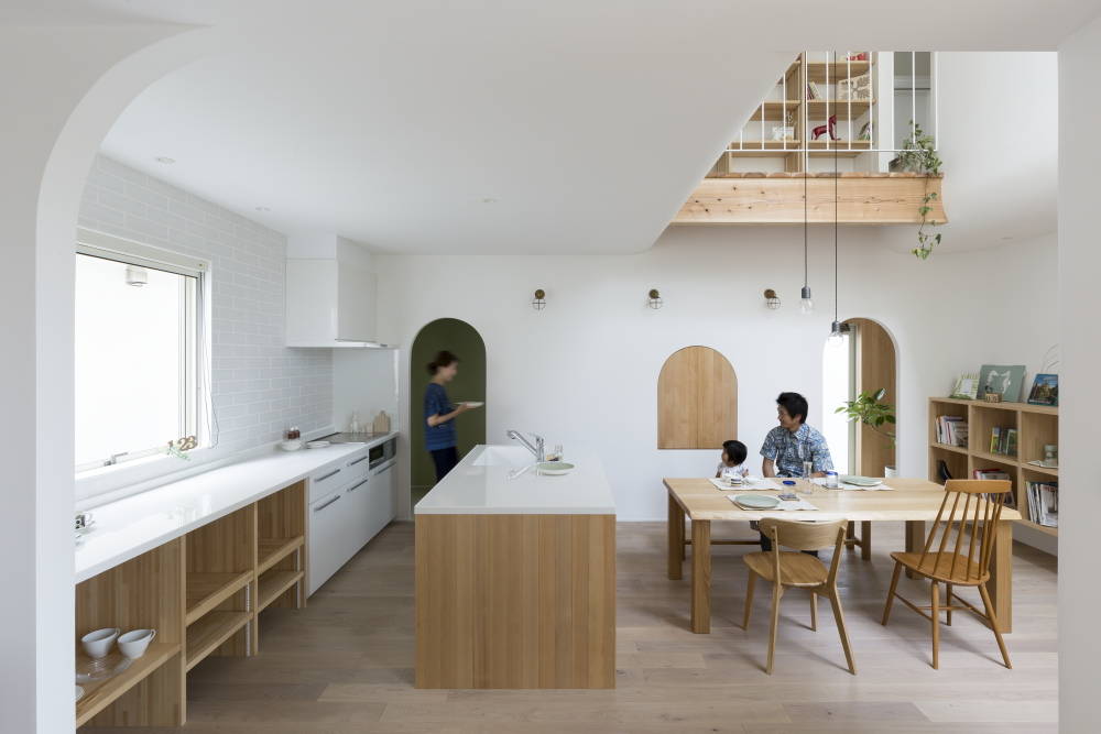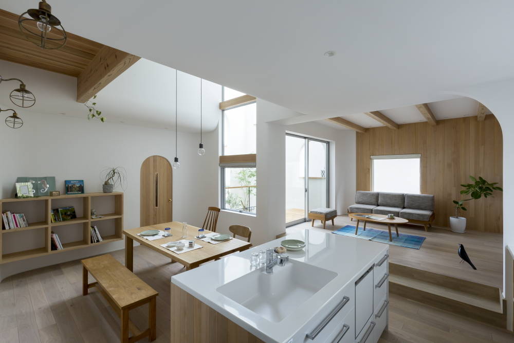 新しく建ち並んだ分譲地にひっそりとたたずむ建物は、時間と共に変化する光とアクセントの曲線がふれあうことで独特な陰影をつくりだし、アーチ型の開口をくぐり抜ければ、非日常空間へと導いてくれることでしょう。