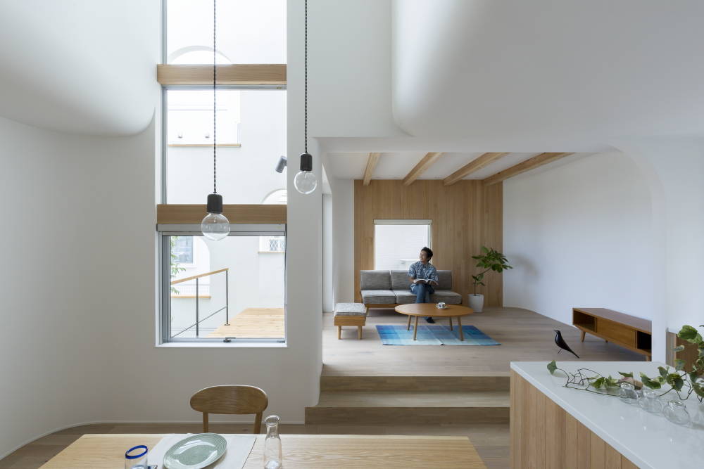 入隅や出隅などに曲線を用い、縦に伸びた大開口窓から差し込む光は、空間をやわらかく包み込んでくれます。