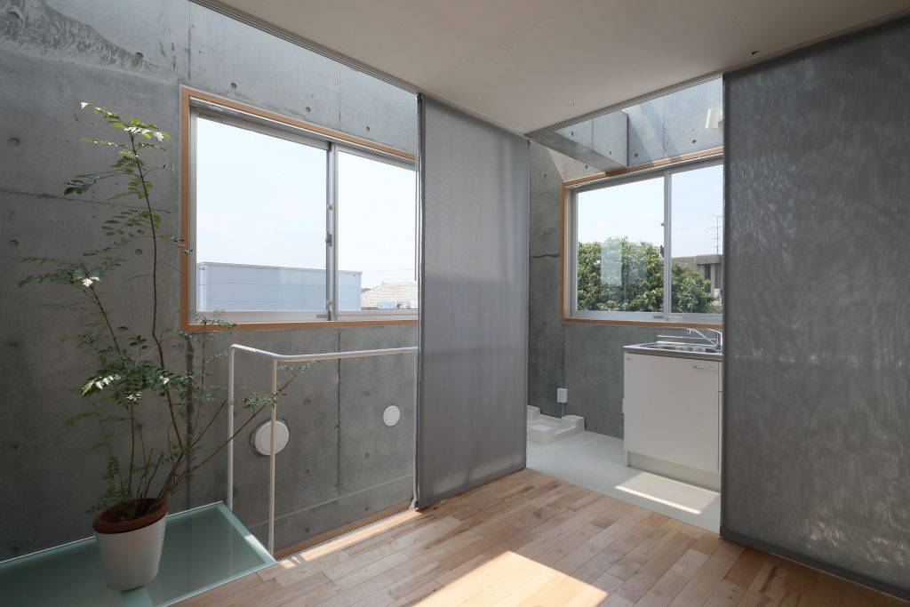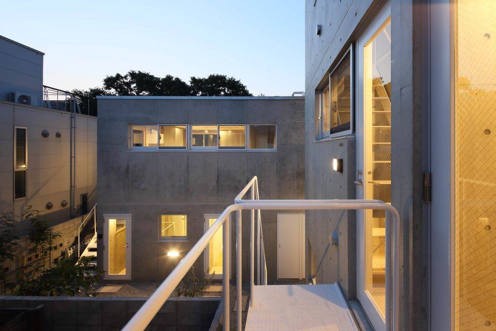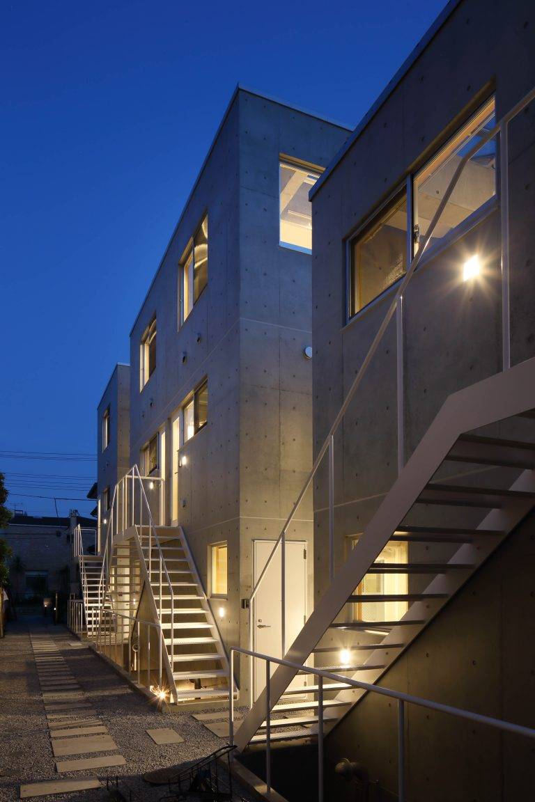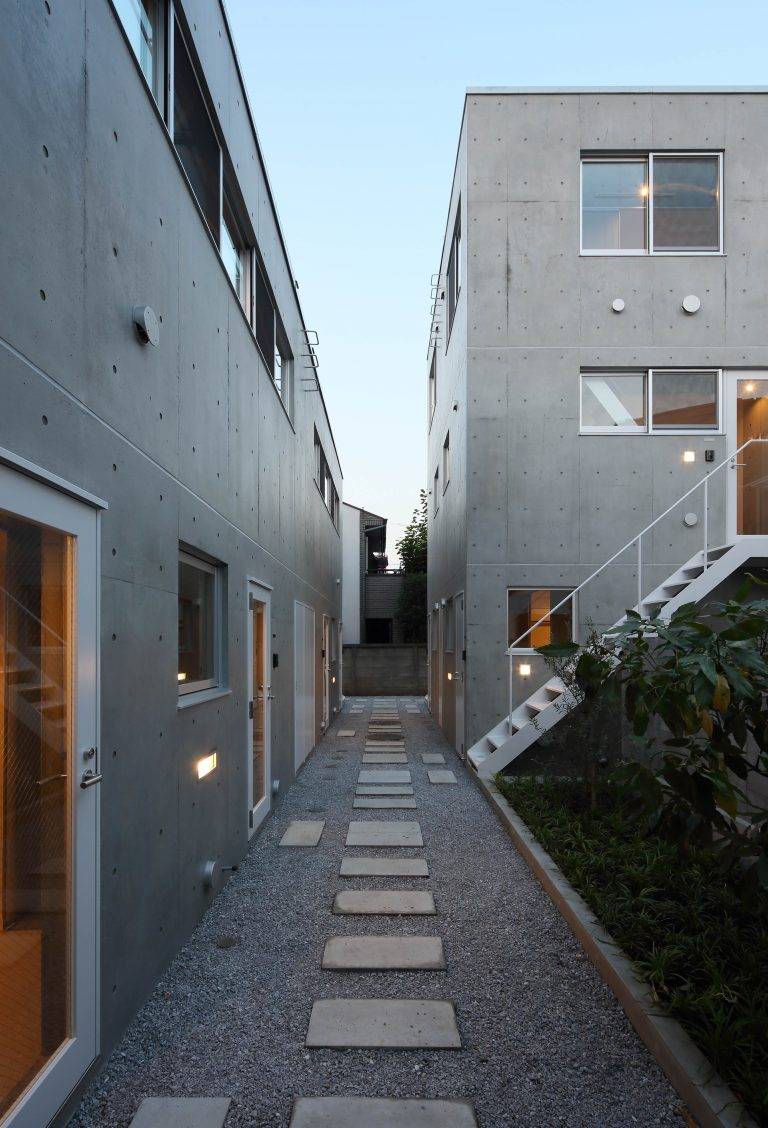 吹き抜けのメゾネットやトップライトのあるフラットなど、住戸面積は小さいが広がりのある多様な住戸で構成した。周囲と居住スペースを皮膜一枚で分断するのではなく、敷地内通路、ドライエリアおよび外部階段、縁側スペースといった空隙の帯が重層的に居住スペースを取り巻き、段階を経てグラデーショナルに周囲から距離を取っている。