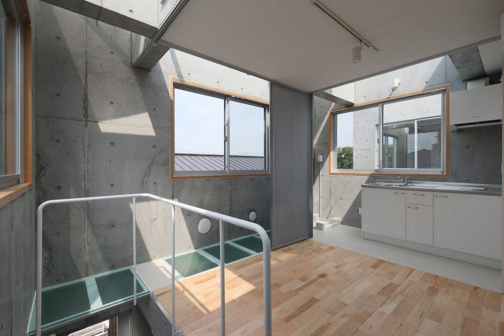 構造的には、戸境内壁に建物の背骨として鉛直リブの役割を負わせ、床スラブがなくとも外周耐力壁面外の安定性を確保できるようにしている。その結果、床面の大胆な吹き抜けと、窓としての大開口を設けることが可能となった。