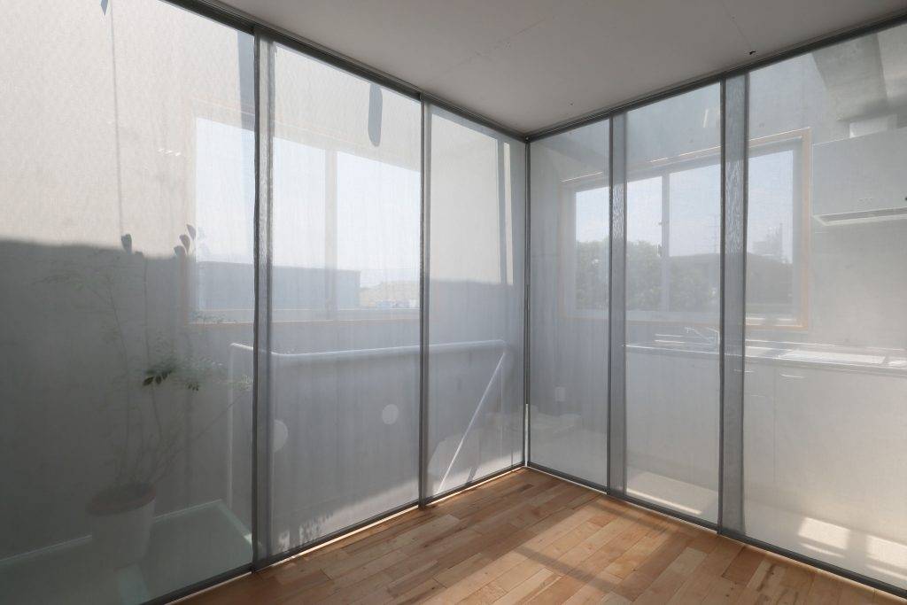 これらの層が連続しながらも、柔らかく区分することを可能とした、パネル状のカーテンで仕切られた「四辺縁側」は、居住スペースを周囲に拡大したり、逆にプライベートに集約したりすることを可能とする。