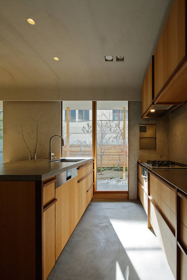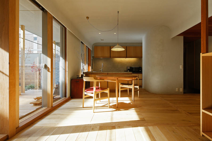 庭のスペースには雑木林のような自然樹形の木を配し、木々の木漏れ日が室内に入り込むように植えた。室内は多種多様な広葉樹を中心に自然素材を使い、小ささを活かしてコンパクトな廊下のない部屋の連なりでできている。庭をもつ66㎡の小さなマンションは、庭と共に暮らすことで広がりのある豊かな住まいとなった。