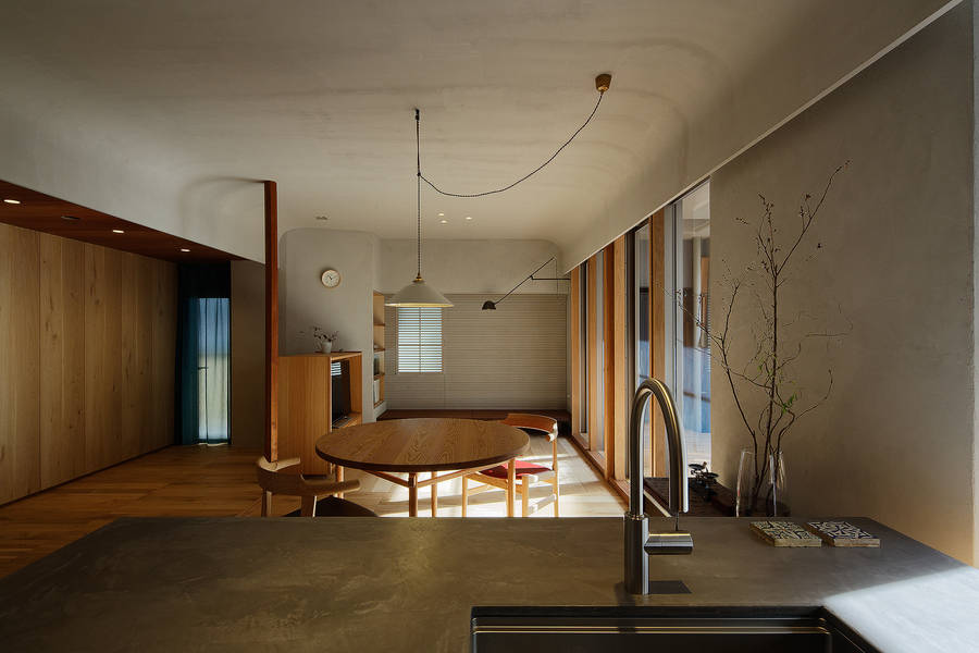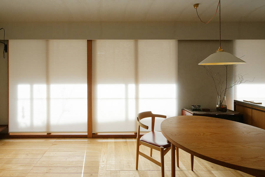 マンション特有のアルミサッシ一枚で遮断されてしまう内と外の関係性を見直し、それぞれの窓まわりに方立や垂壁、大きな窓枠などを設けて奥行を持たせることで、戸建て住宅のような設えとした。南庭に対しては軒下に自立柱と濡れ縁を設置。奥行のある濡縁は室内と庭との中間領域となって内と外との関係に広がりを与えている。