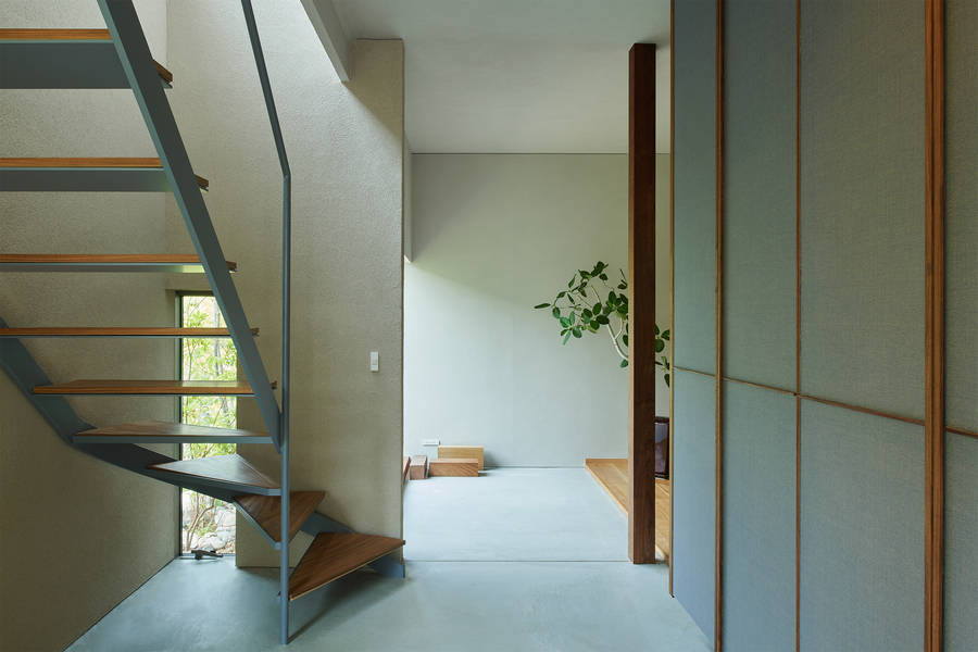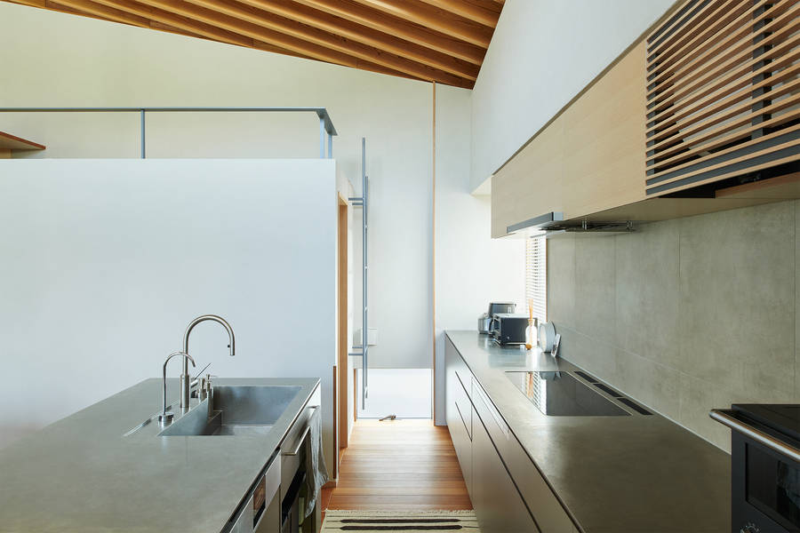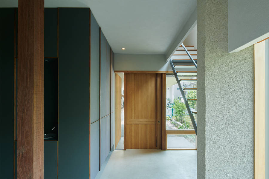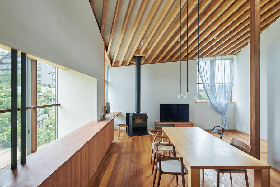敷地は擁壁の上にあり、北側に起伏のある公園、東側に大きな調整池を見下ろす場所。公園風景を中心に周辺環境とどのように向き合うかを検討するにあたり、窓について思考を重ねた。絶景となる対象のない住宅地において、窓によって排他的に切り取られた風景を愛でるのではなく、窓からの風景が日々変化するその場所の日常風景として室内に入り込むことで、その場所に住むことへの愛着に繋がればと考えた。日々の暮らしを「安息の場所」とするために、公園に面して土間や階段室、カウンターなどの緩衝帯を挟んで、つかず離れずのほどよいプライバシーを担保した窓は、室内から外へ特権的に開かないように、公園側からの見え方にも配慮して屋根架構やレースカーテン越しに気配だけを伝える窓を目指した。