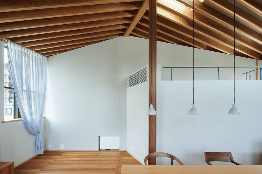二階は主室となる屋根架構現しの一室空間。斜めに振った軒の深い切妻屋根によって必然的に軒高さが異なり、隣家との高さ関係を調整している。公園と道路側には下屋根となるボリュームをL型にまわすことでハイサイド窓が生まれ、道路側をピロティにすることで視線の抜けをつくり、公園側への圧迫感を緩和させた。結果、大きな一室空間に動きが生まれ、奥行きのある窓を点在させることに繋がっている。公園に開くことで北向きとなった主室は強い直射光の入らない、優しい順光で満たされた安息の場所となった。