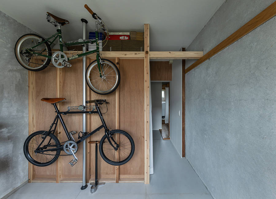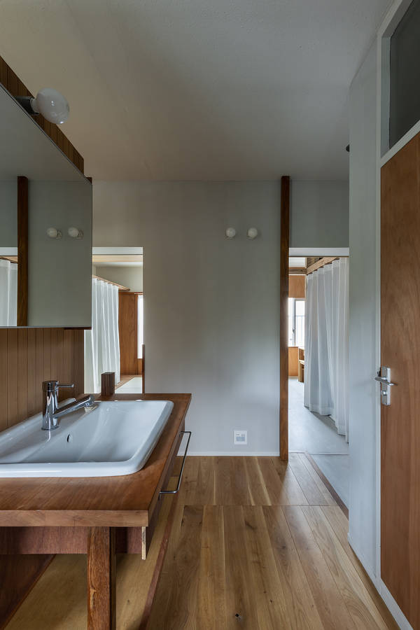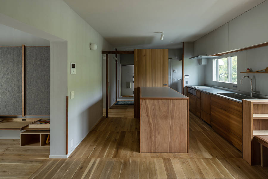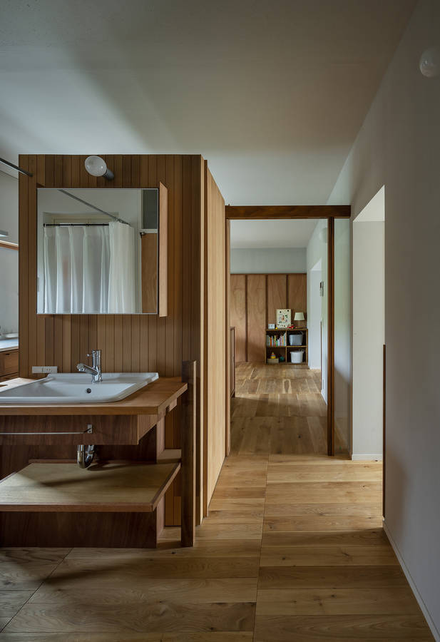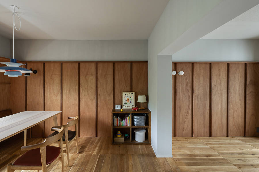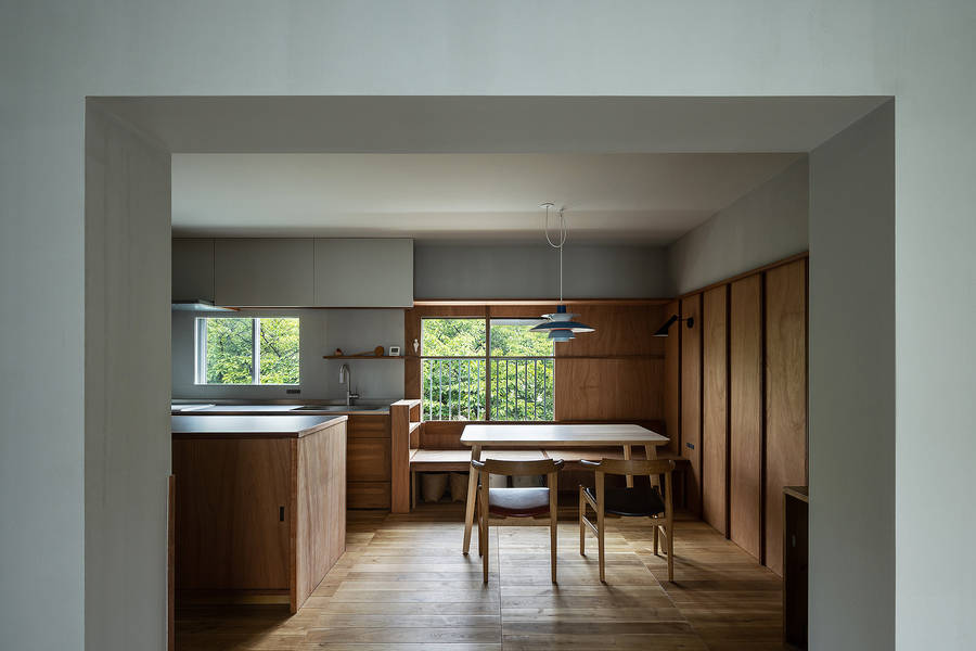 北側の窓から大きな桜の木を望む団地4階のリノベーション。居場所から見える風景と窓の関係を良好にするために重心を低めに設定、窓まわりには風景を鮮明に感じられるように、オイル拭きした濃いめのラワンとしている。北側の窓辺には、同じラワン合板でベンチを設えて、風や光といった外部の恩恵を背中で感じられるようにした。視線の関係について、居場所と窓の視線を対角線上に結ぶことで、窓から抜ける視線が隣棟と直面することなく、より遠くに視線が通るように工夫している。座った時に対角線上にとなりの部屋の窓から遠くの風景へと視線が通り抜けるといった関係性を生み出す。