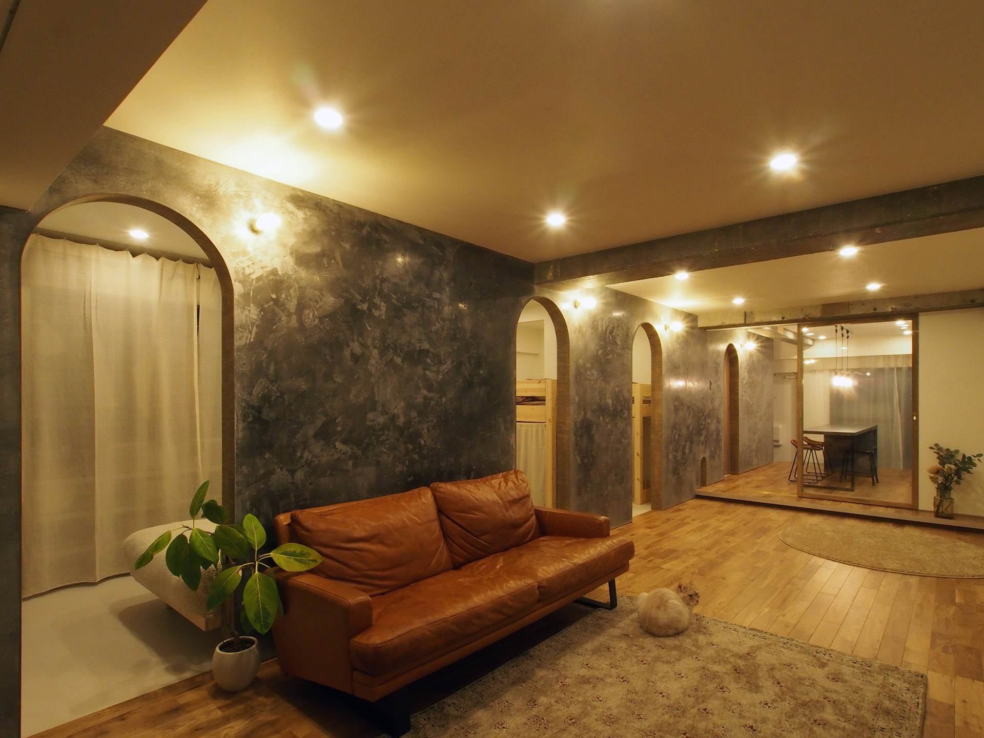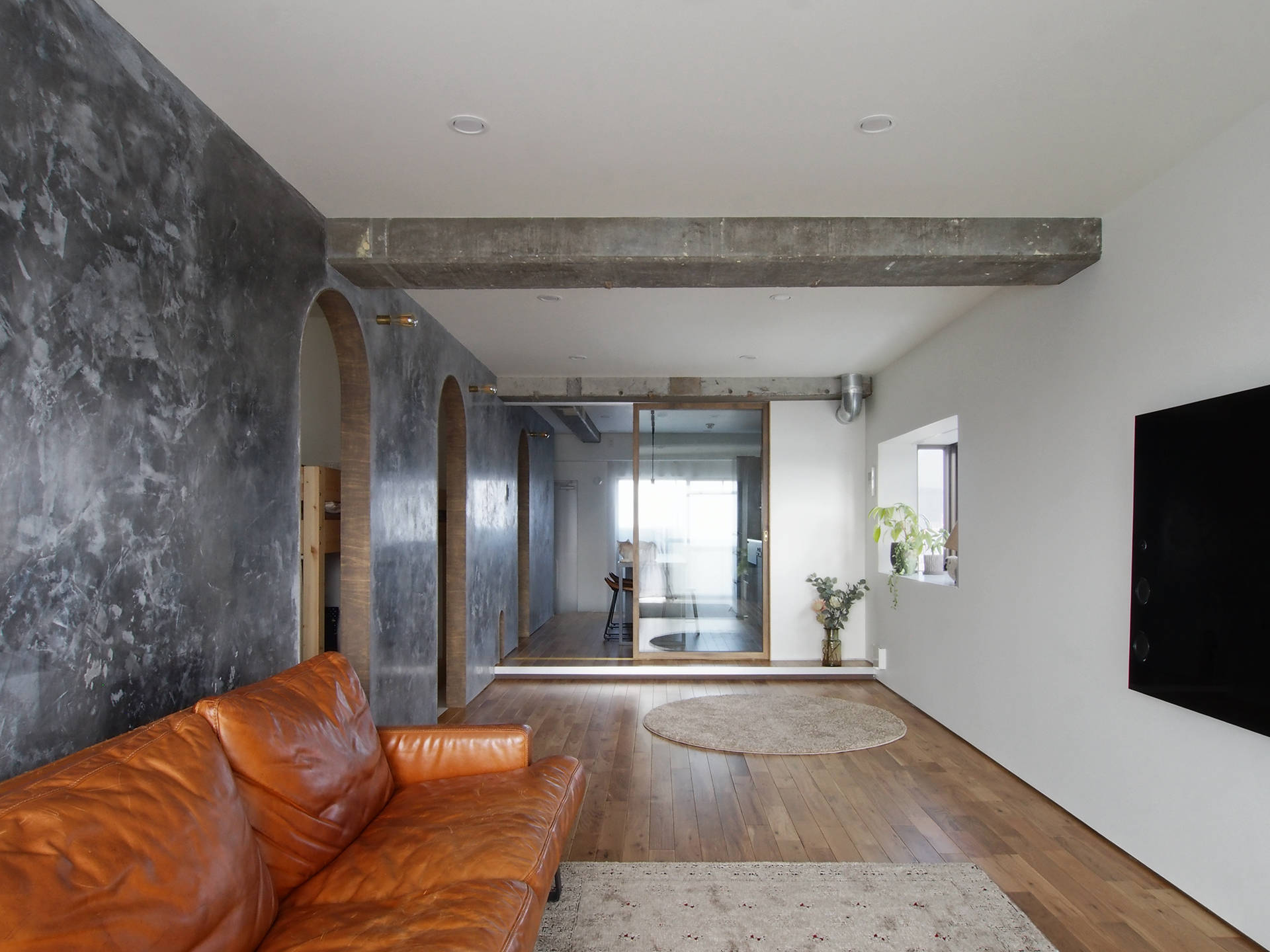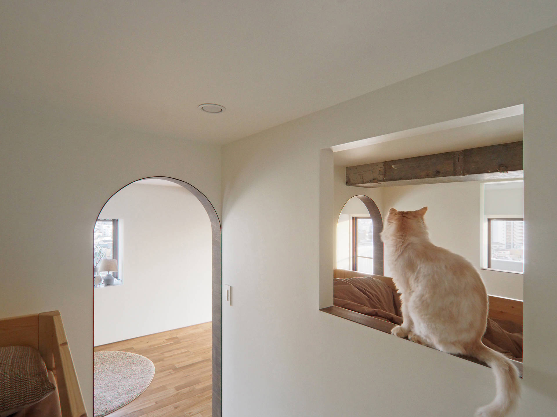 築32年のマンションをリノベーションした、母と子供2人のための住宅です。「個室は最小限でLDKを広くしたい」「ローコスト計画」がご要望でしたので、室の長手を2分割する壁を1枚建てる計画としました。2分された片方は個室や水廻りとなるプライベートスペース、もう片方は人が集まるコモンスペースとしてのLDKを配置しています。奥行きのあるLDKに各寝室が接続することで、自然と家族が集まる空間となっています。また各所に設けた猫道が「家族を繋ぐ窓」としても活かされています。