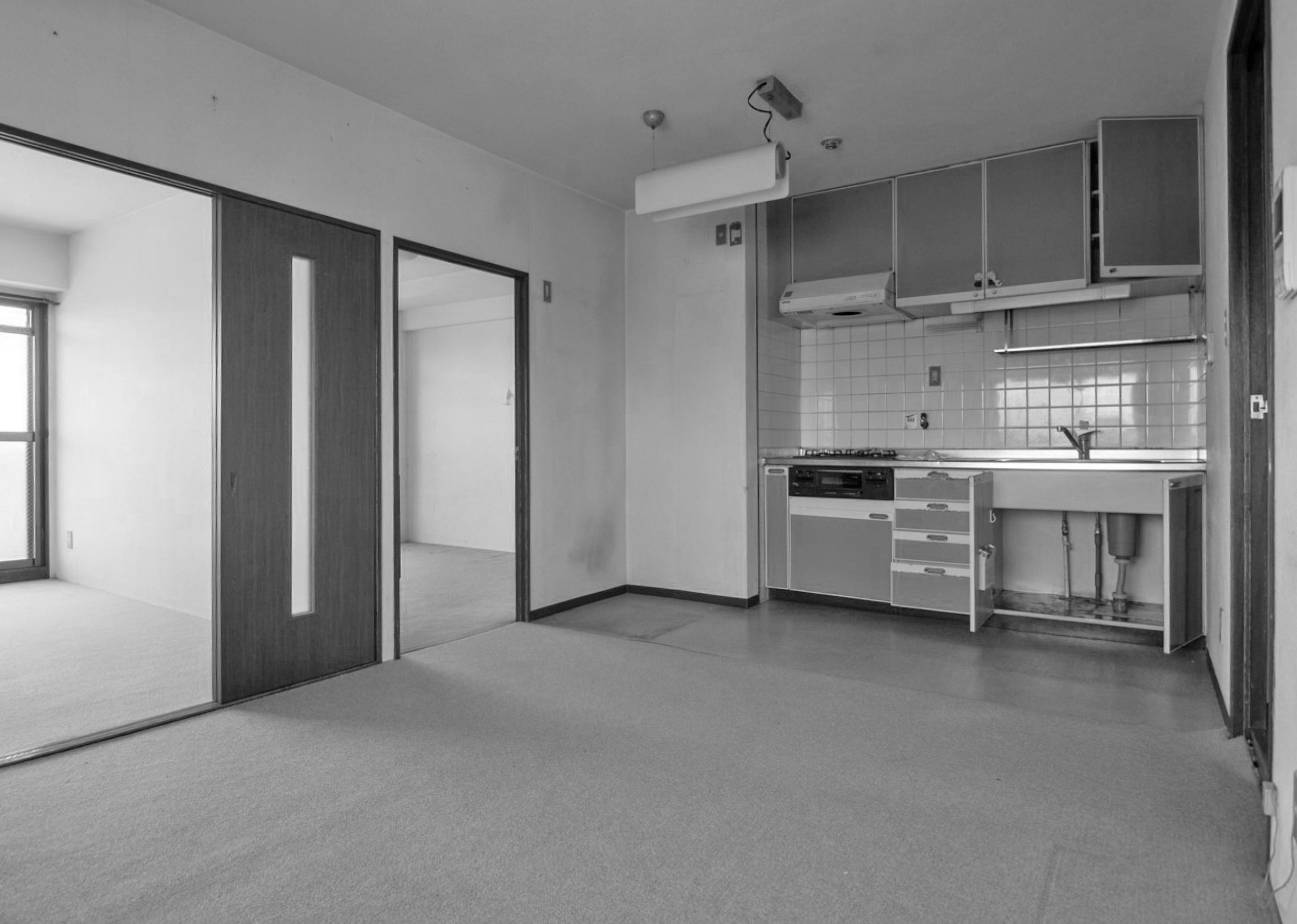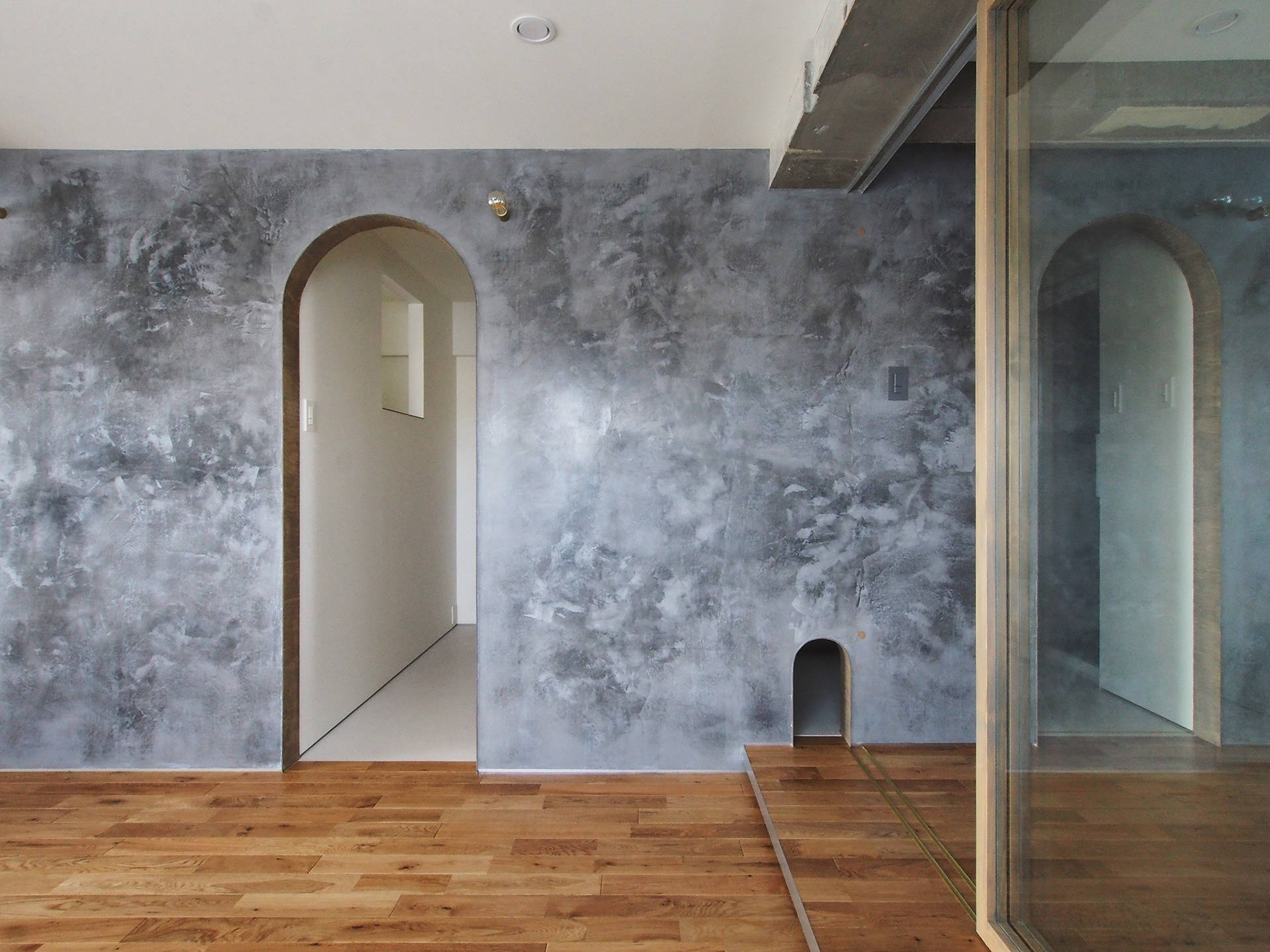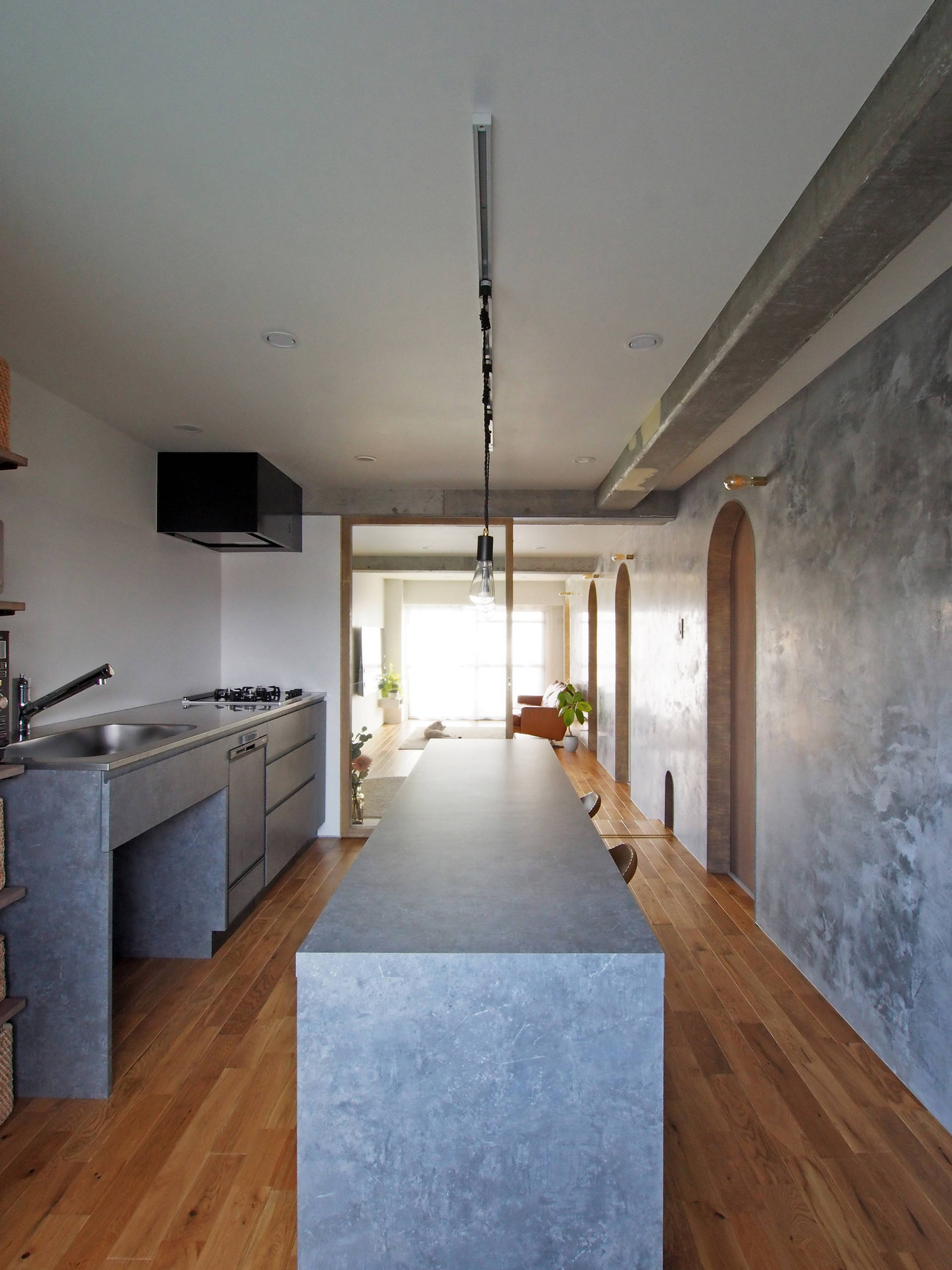 築32年のマンションをリノベーションした、母と子供2人のための住宅です。「個室は最小限でLDKを広くしたい」「ローコスト計画」がご要望でしたので、室の長手を2分割する壁を1枚建てる計画としました。2分された片方は個室や水廻りとなるプライベートスペース、もう片方は人が集まるコモンスペースとしてのLDKを配置しています。奥行きのあるLDKに各寝室が接続することで、自然と家族が集まる空間となっています。また各所に設けた猫道が「家族を繋ぐ窓」としても活かされています。