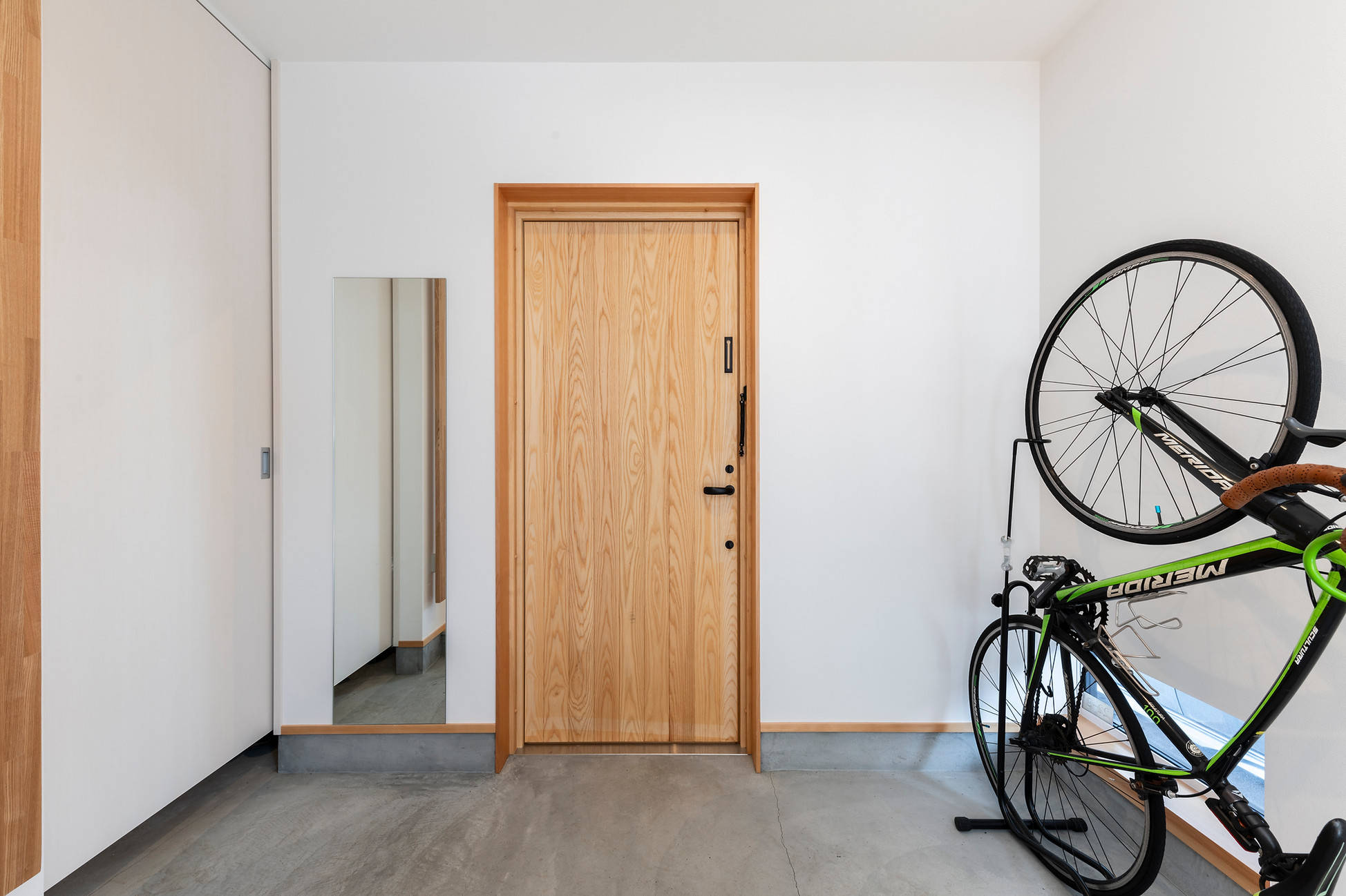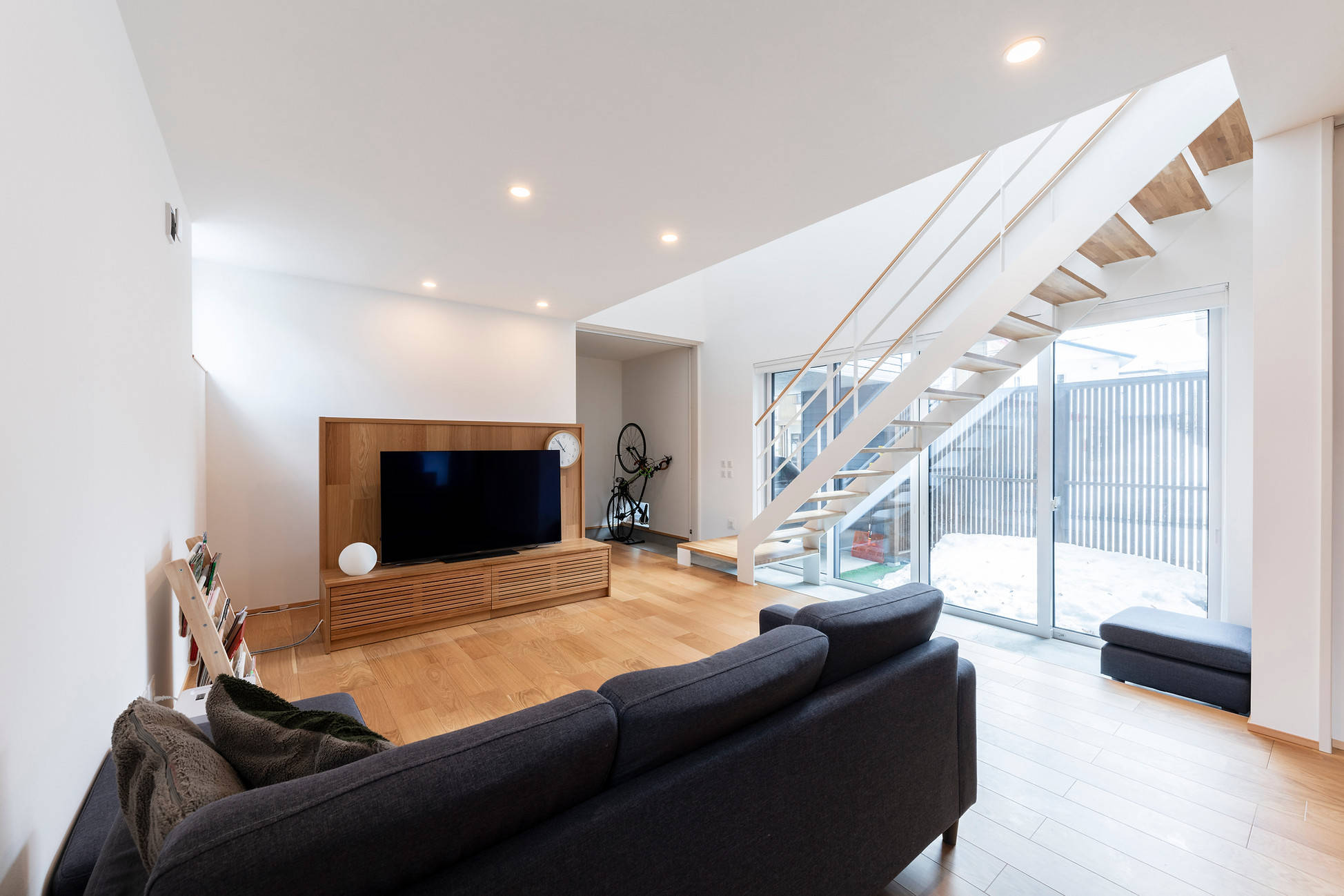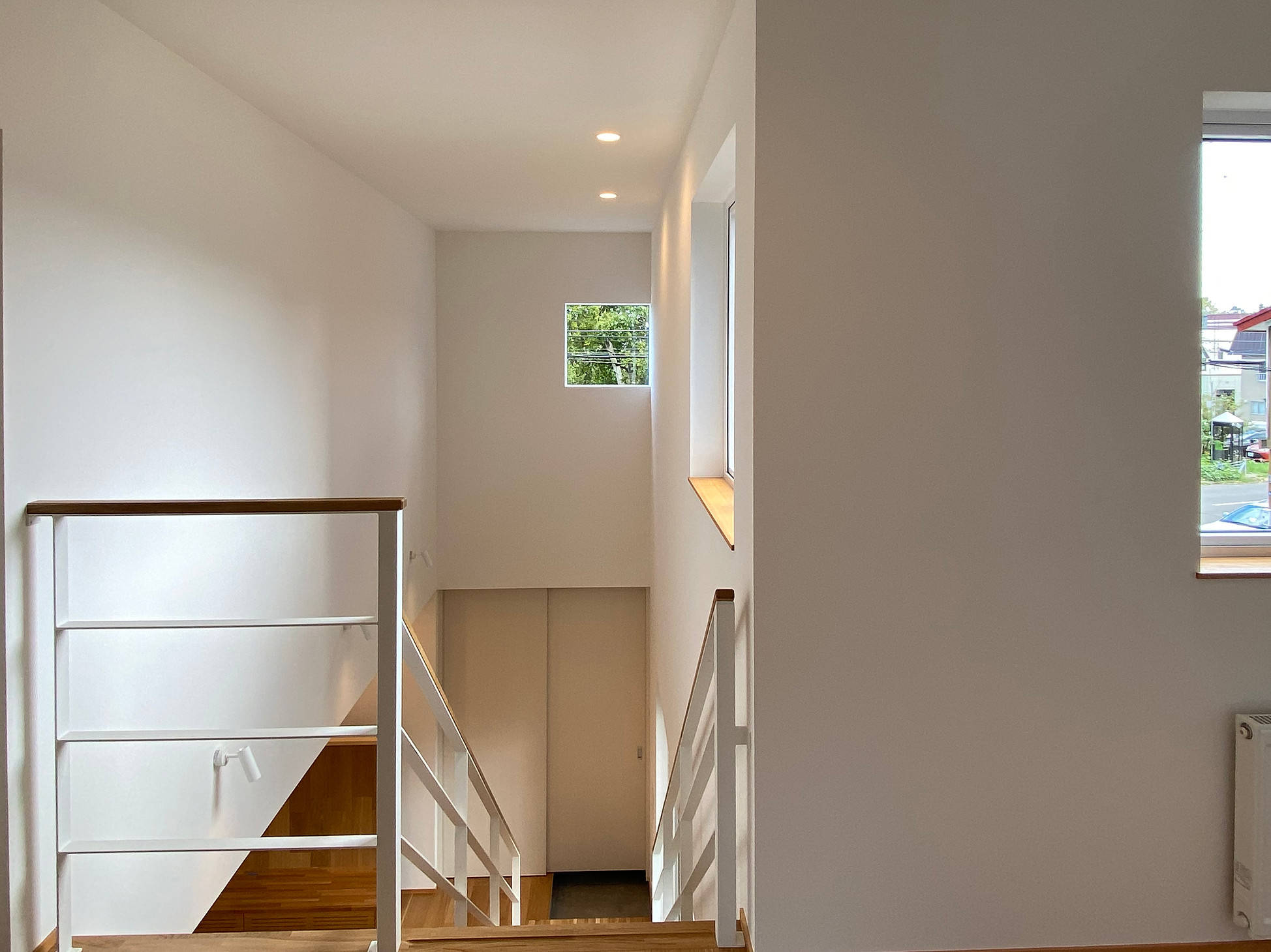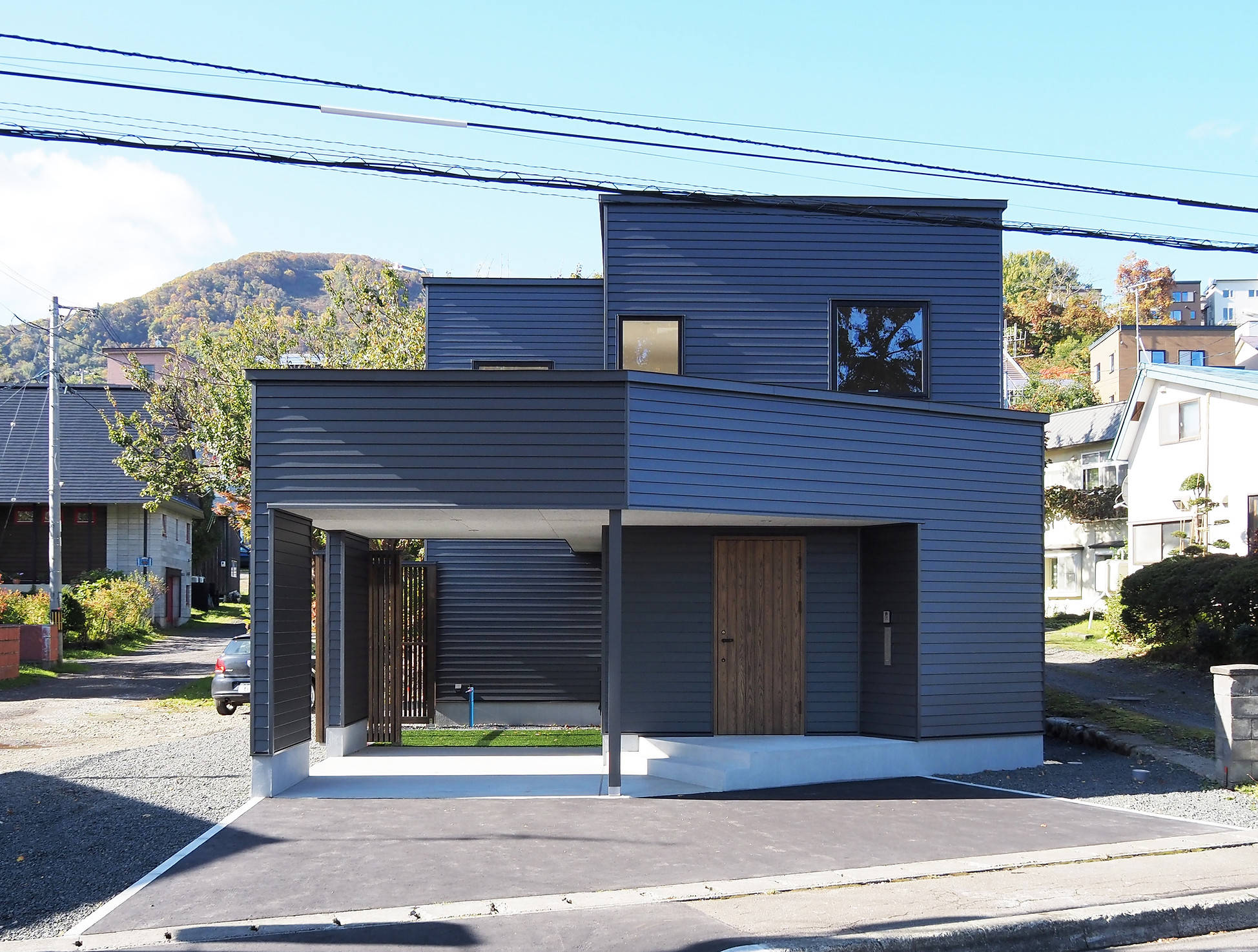 正面に道路を挟んで大きな公園のある周辺環境の中で「自然豊かな外部」と「私的な内部」の関係性を中庭と吹抜によって計画しました、中庭とカーポートと玄関ポーチ、玄関と土間と階段、中庭とリビングが重なり合いながら繋がる住宅です。