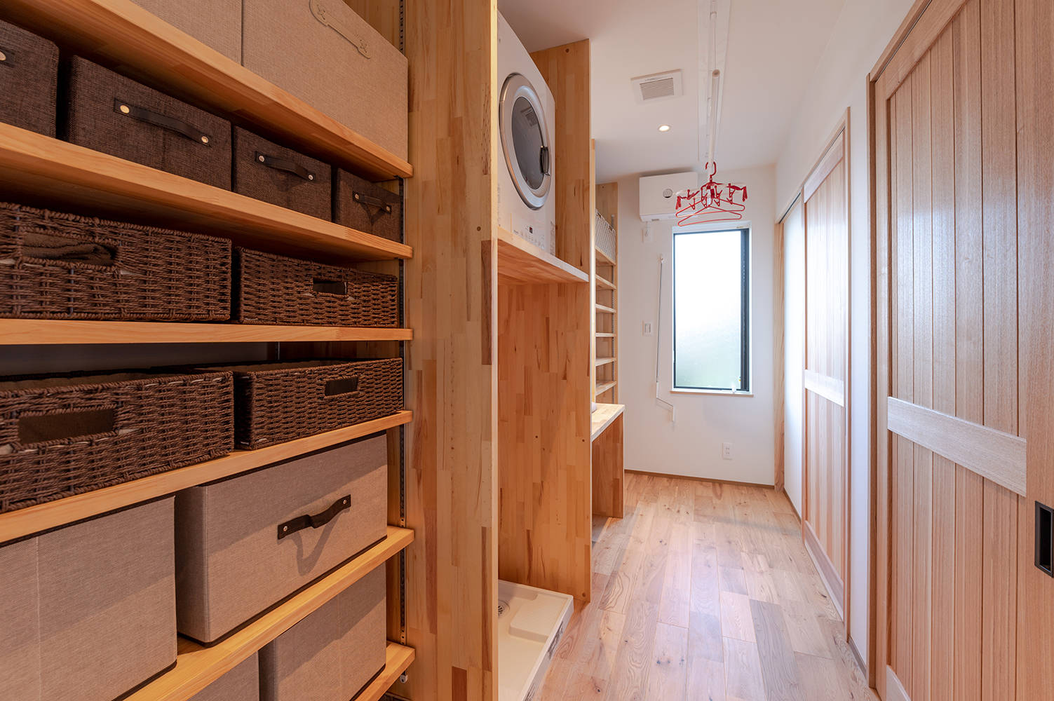また、土間収納のパンチングボードや、キッチンからパントリーを抜けて家事のできるパントリー・洗面所と家事が楽になる回れる動線にするなど、暮らしやすさにも配慮しています。