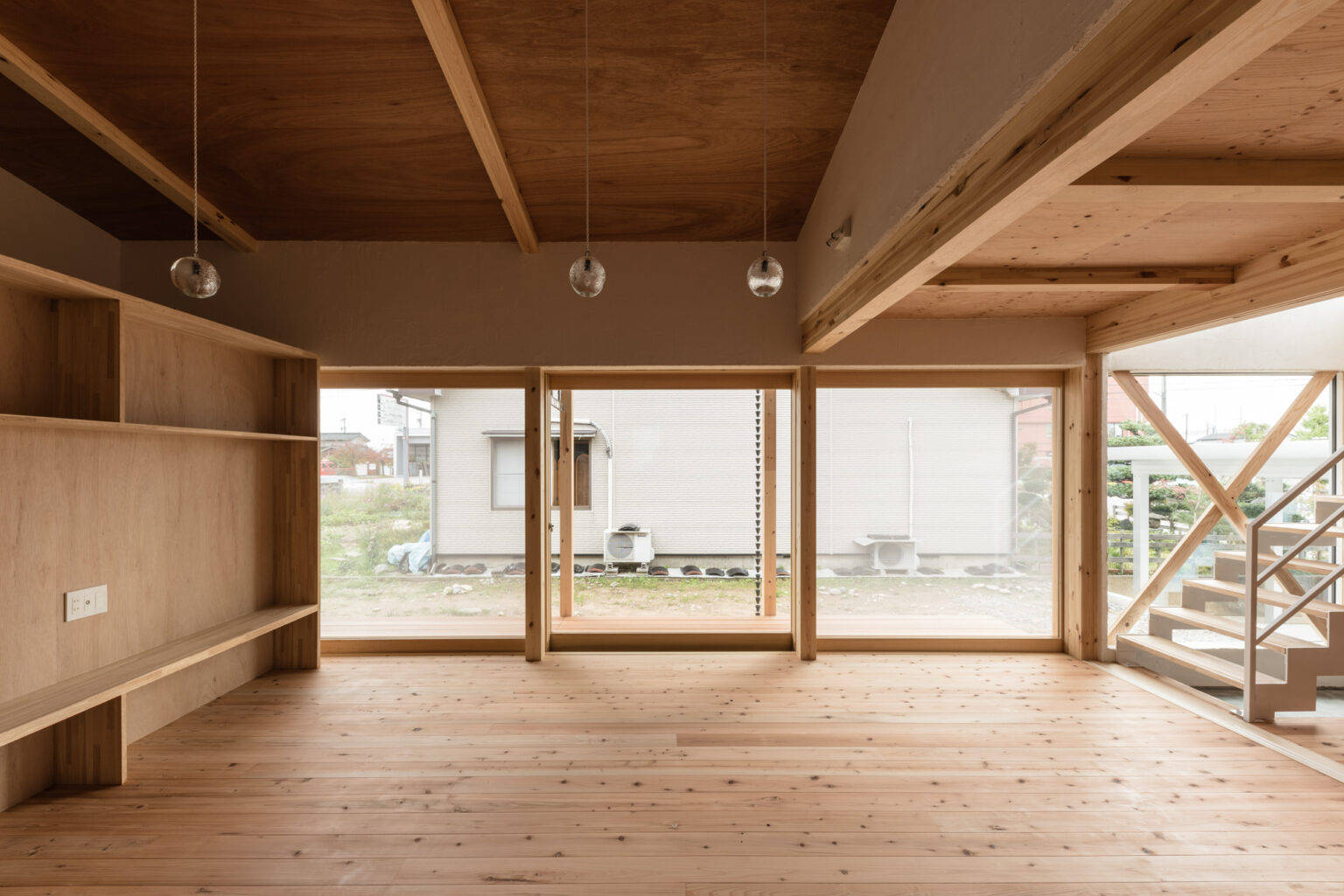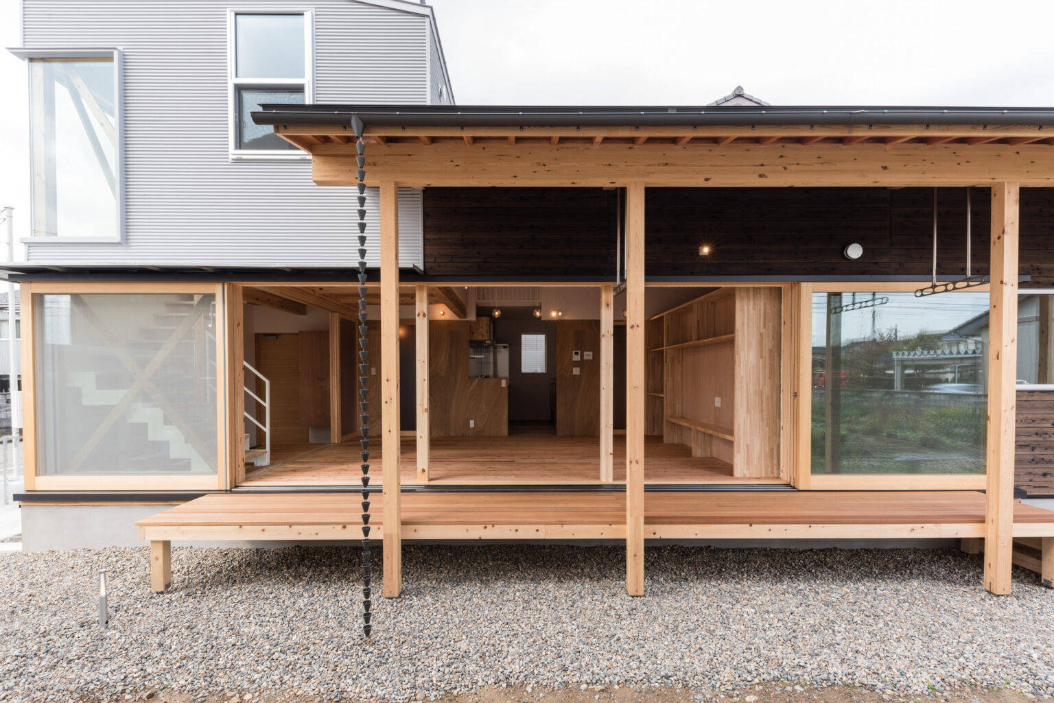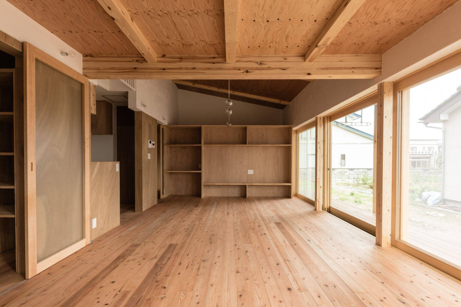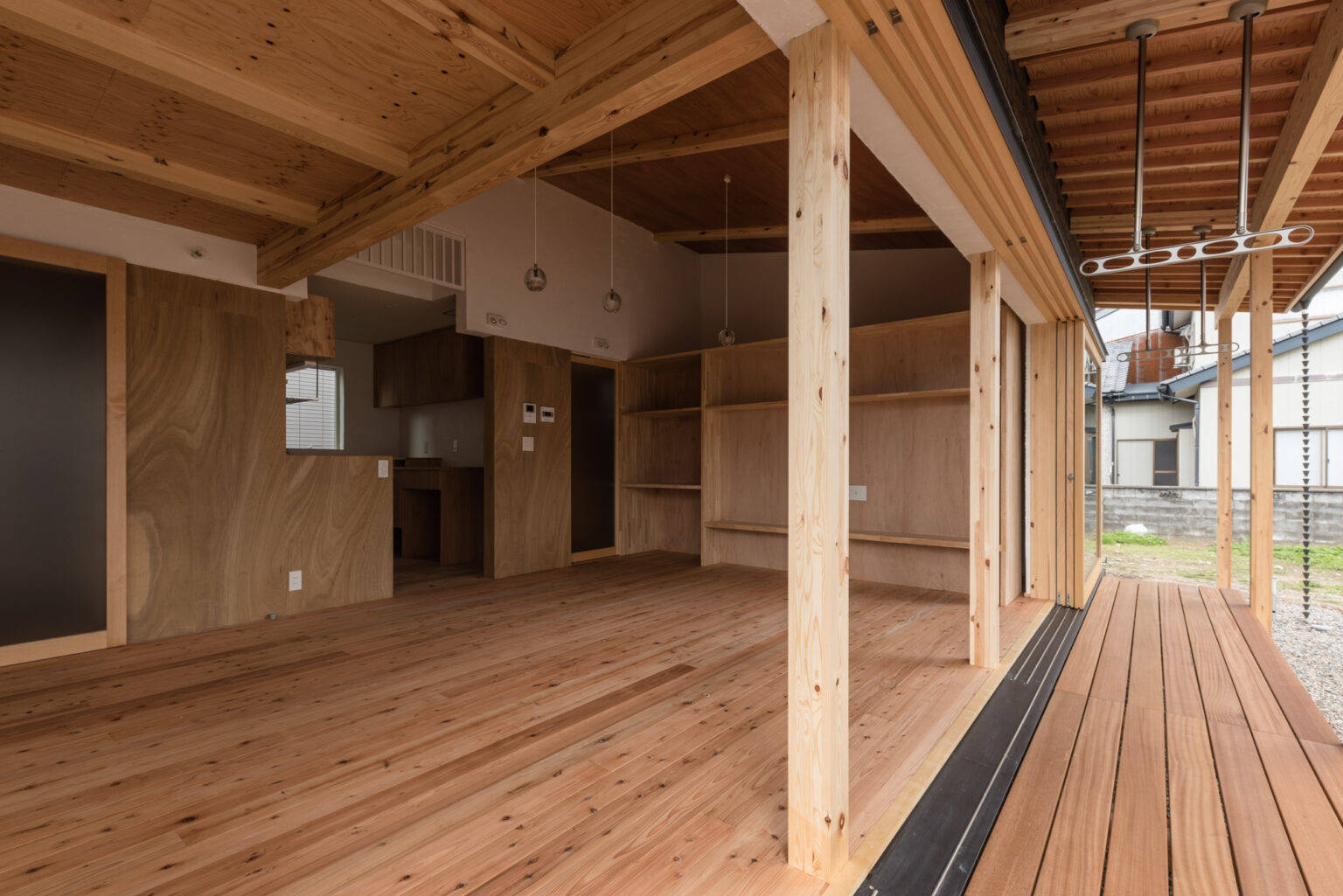 今計画では室内空間と屋外の境を無くす事を目指しました。間を隔てる木製建具は1.8×1.8m×3枚の建具は全開口することで中と外を繋ぎます。