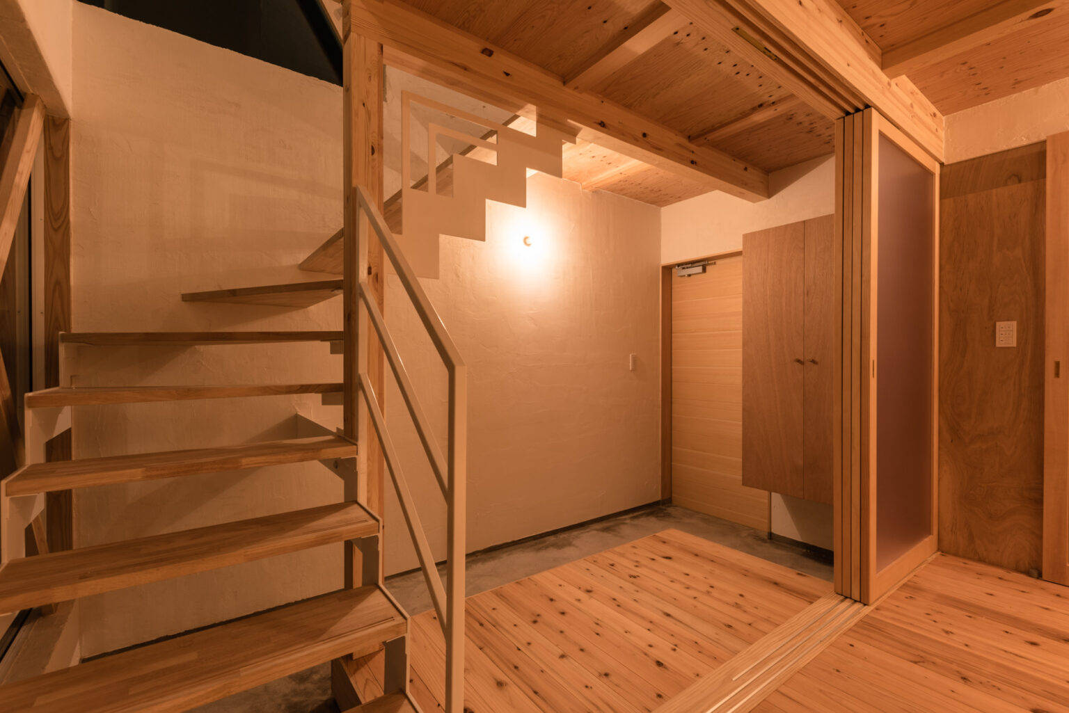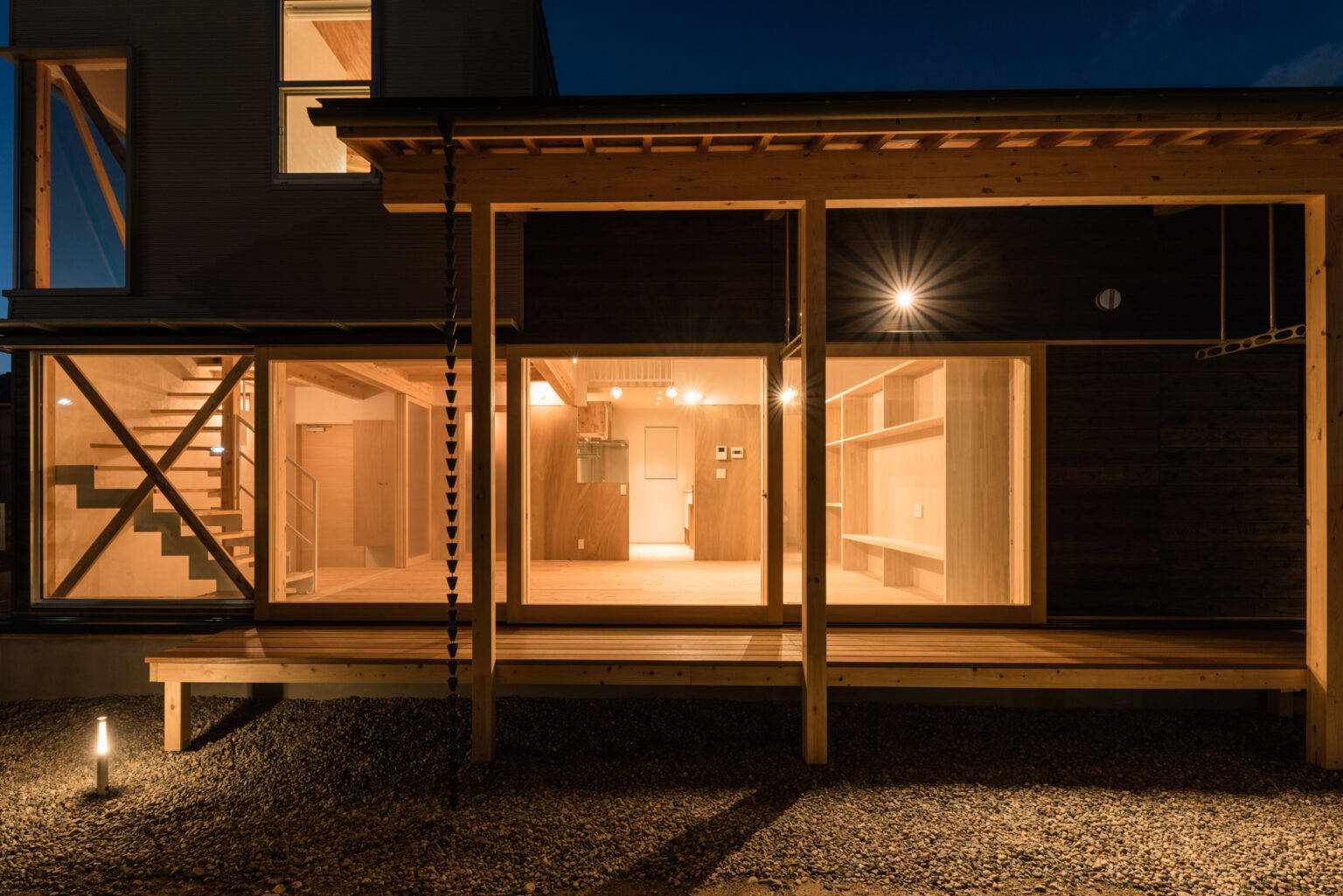 また、計画と同時期に生まれたお子様の成長に合わせ、家も美しく歳を取る事に意識して各素材を選んでいます。外壁の焼杉は風化と共に変色変形を伴い、内部の床板に選定された杉材は裸足で歩くと程よい硬さで暖かい一方で柔らかく傷がつきやすし反りも激しい。しかし、これは劣化ではなく風化であり、美しいエイジングをしていく建物としています。