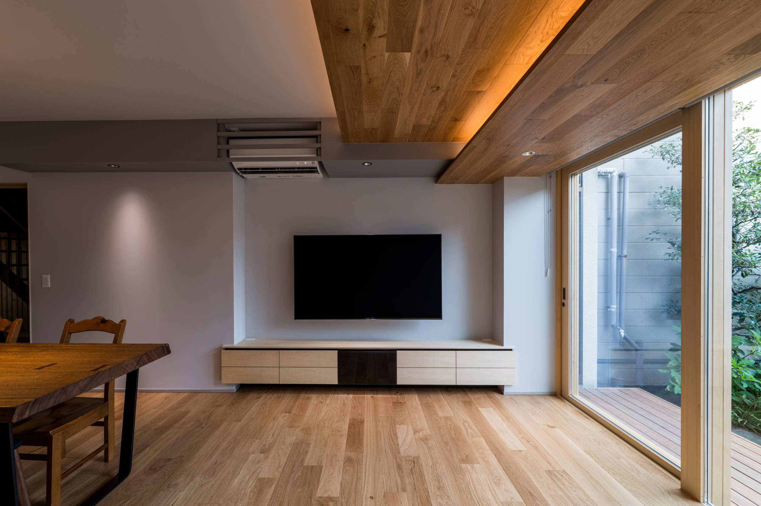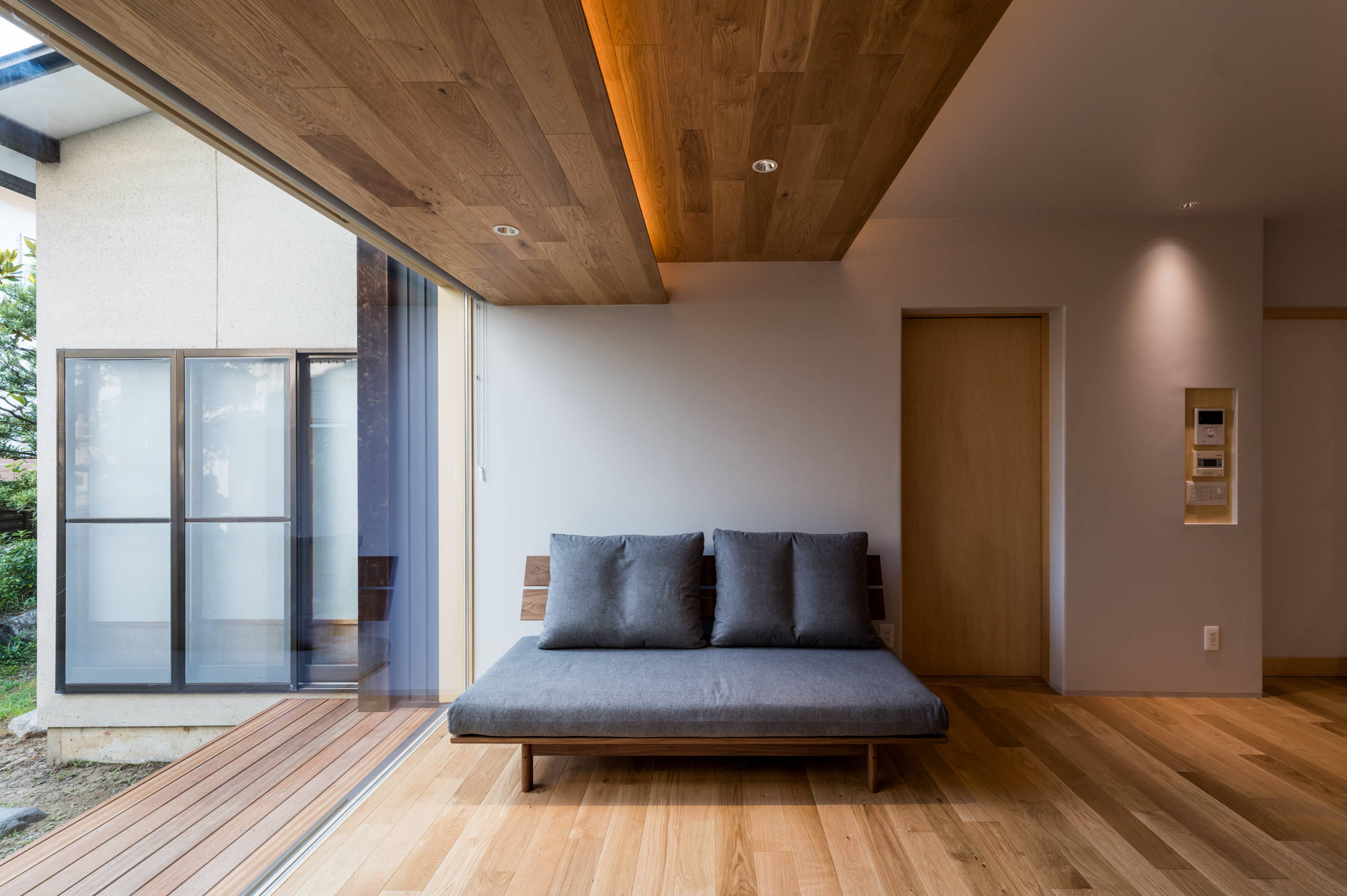 本計画では庭の景色と居住空間を最大幅の開口で繋ぎシームレスな関係性を形成することで、日々の外部環境を取り込み愉しむことができる豊かな空間として計画した。