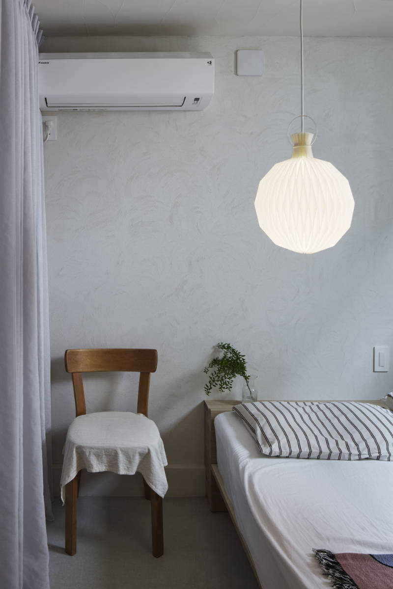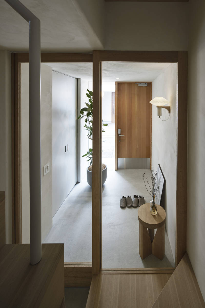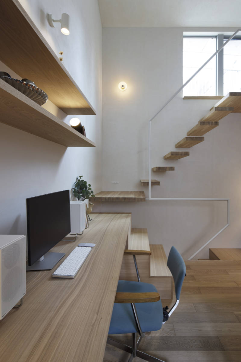 防火地域に建つコンパクト住宅です。通常は耐火建築物としなければならない地域ですが、小規模かつ2階建て以下とすることで、準耐火建築物としています。狭小であるからこそ、空間的にも仕上げ的にもシームレスで柔らかく、シークエンスを感じる空間となっています。空間として最も特徴的な木造のみの片持ち階段を、デスクカウンターの天板なども経由しつつ極力シンプルにまとめ、そこに一筆書きの手摺がカクカクよじ登っていく構成としています。