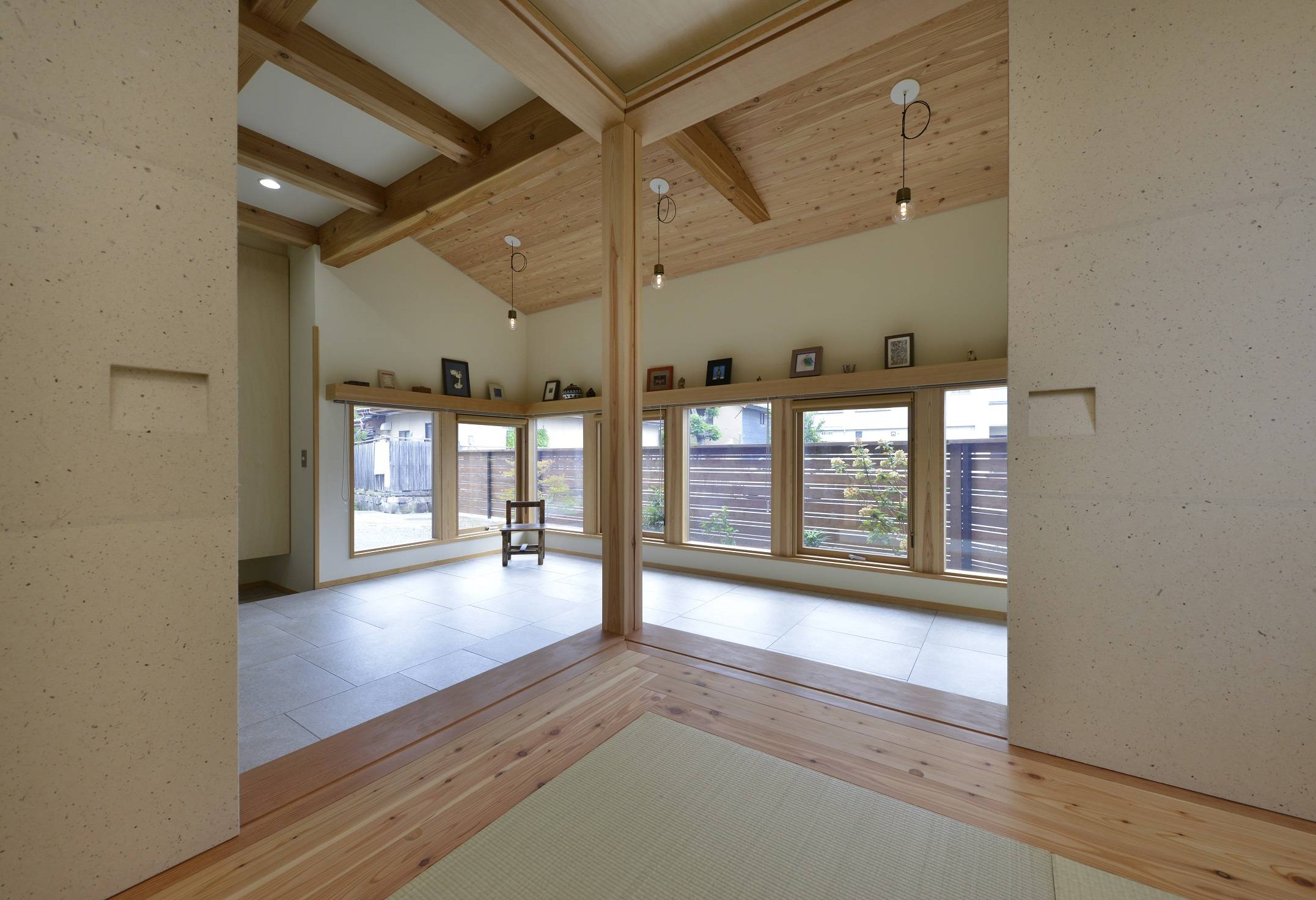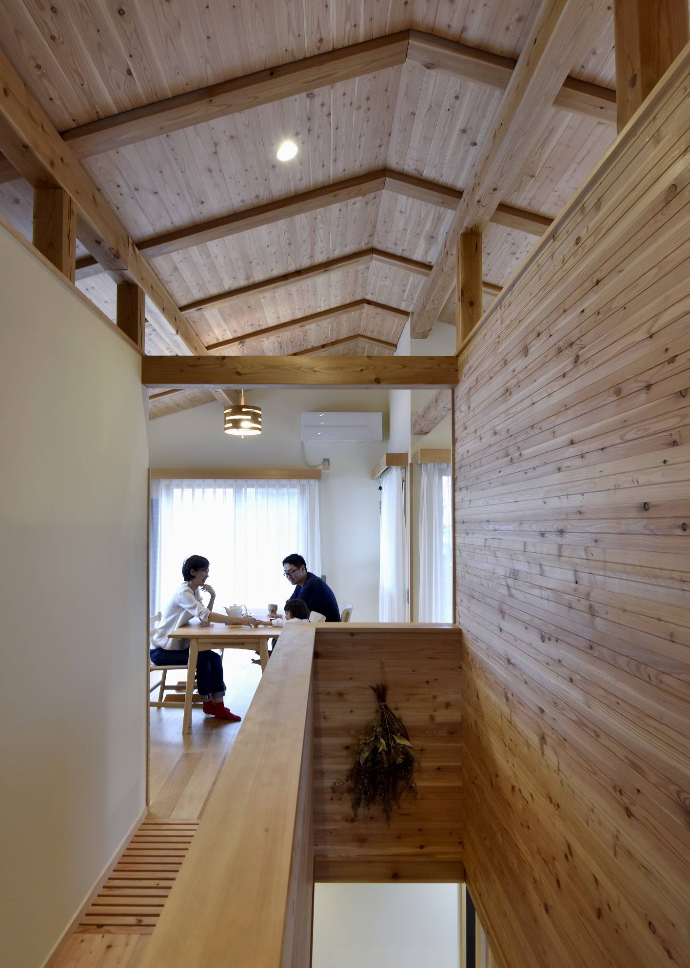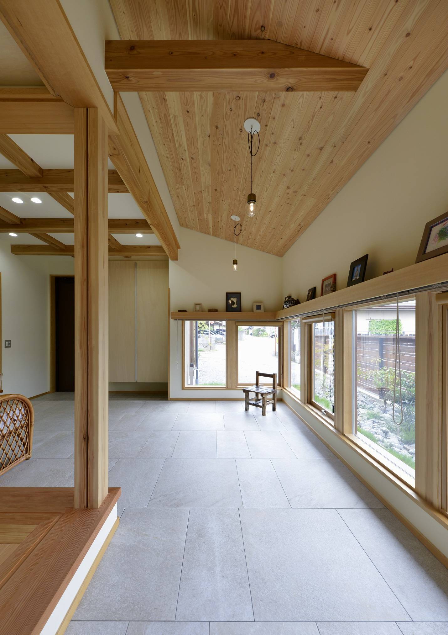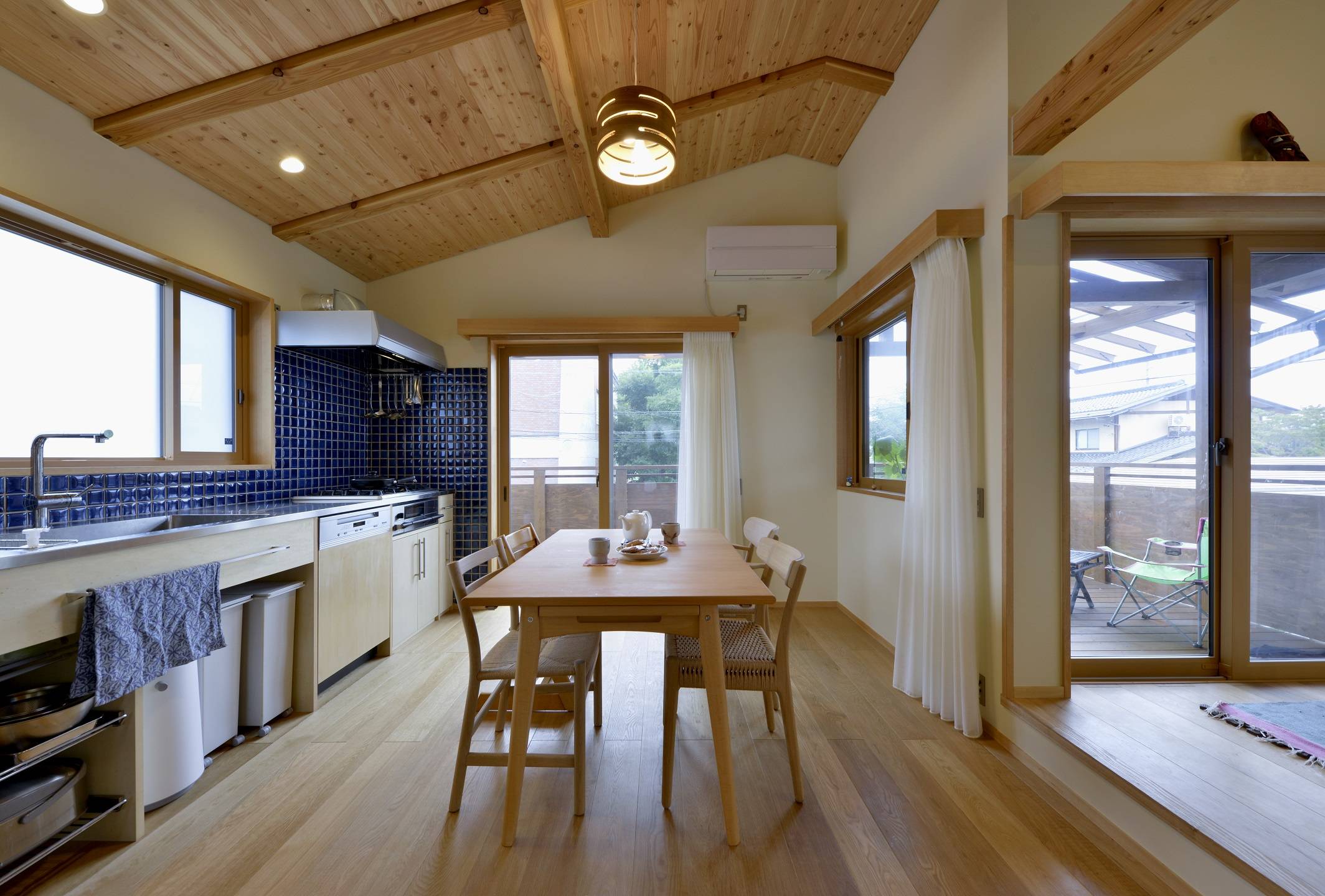 施主さんの新居計画へのご要望を咀嚼し、幾度にも渡る打ち合わせの末、1階は土間スペース+客室+プライベートスペース・2階にLDK+デッキテラスという空間構成が生み出されました。1階土間スペースは、敢えて低く抑えた木製開口部により、落ち着きと開放性という相反する雰囲気を合わせ持った空間となりました。2階スペースは回遊性を持ったオープンな室内空間と透明屋根の架かる広いデッキテラスとが程よい関係性で繋がっています。日々の生活に潤いを与える要素が満載の住まいです。