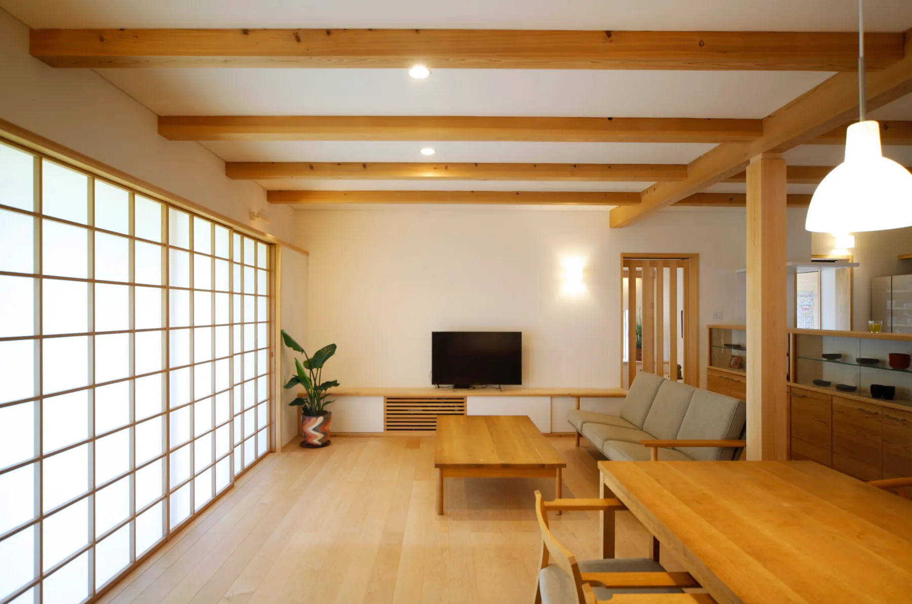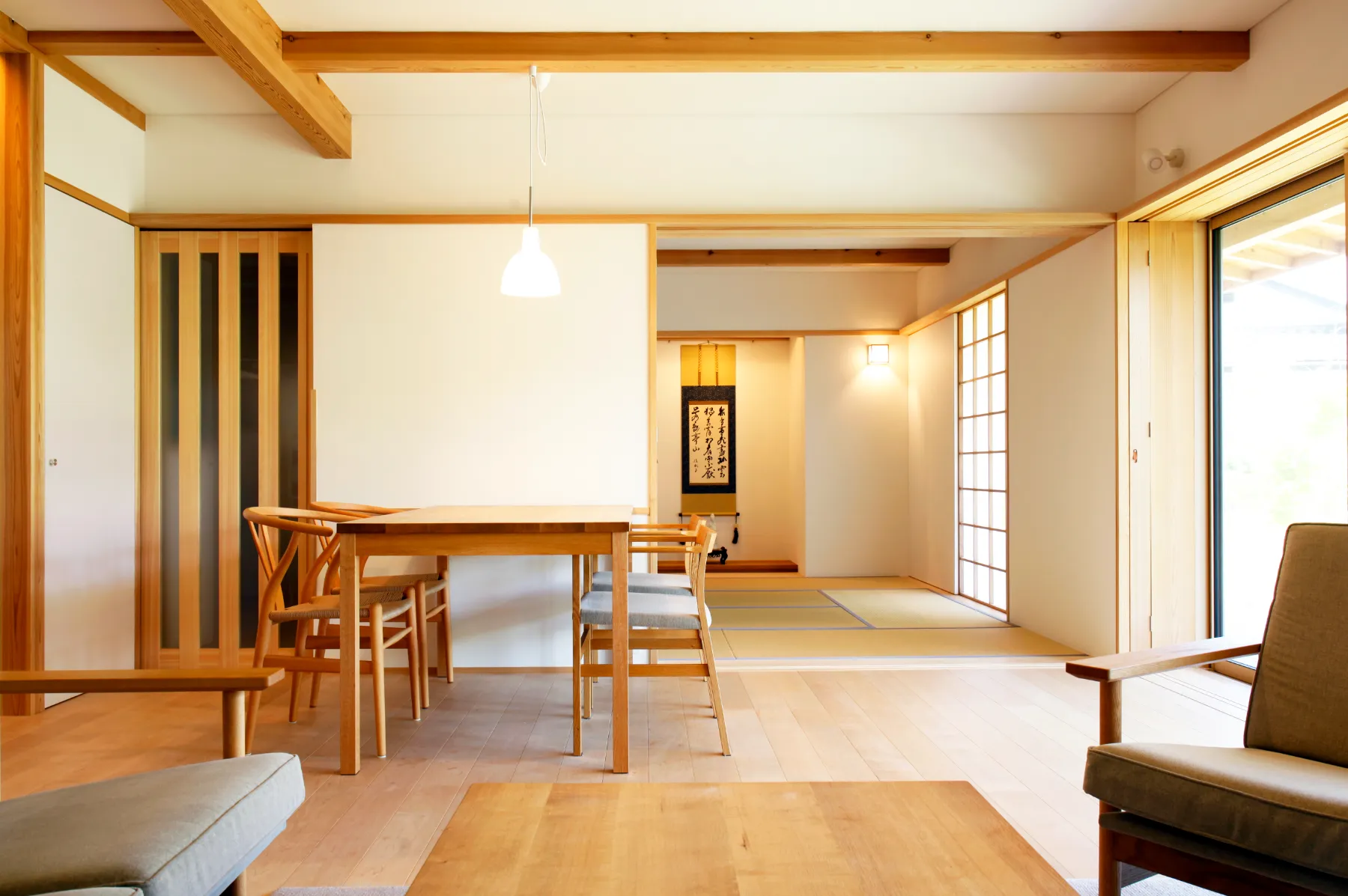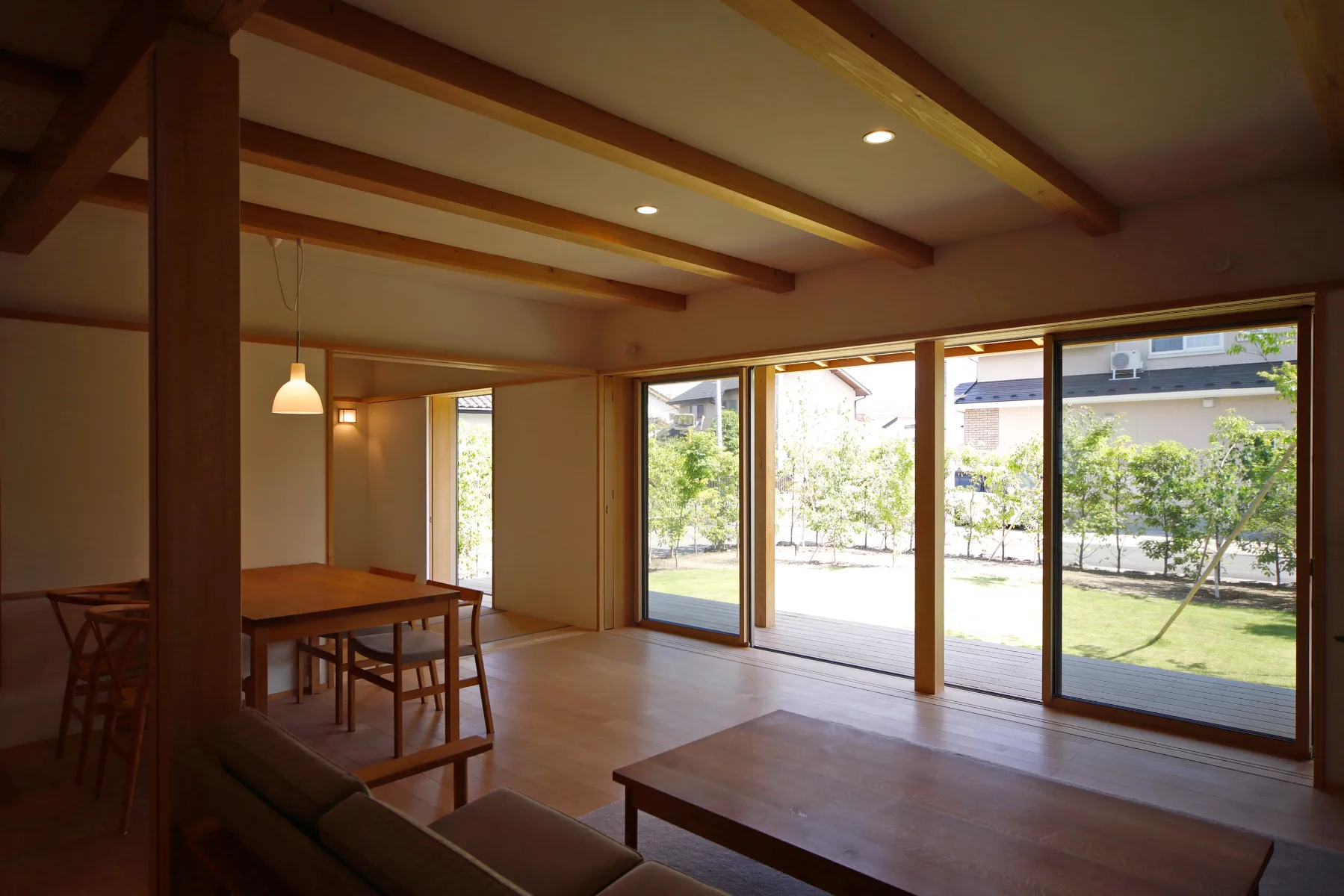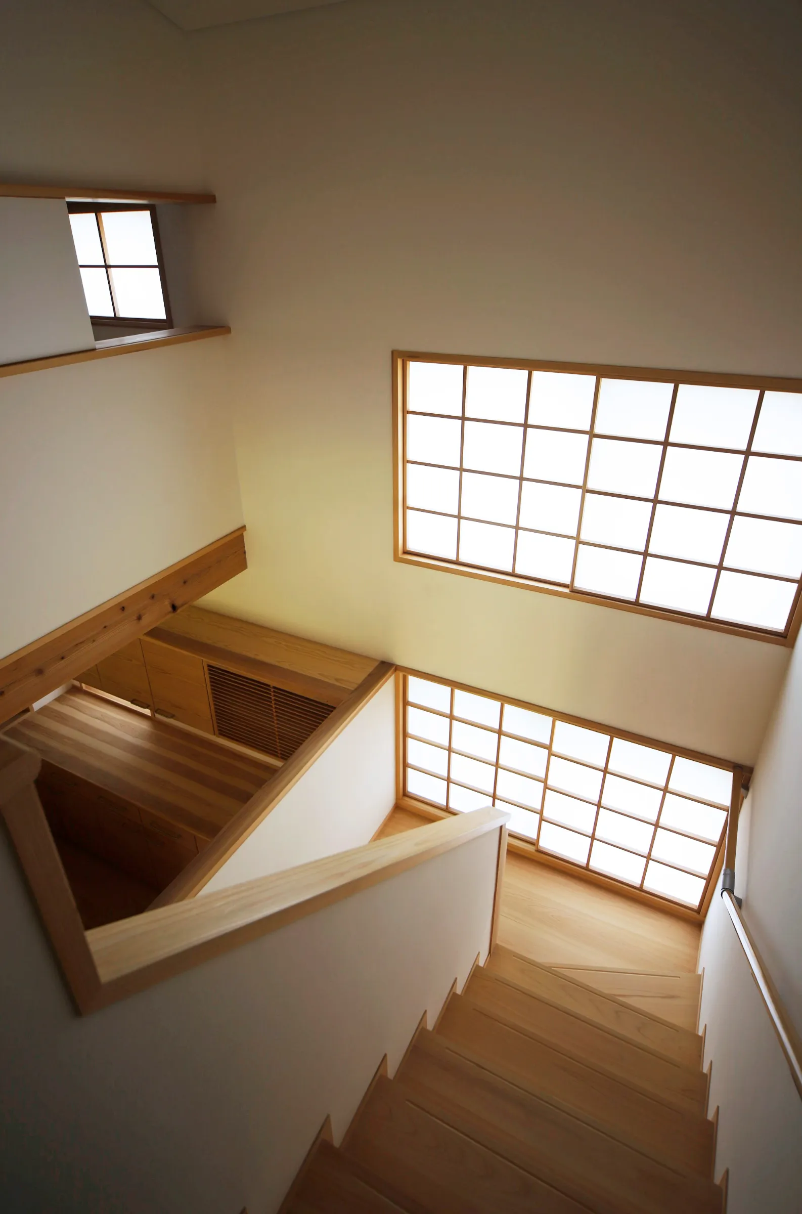 檜材で作られた吹き抜けのある住宅