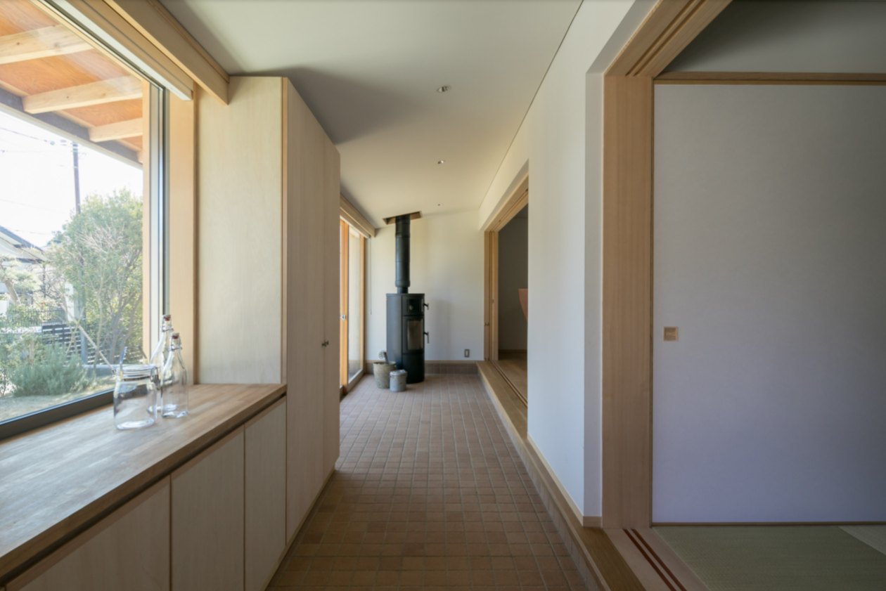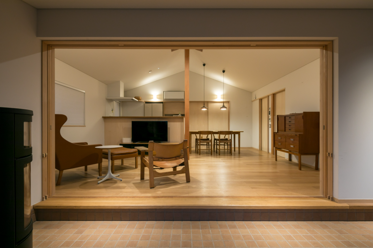 玄関から続く土間は、客間、リビングへと続きます。床はタイル仕上げ。