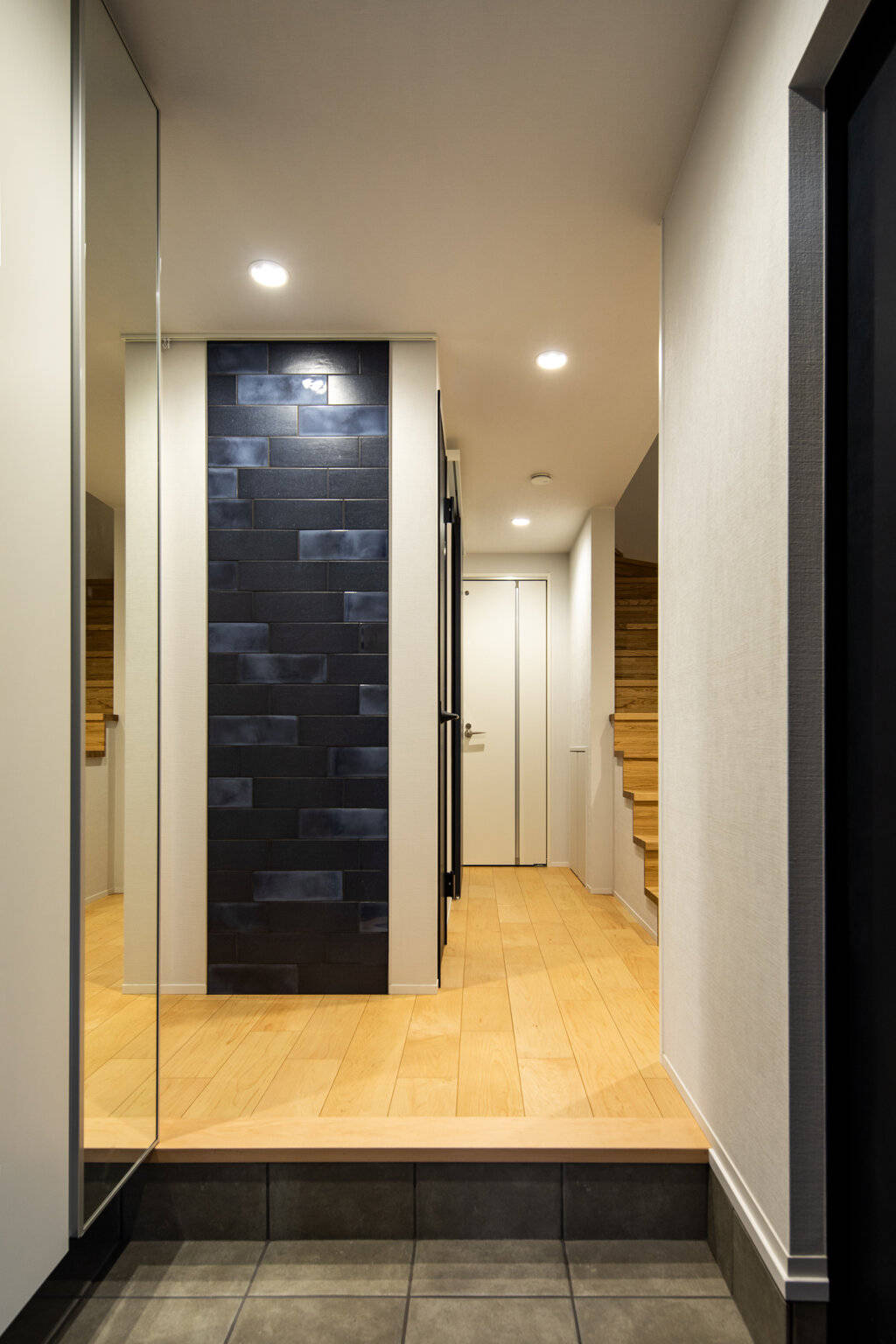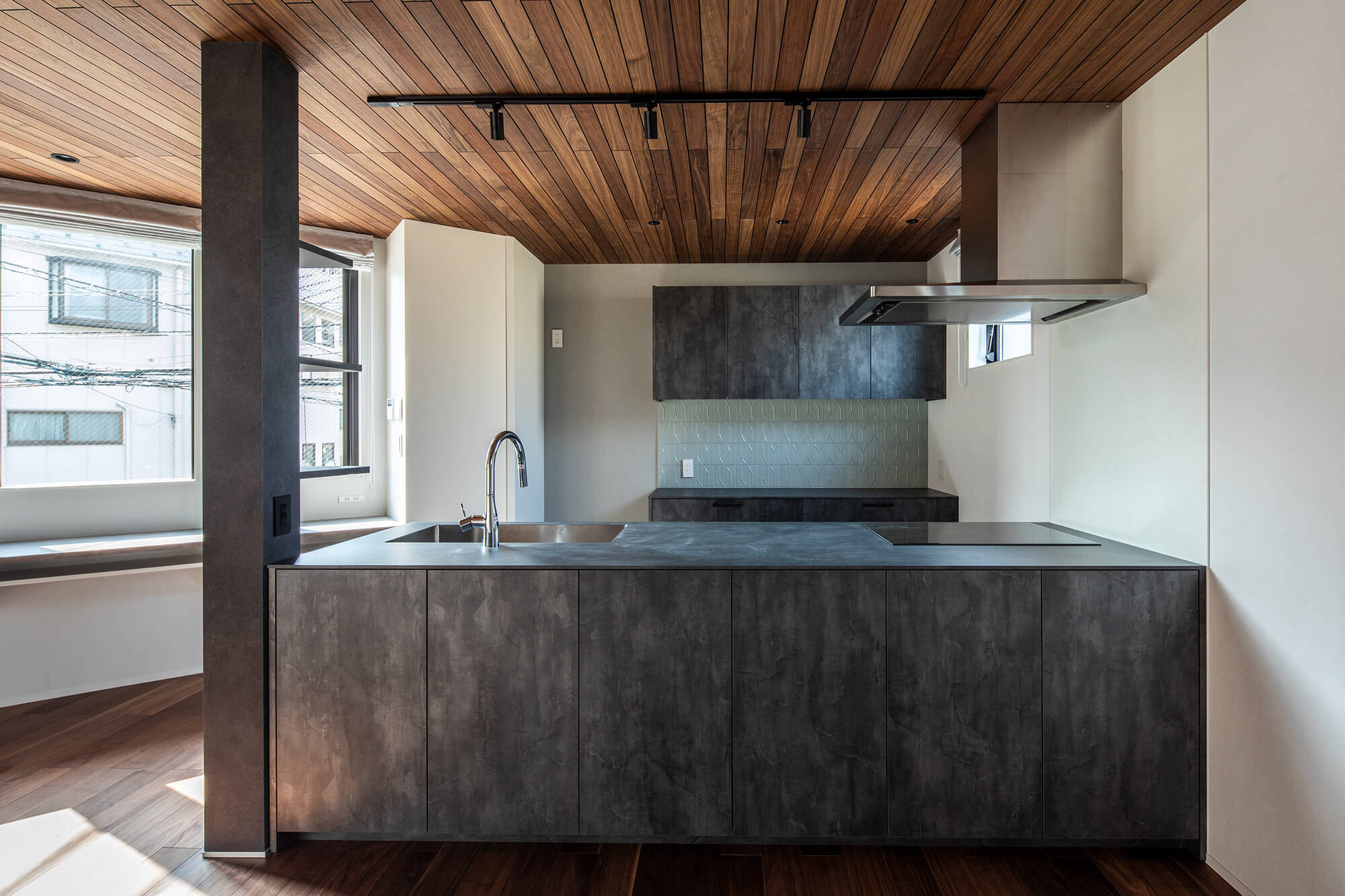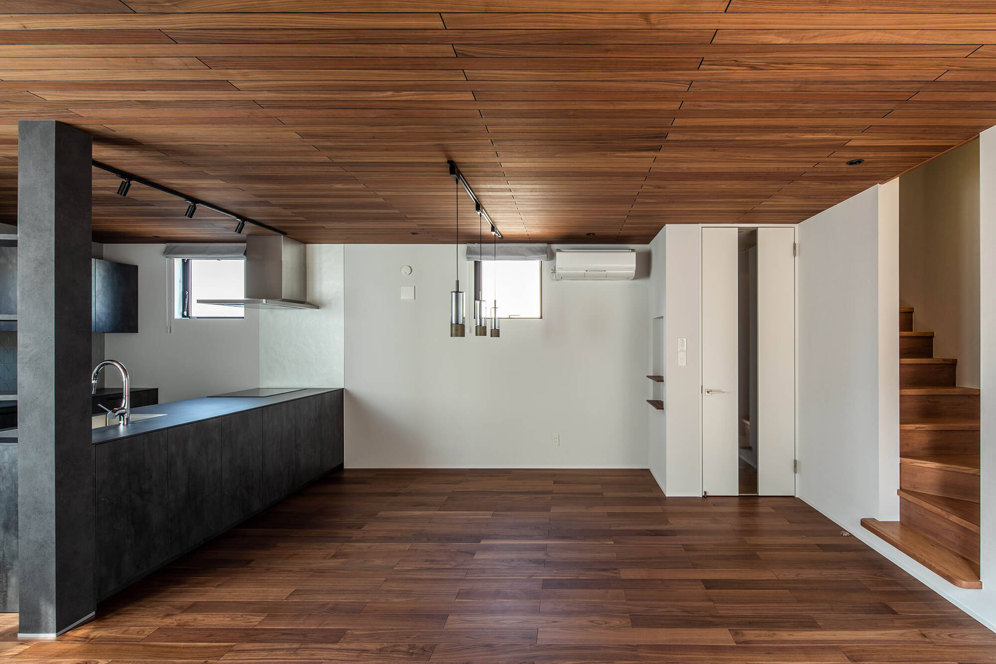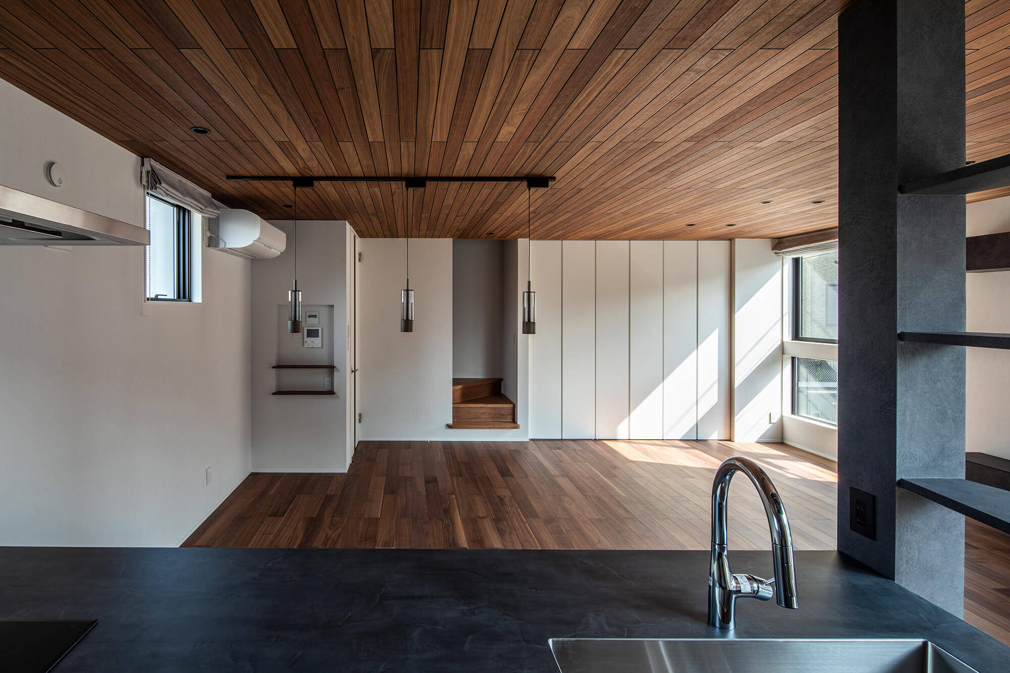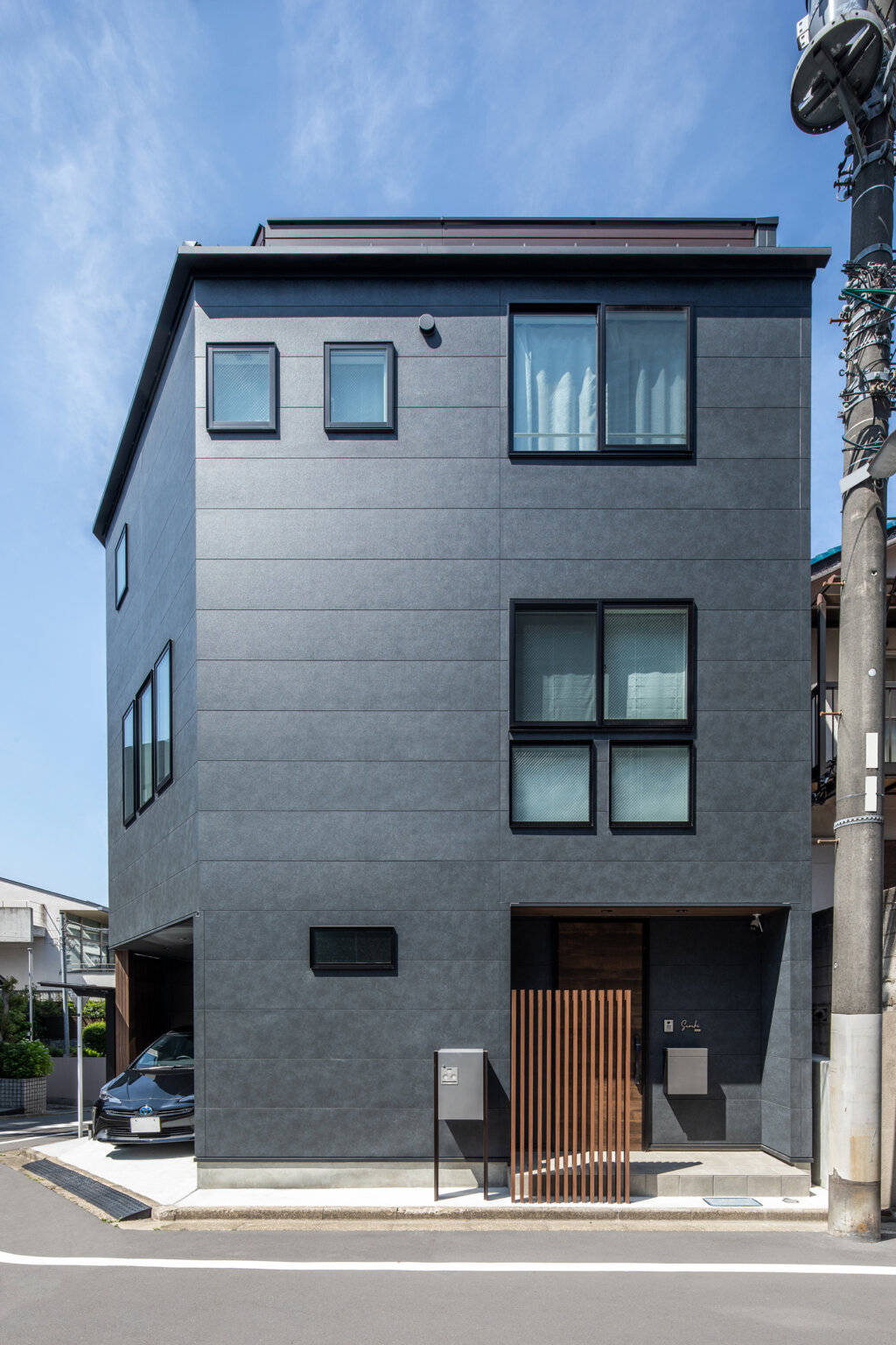 素材感のある黒のサイディングがモダンな住宅です。だんらんの場であるLDKはウォルナットの床と羽目板天井で仕上げ、雰囲気のあるインテリアとしています。LDK以外の室もそれぞれにタイルやクロスを選び個性的な空間としています。木造3階建てのため耐震性に配慮しつつも、敷地を最大限活用する建物配置やLDKの開放性を両立させています。
