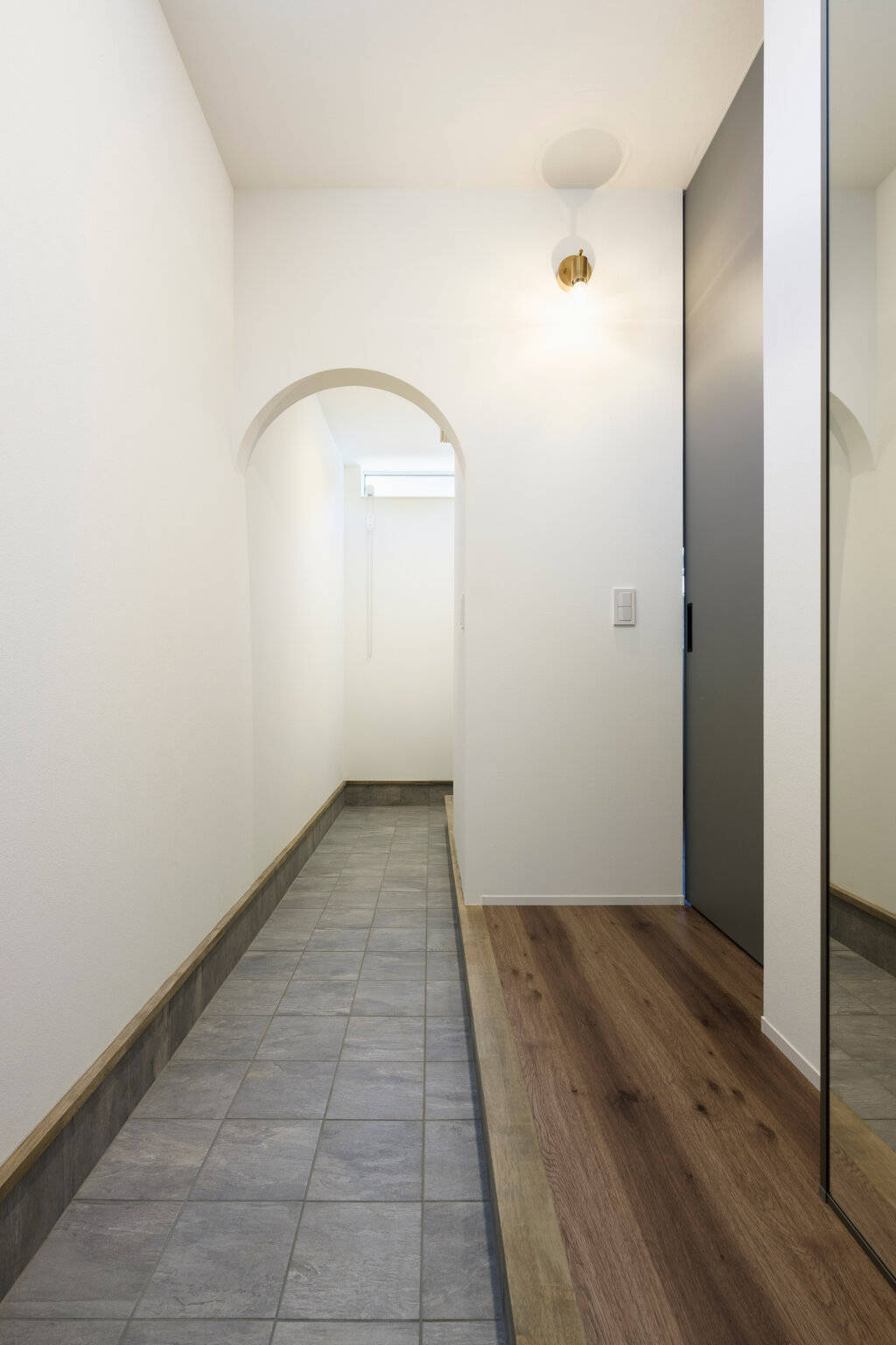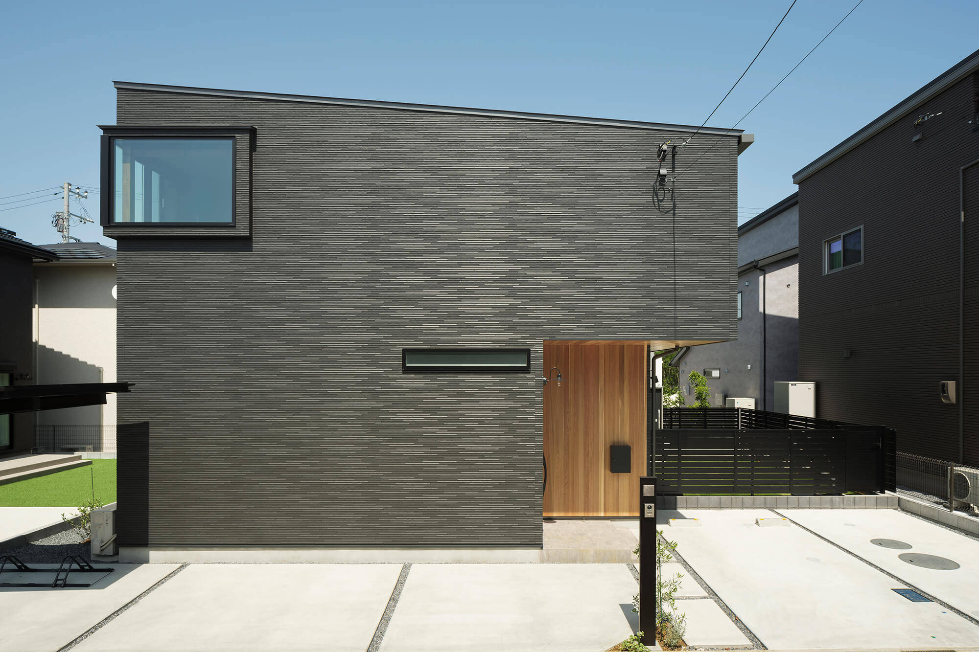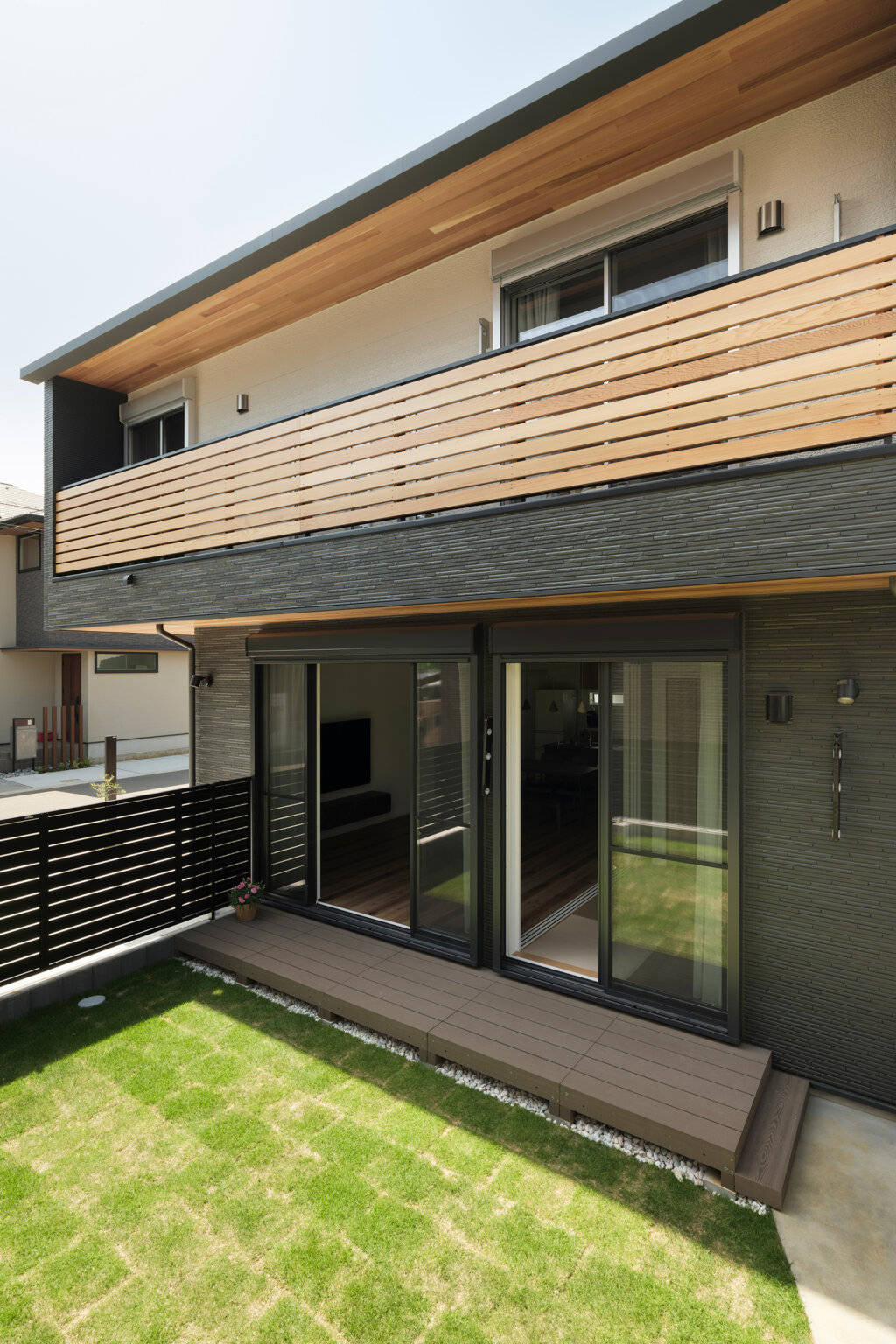 石目調のシンプルな美しい目地レスの外壁材に、レッドシダーのルーバーや羽目板でアクセントを付けた外観の住宅です。インテリアは、木目が特徴的なフローリング、アーチやRの壁の丸みのある造形など遊びのあるデザインで、既製家具と造作を組み合わせることでコストを抑えながら丁寧に作り込んでいます。1階のリビングは縦と横の空間の開放性により、家族が楽しく快適に集まるスペースとなっています。