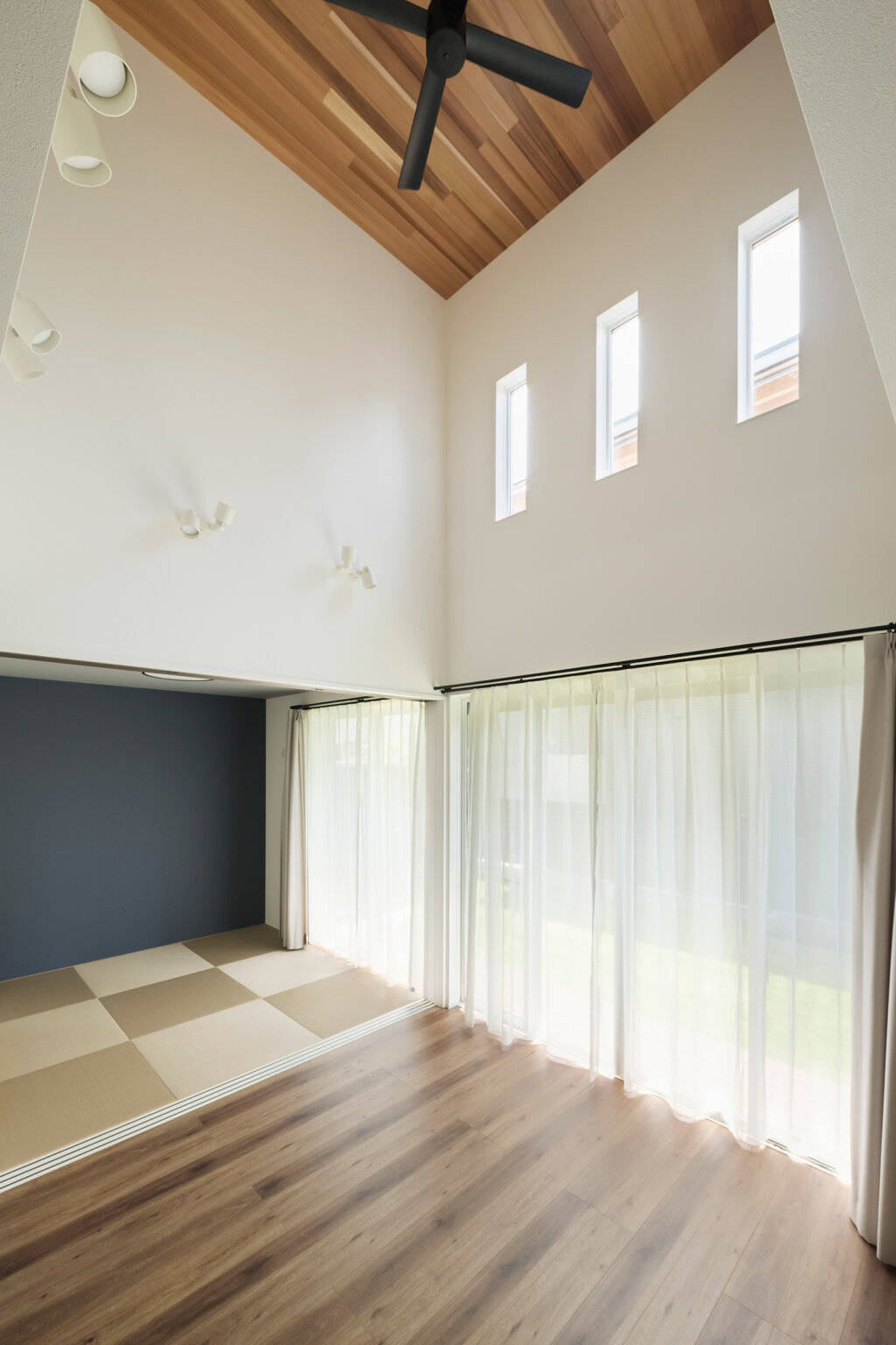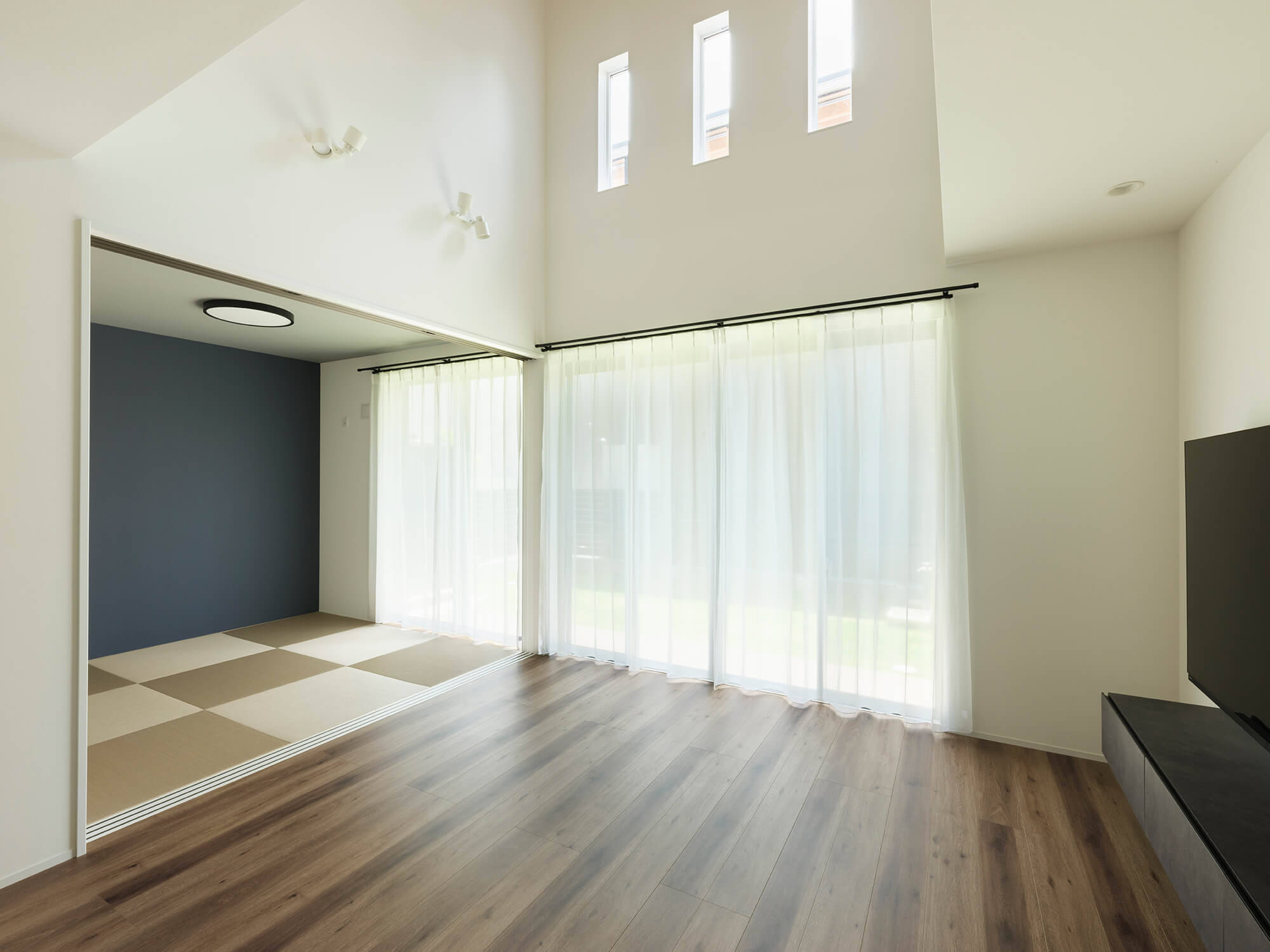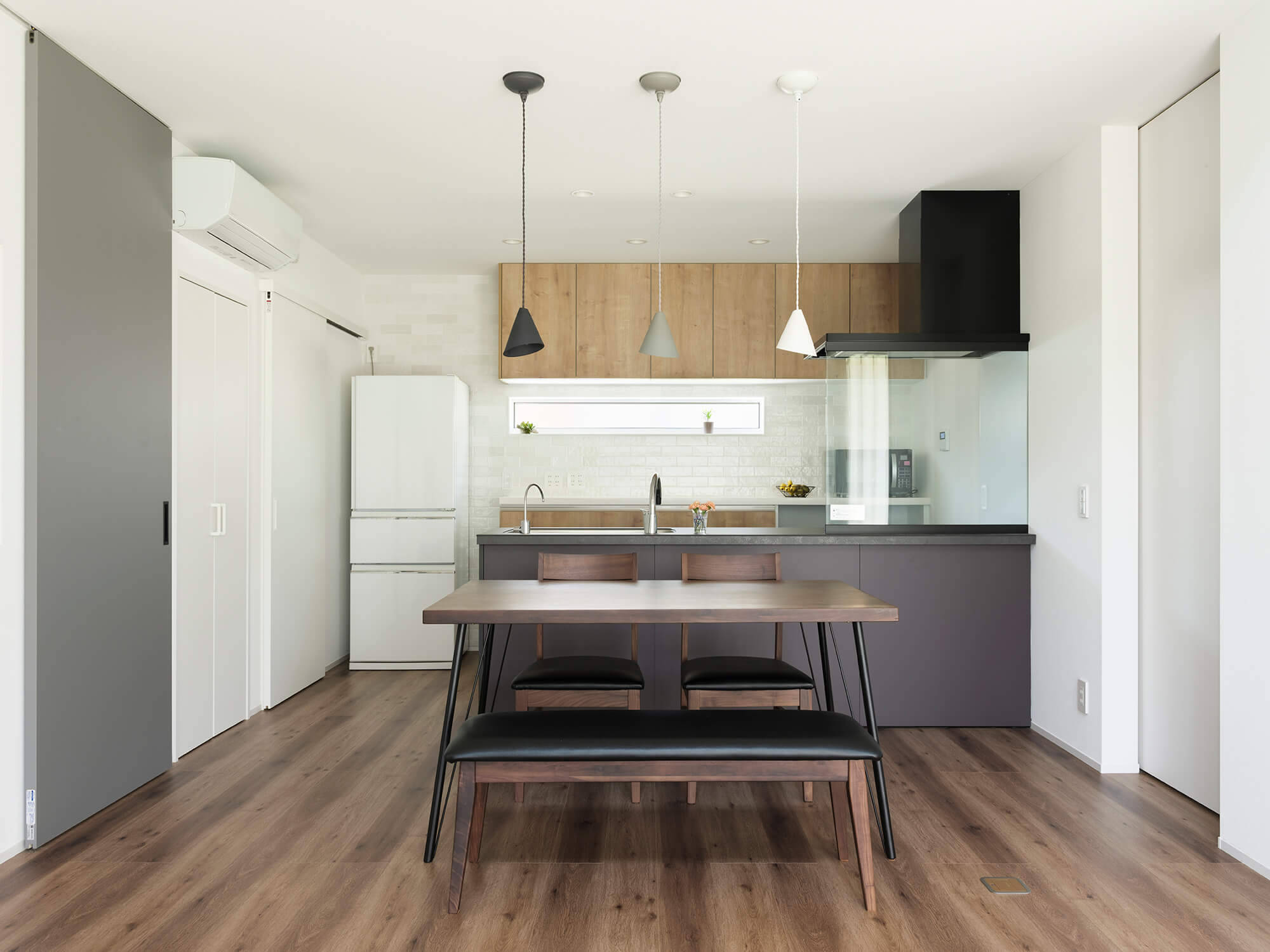 石目調のシンプルな美しい目地レスの外壁材に、レッドシダーのルーバーや羽目板でアクセントを付けた外観の住宅です。インテリアは、木目が特徴的なフローリング、アーチやRの壁の丸みのある造形など遊びのあるデザインで、既製家具と造作を組み合わせることでコストを抑えながら丁寧に作り込んでいます。1階のリビングは縦と横の空間の開放性により、家族が楽しく快適に集まるスペースとなっています。