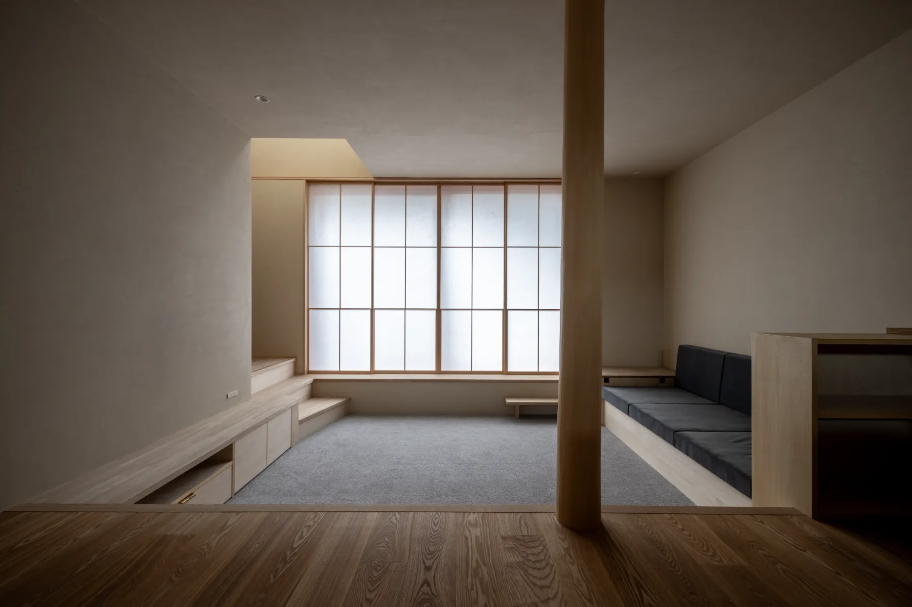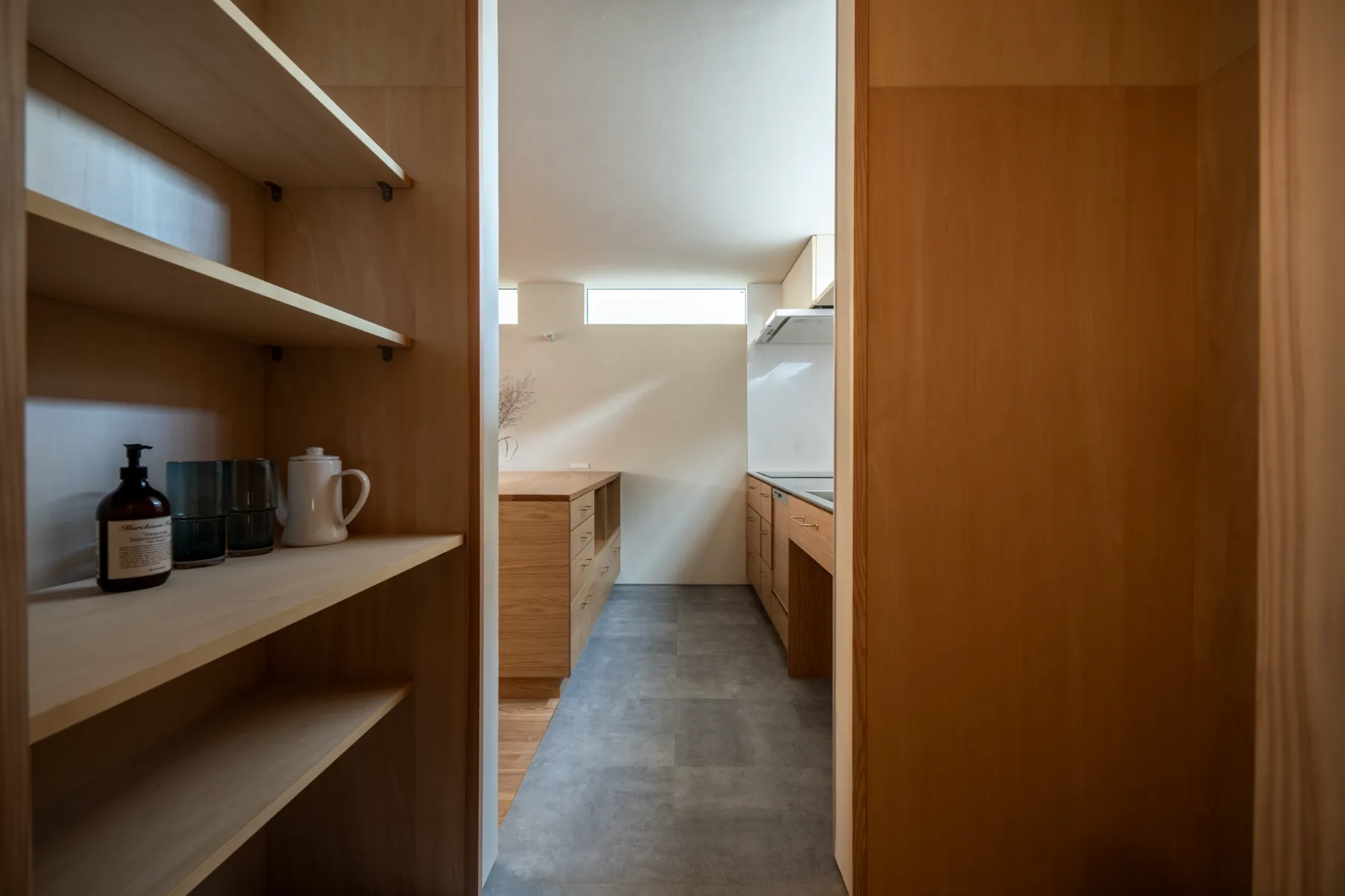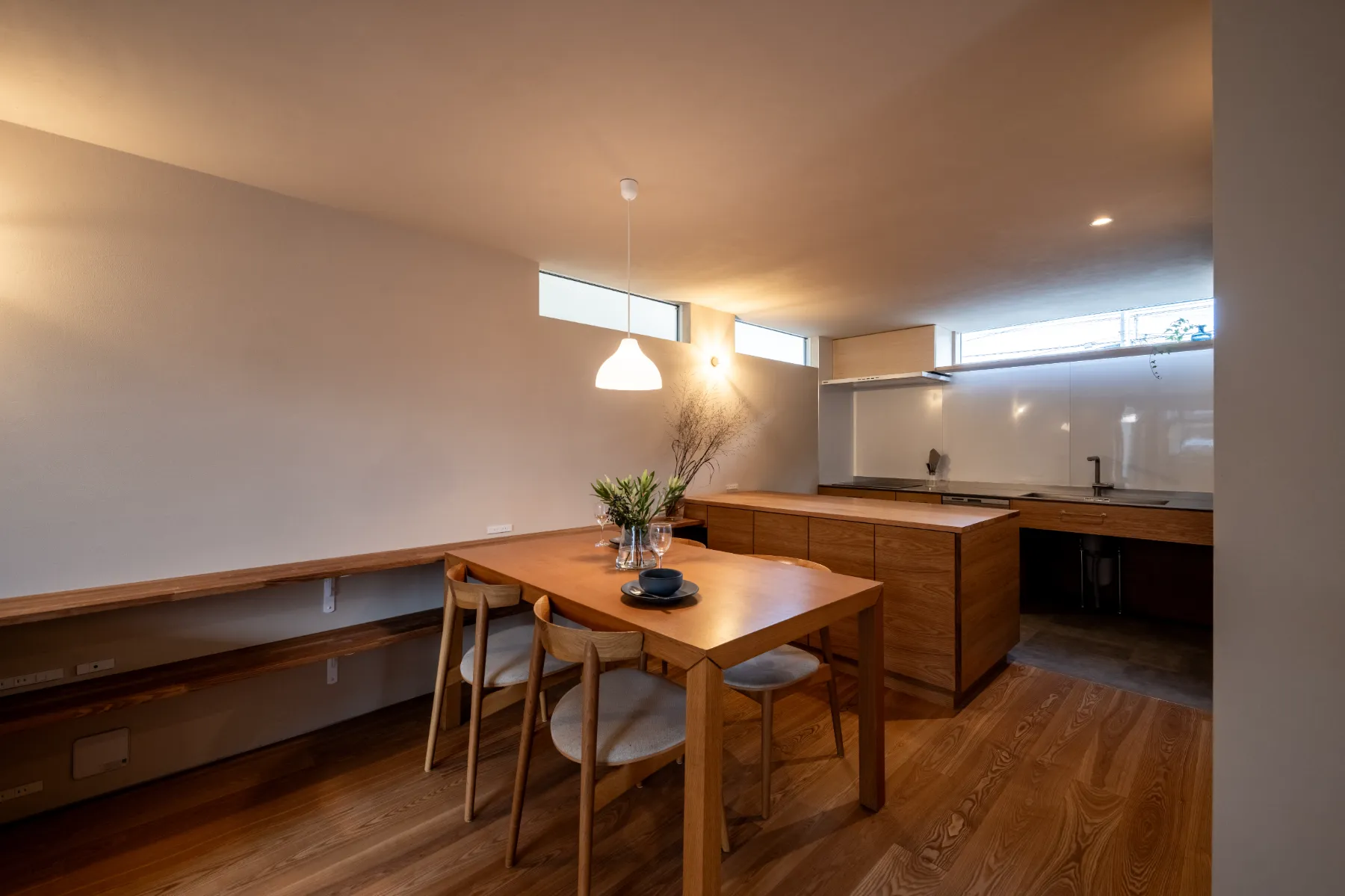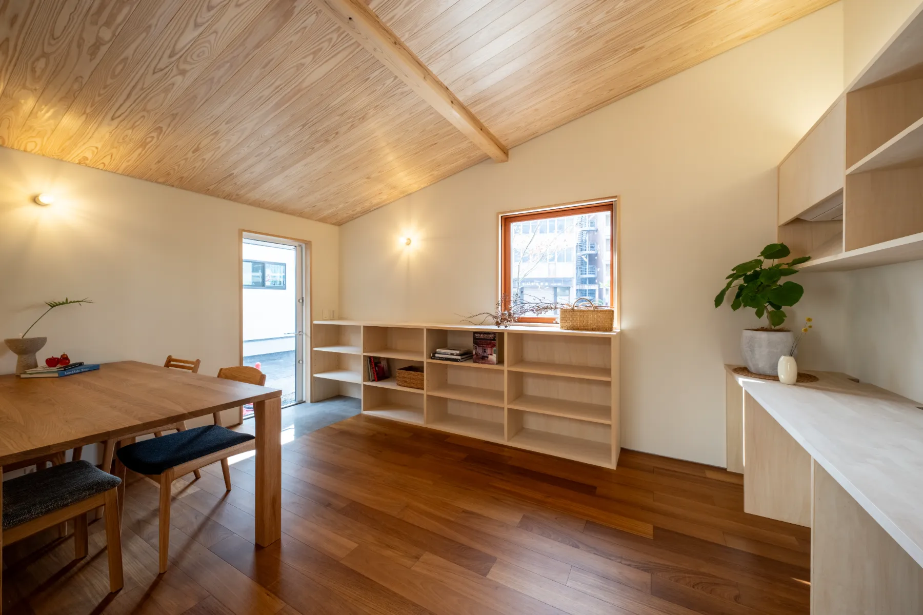 内部空間は細長い敷地を活かし、住宅棟キッチン部より南を眺めると中庭を介して事務所内部まで視線を抜けるようにすることで、開放性を感じられるようにしています。 天井高さは基本的に2.16mと低く設計していますが、随所に天井の高い場所や、床が低い場所をつくることで、「落ち着き」と「開放」の居場所を同じ空間内に共存させています。