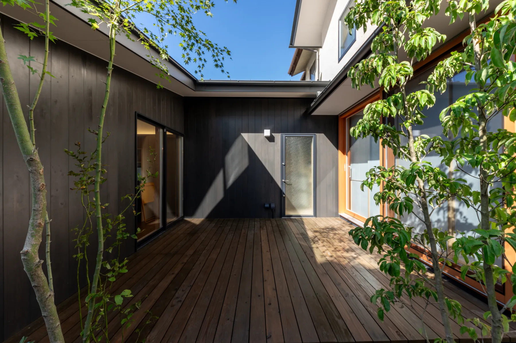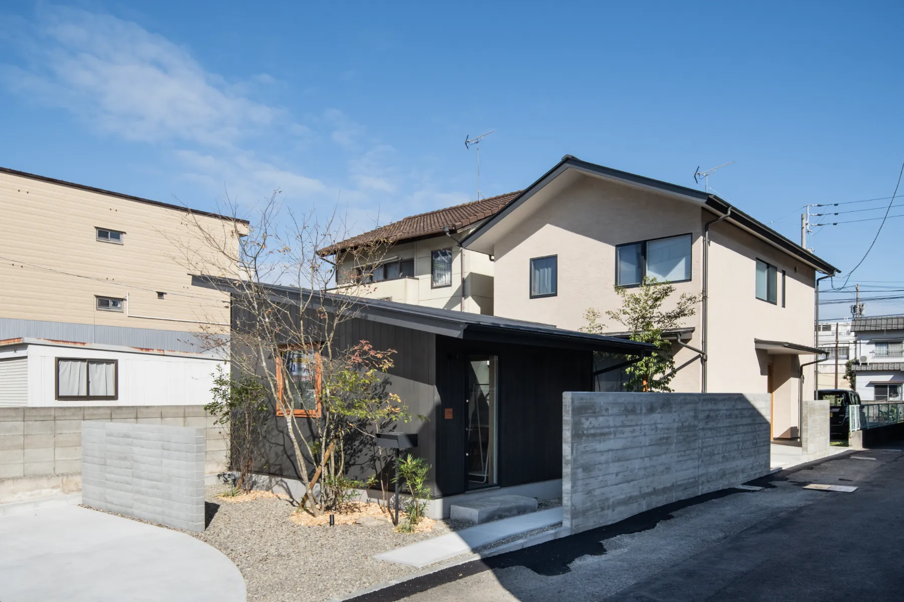 南側の交通量の多い国道に対して騒音及びプライバシーへの配慮が求められましたが、北側の居住スペースまで何層もレイヤー(駐車場,塀,植栽,事務所,中庭)を重ねることで、街なかでも静かに過ごせる空間を確保しています。