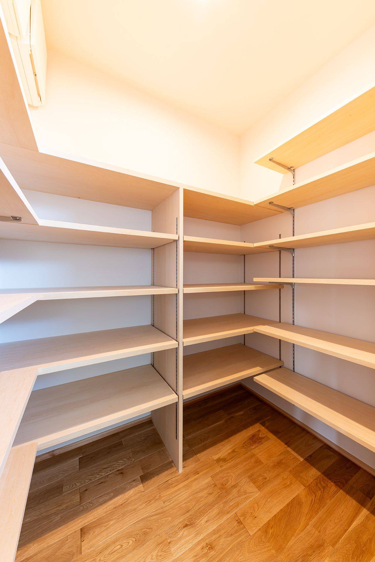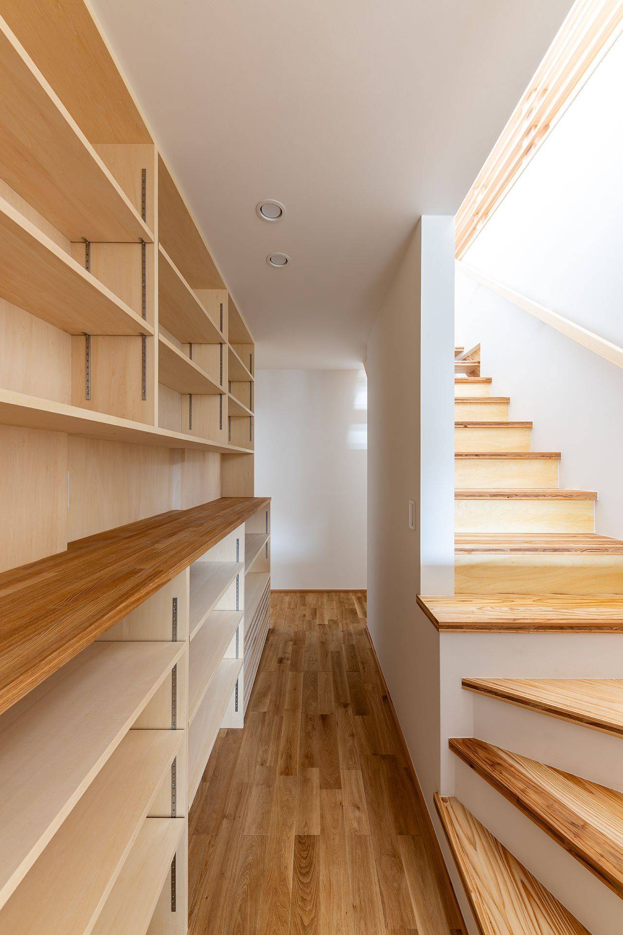 階段室前の壁面収納は書籍、ランドセル、生活雑貨など収納できるスペースがたっぷりと設けられていますが、リビングダイニングの位置の目線からは隠れた場所にあるため、スッキリとした空間に仕上げられています。また階段室まわりが生活動線を考慮した回遊動線になっています。