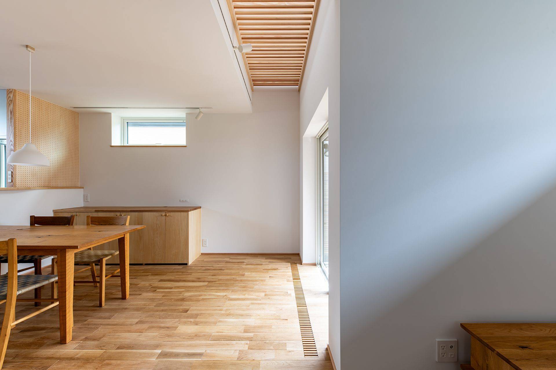 さらに掃き出し窓の上部はルーバー天井になっており、2Fの物干しスペースとして利用できる工夫が施してあります。空調の循環の役割や光が落ちることを意図されているため、木の温もりが相俟って暖かみのある空間となっています。