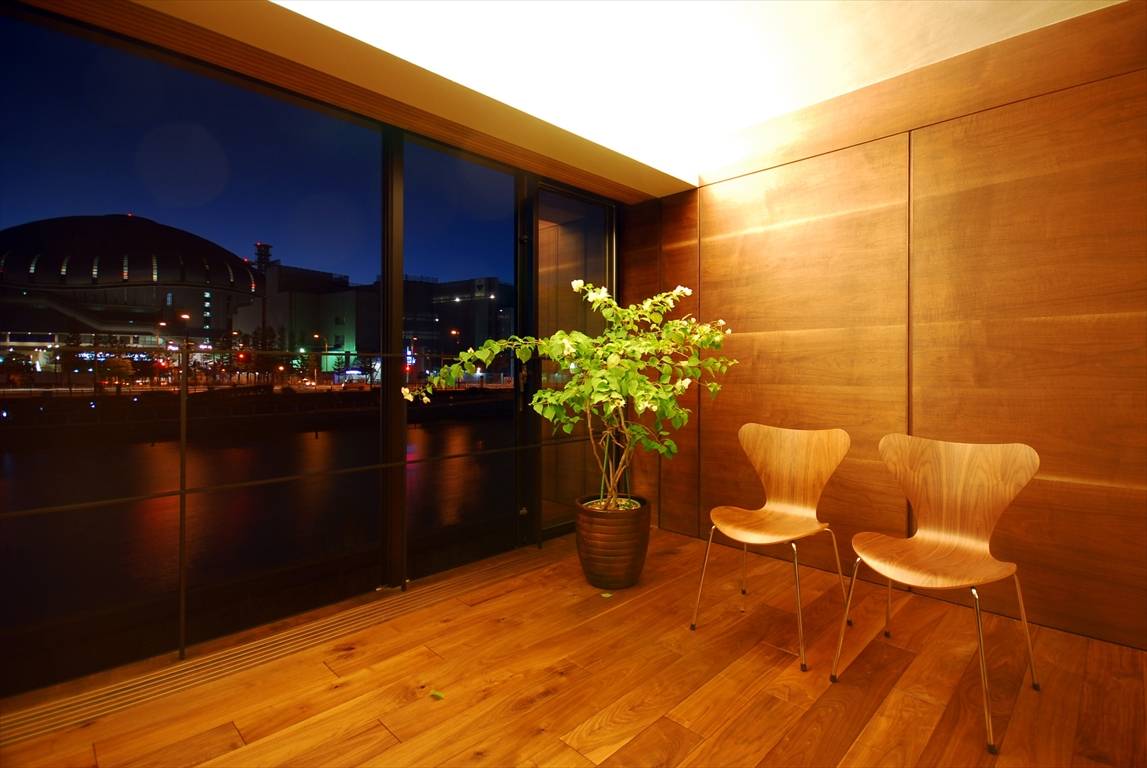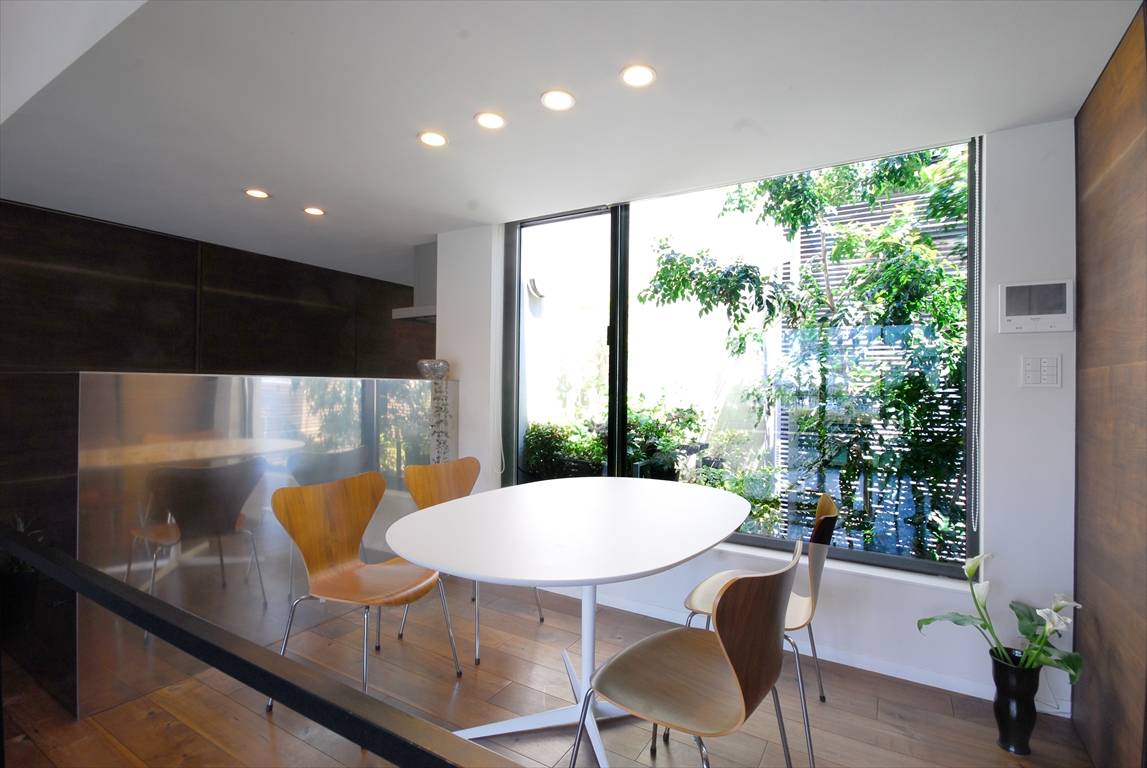 限られた面積しかないため、南北の隣地側は壁面を全て収納スペースとし、東西の道路側と川側のみを開口部としています。