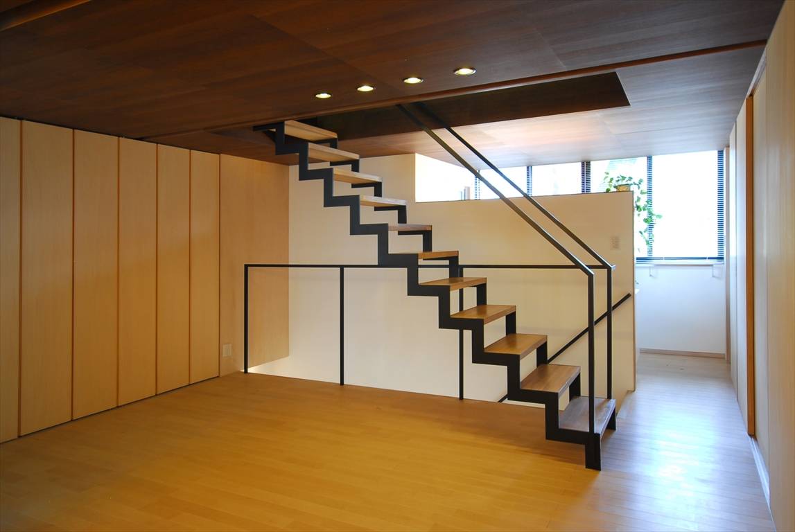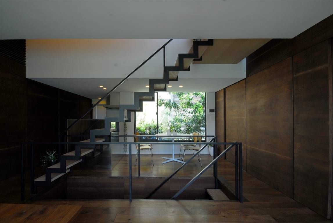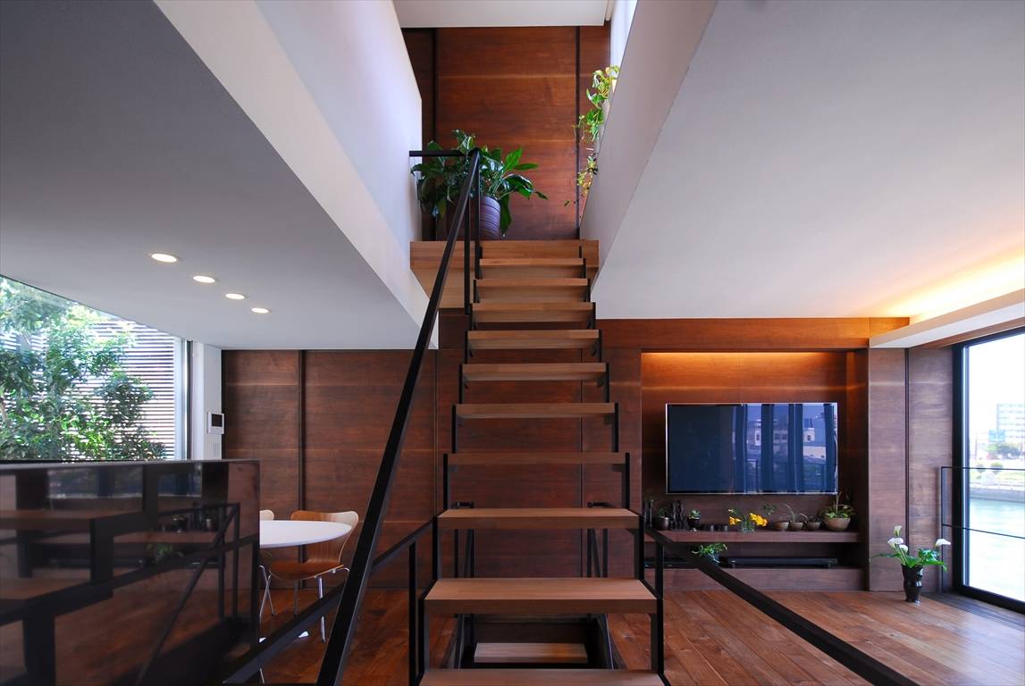 川沿いの狭小敷地に建つ鉄骨住宅。